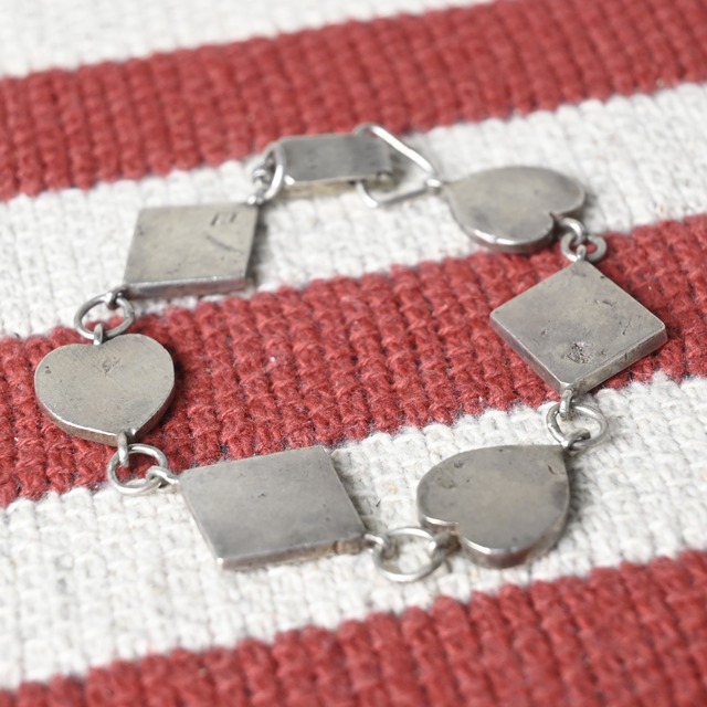 【商品名】 Silver Heart & Diamond Design Bracelet / シルバー ハート&ダイヤデザインブレスレット 【商品説明】 ハートモチーフとダイヤ型プレートを交互に組み合わせた、印象的なデザインのシルバーブレスレットです。 甘さのあるハートモチーフに対して、シャープなダイヤ型パーツを組み合わせることで、可愛らしさと無機質な雰囲気が同居したバランスの良い一本に仕上がっています。フラットなプレート状の造形は光の当たり方で表情が変わり、シンプルながら手元にしっかり存在感を与えてくれます。 チェーンタイプとは異なる連続したモチーフ構成のため、アクセサリー単体でも十分なアクセントになり、Tシャツやシャツ、ニットなど幅広いスタイルに合わせやすいデザインです。 ユニセックスで取り入れやすく、ヴィンテージアクセサリーらしい少しラフな空気感も魅力のひとつです。 【サイズ】 全長 約19.5cm / 各モチーフ 約1.5~2cm前後 【素材】 表記なし(シルバー系メタル) 【カラー】 シルバー 【生産国】 不明 【コンディション】 使用に伴う細かな擦れ、小傷、くすみが見られます。留め具付近に経年による変色が一部ありますが、着用に支障のあるダメージはありません。 [ご購入時の注意事項] 実店舗販売と在庫を共有しておりますため、タイミングにより売り違いとなる場合がございます。 撮影環境により実物と色味が異なる場合がございます。 採寸は手作業のため若干の誤差が生じる場合がございます。 [返品 交換について] USED商品のため返品・交換はお受けしておりません。 気になる点がございましたらご購入前にお問い合わせください。 [発送について] ヤマト運輸またはクリックポストにて、ご注文日から2日以内に発送いたします。