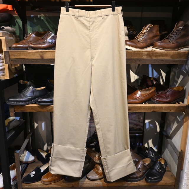 【商品名】 [ W28L32 ] US ARMY 1957年会計 TENNESSEE OVERALL Chino Pants , Khaki / 米軍 チノパンツ カーキ トラウザーズ 【商品説明】 1957年会計、Tennessee Overall Company製のUS ARMYチノトラウザーです。 第二次世界大戦後から1960年代にかけて米軍で広く採用されたコットンツイルトラウザーは、ミリタリーウェアの中でも完成度の高い日常着として現在も高く評価されている一本です。こちらはラベルに「TROUSERS MEN'S, COTTON, UNIFORM TWILL, KHAKI, W/ HIP POCKETS」と入り、1957年10月17日コントラクトの個体。50年代後半らしいオーセンティックなディテールがしっかり残っています。 フロントはボタンフライ仕様、やや深めの股上にゆとりのあるワイドストレートシルエットで、現代のスタイリングにも自然に取り入れやすいバランスです。バックポケットは両玉縁フラップ付きで、クラシックなUS ARMYチノ特有の端正な後ろ姿も魅力。 生地はしっかりとしたコットンユニフォームツイル。穿き込むことで柔らかくなり、色の奥行きやアタリも楽しめるヴィンテージらしい素材感です。ミリタリー由来でありながら、シャツやジャケットと合わせたきれいめな着こなしにも相性が良く、一本あると季節を問わず活躍します。 1950年代オリジナルでW28表記の小さめサイズは流通数も少なく、女性や細身の方にもおすすめできるサイズ感です。 【サイズ】 表記 W28 L32 ウエスト 約36cm/股上 約30cm/股下 約78cm/わたり幅 約30cm/裾幅 約25cm 【素材】 コットン100%(Uniform Twill) 【カラー】 ベージュ 【生産国】 USA 【コンディション】 全体に年代相応の使用感があります。背面ヒップ付近、裾まわりに薄い汚れが見られますが、着用に支障のあるダメージはなく、生地もしっかりしています。ヴィンテージUS ARMYチノらしい自然な経年変化として楽しんでいただけるコンディションです。 [ご購入時の注意事項] 実店舗でも販売しておりますため、タイミングによっては在庫切れとなる場合がございます。 また、撮影環境により実物と色味が若干異なる場合がございます。サイズは平置き採寸のため多少の誤差がございます。 [返品 交換について] USED商品のため返品・交換はお受けしておりません。 気になる点がございましたら、ご購入前にお気軽にお問い合わせください。 [発送について] ヤマト運輸またはクリックポストにて、ご注文日から2日以内に発送いたします。