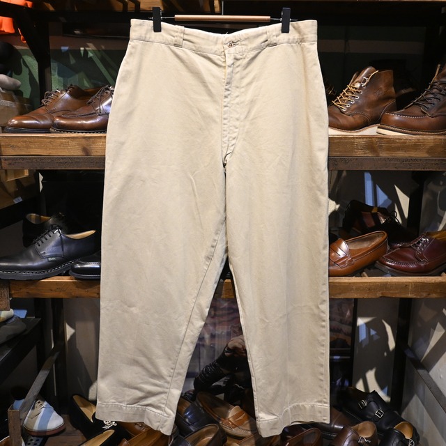 【商品名】 [ W30L25 ] US ARMY 30-40s Jodhpurs Pants , Beige / 米軍 ジョッパーズパンツ ベージュ 【商品説明】 1930〜40年代頃のUS ARMYジョッパーズパンツです。 乗馬用ユニフォームとして採用されていたジョッパーズパンツは、当時の騎兵隊やオフィサー向け装備に見られる独特なシルエットが魅力で、腰から腿にかけて大きく膨らみ、膝下から裾へ強く絞り込まれる構造になっています。現代のミリタリーパンツとは明確に異なる立体的なフォルムで、ヴィンテージらしい存在感が際立つ一本です。 フロントはボタンフライ仕様。膝部分には可動域を確保する補強切り替えと細かなステッチワークが入り、裾にはアイレット付きレースアップ仕様を採用。ブーツに合わせて締め込む本来の用途がしっかり残っており、この年代ならではのクラシックな軍装備の雰囲気を楽しめます。 生地はしっかりとしたコットンツイルで、30〜40年代らしい密度感のある古い生地。着用を重ねたことで硬さがほどよく抜け、自然な柔らかさと落ち感が出ています。色味はやや黄味を帯びたベージュで、シャツやジャケットと合わせても重たくならず、古いワーク・ミリタリースタイルとも非常に相性の良いカラーです。 こちらはW30程度の比較的取り入れやすいサイズ感で、レースアップや膝切り替えもきれいに残っており、資料的価値も含めて魅力のある個体です。現存数の少ないUS ARMY初期ミリタリーパンツとしておすすめです。 【サイズ】 表記 W30 L25 ウエスト 約38cm/股上 約30cm/股下 約61cm/わたり幅 約34cm/裾幅 約13cm(レース調整可) 【素材】 コットンツイル 【カラー】 ベージュ 【生産国】 USA 【コンディション】 全体に年代相応の使用感があります。薄い汚れや軽いアタリ、内側に保管時の色移りが見られますが、大きな破れや着用に支障のあるダメージはありません。右バックポケット上にラベル跡があります。年代を考慮すると全体として良好な状態です。 [ご購入時の注意事項] 実店舗販売との在庫連動のため、ご注文のタイミングによっては在庫切れとなる場合がございます。 撮影環境により実物と色味が若干異なる場合がございます。サイズは平置き採寸のため多少の誤差がございます。 [返品 交換について] USED商品のため返品・交換はお受けしておりません。 気になる点がございましたらご購入前にお問い合わせください。 [発送について] ヤマト運輸またはクリックポストにて、ご注文日から2日以内に発送いたします。