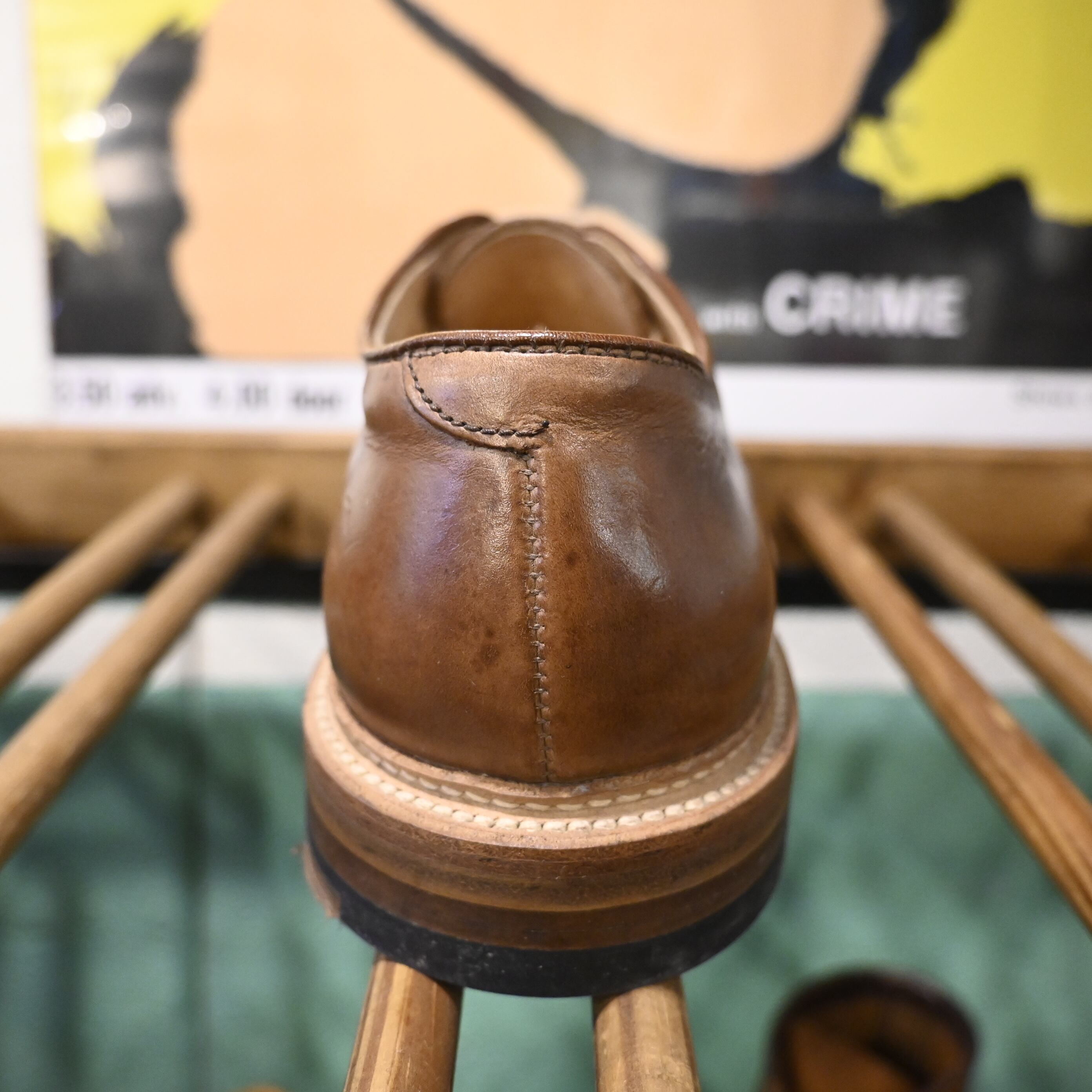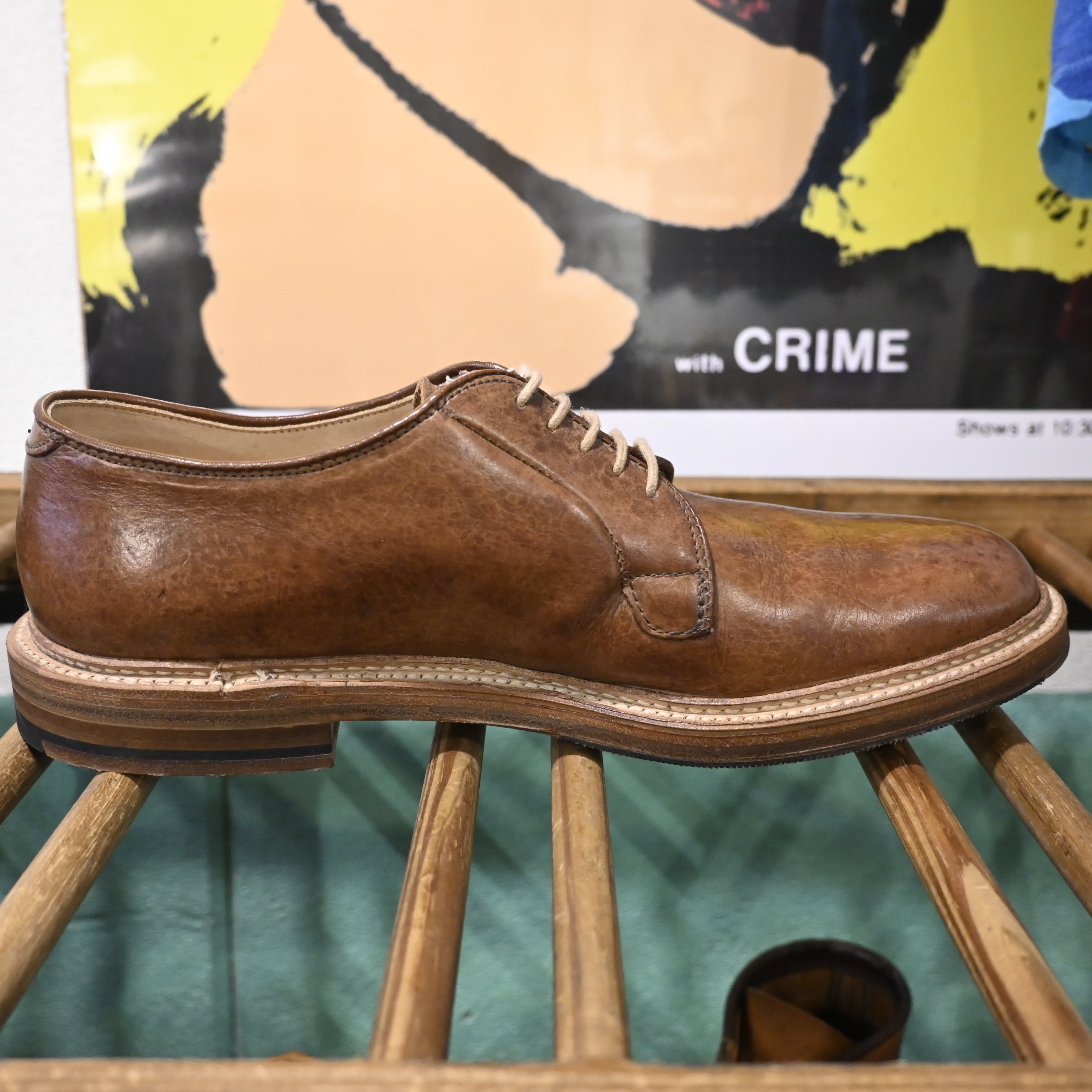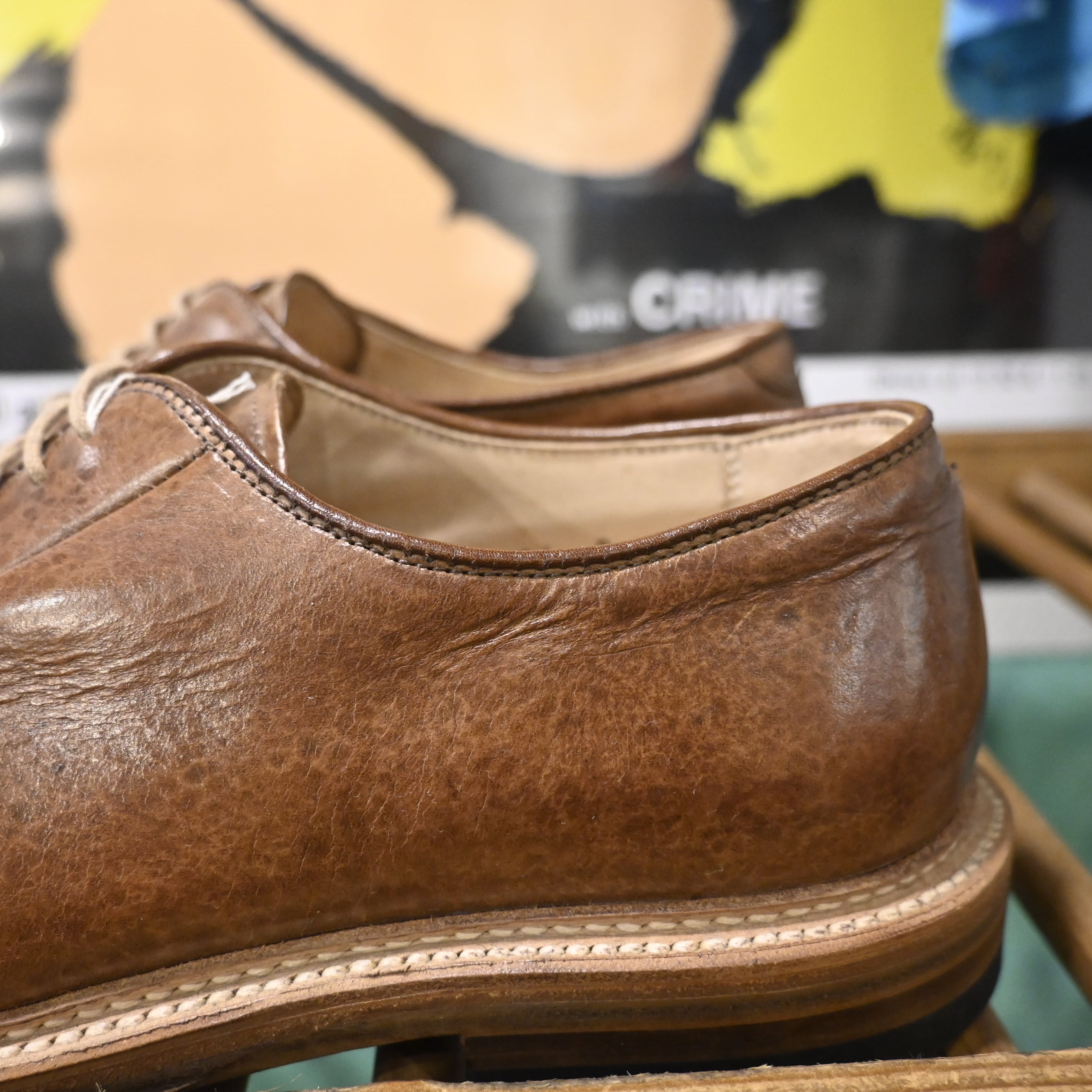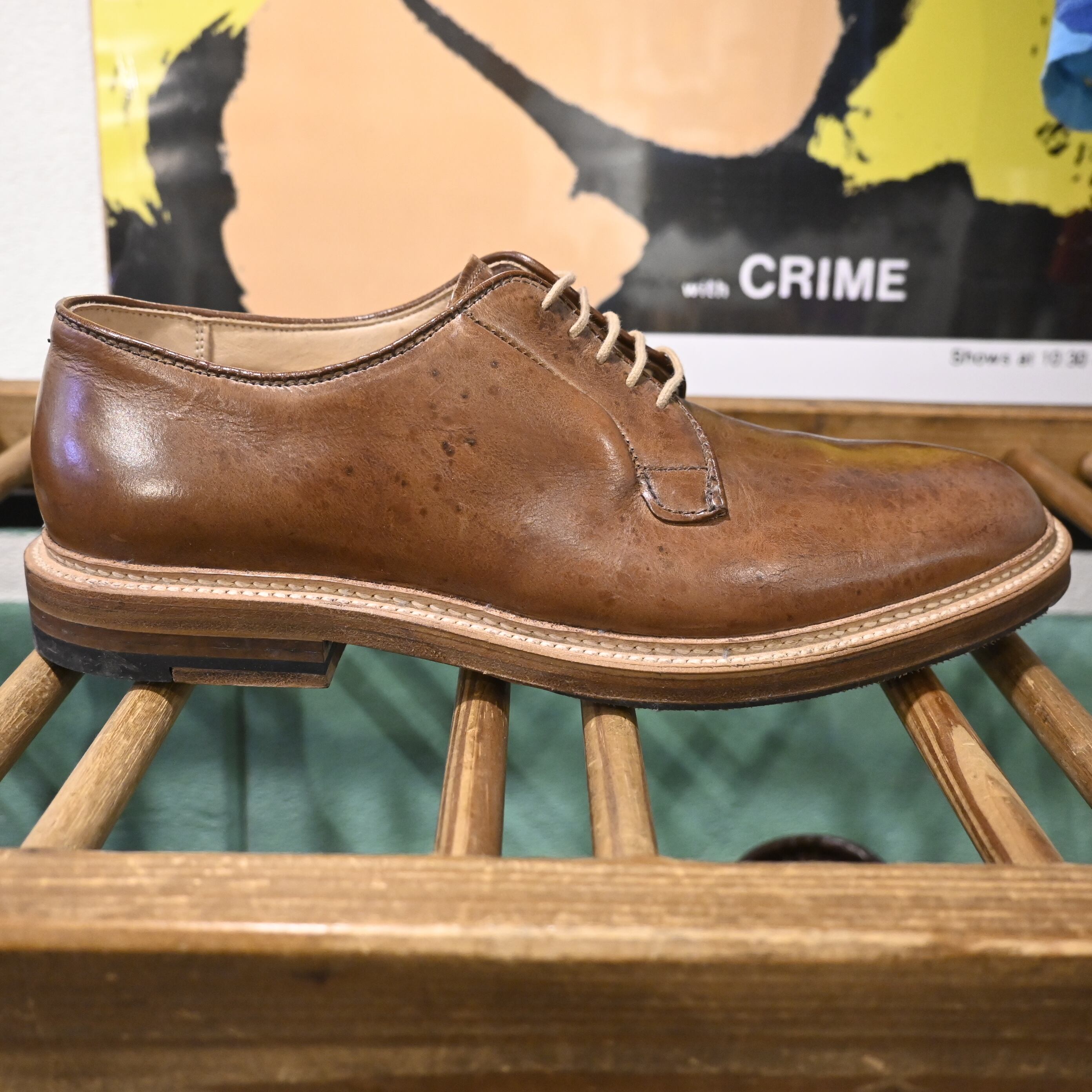 上質なレザーの風合いが魅力のヴィンテージプレーントゥシューズ。程よく経年変化したブラウンカラーが深みを持ち、クラシックながらもどこか無骨な表情が印象的です。