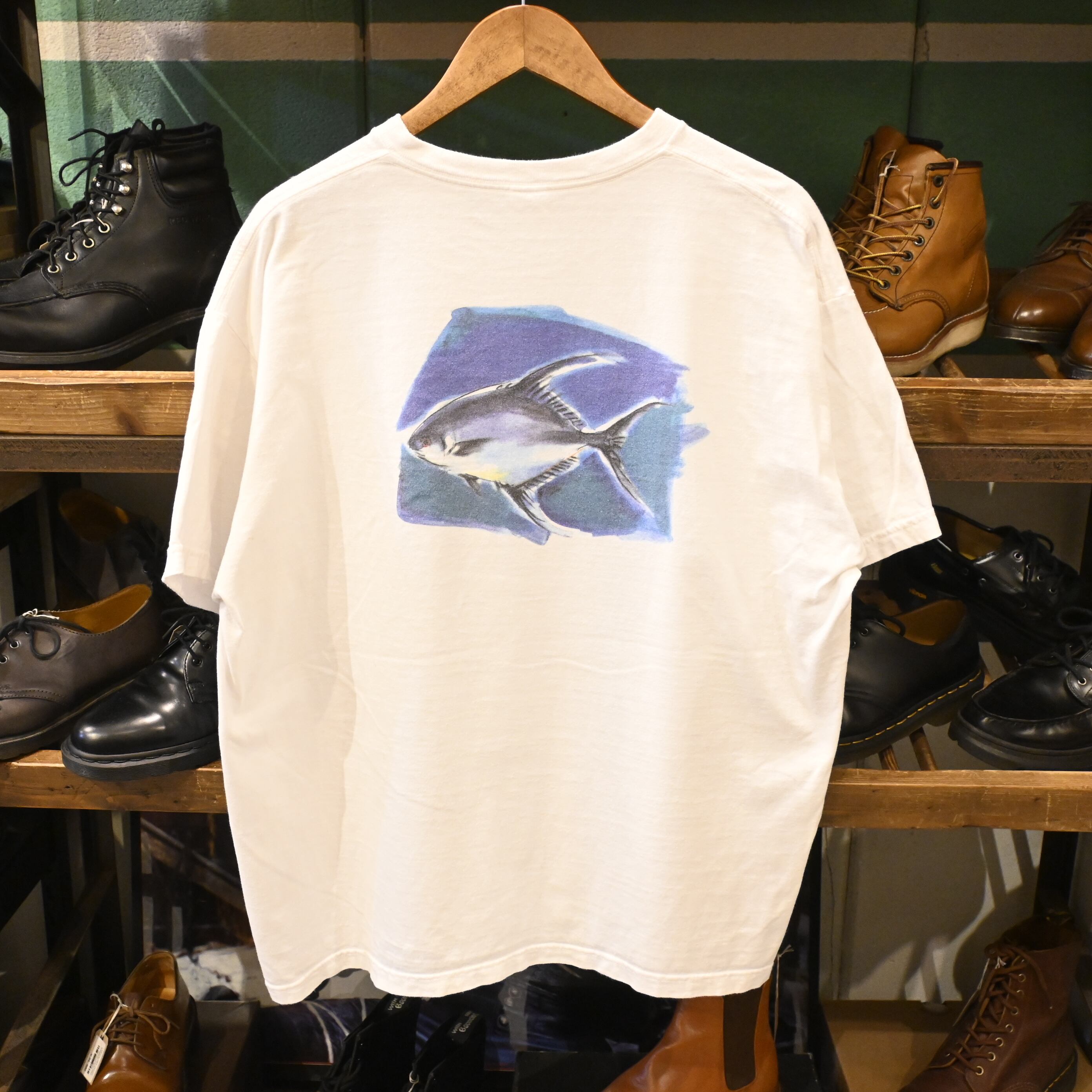 パタゴニアのヴィンテージプリントTシャツです。フロントには魚型のPatagoniaロゴ、背面には水彩風タッチで描かれたリアルな魚のプリントが大きく入っています。