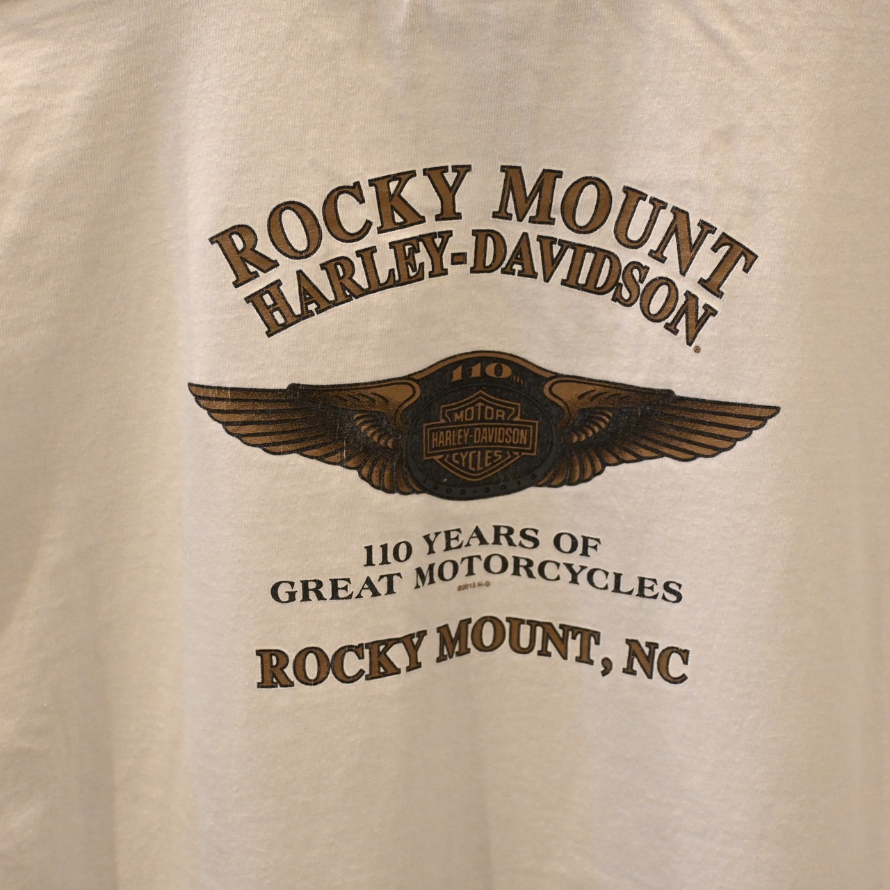 ハーレーダビッドソン、ヴィンテージTシャツ、両面プリント、アメカジ、ホワイトTシャツ、バイカーTシャツ、2010年代、ロッキーマウント、メンズ古着、白T、バーアンドシールド、110周年記念