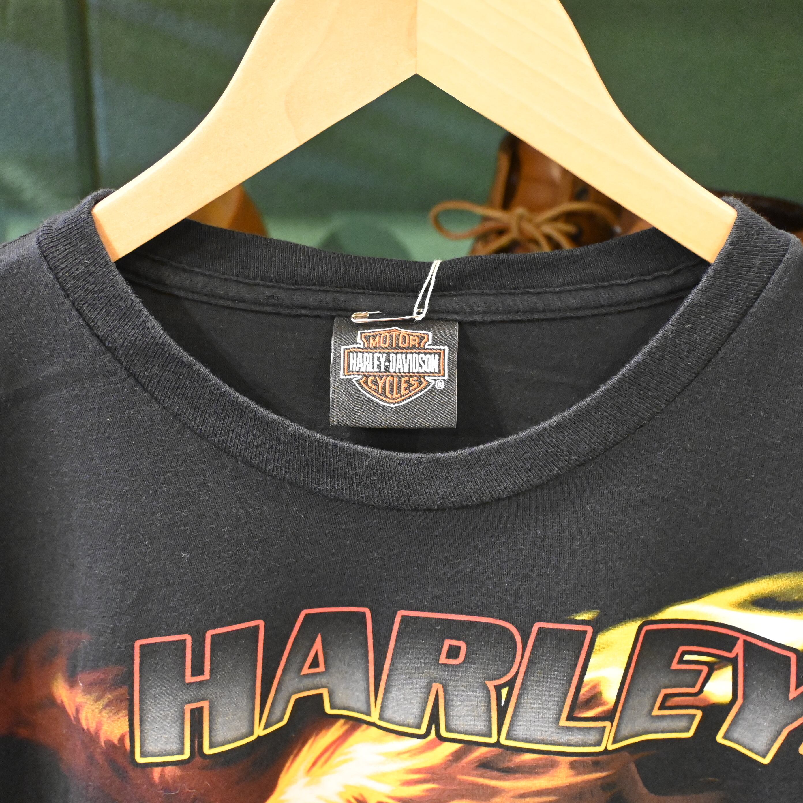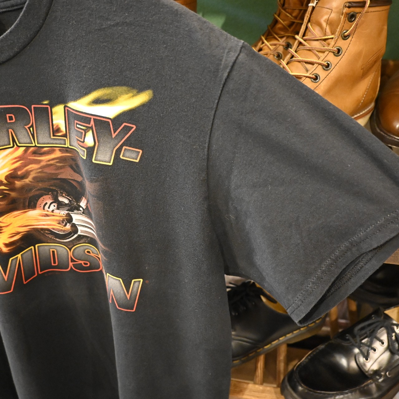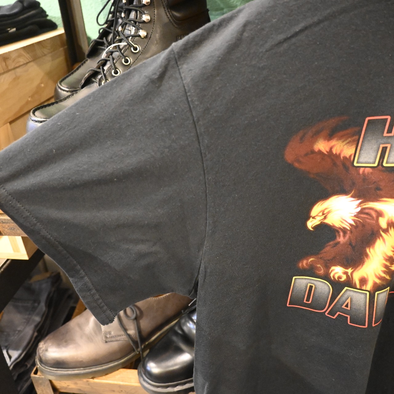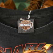 両面プリントながらもボディはオールブラックで引き締まった印象。タグは刺繍入りのHarley-Davidsonオフィシャル。ヴィンテージTシャツの中でも、重厚感とストーリー性を併せ持つ一着です。