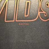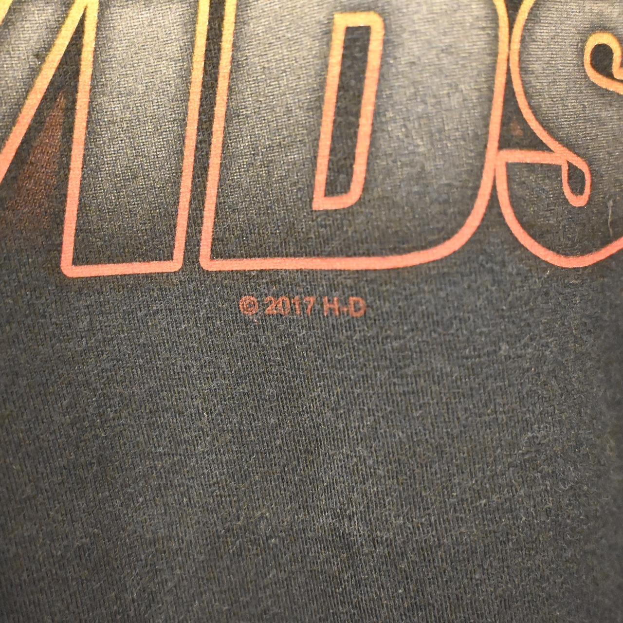 フロントには炎をまとったイーグルとバイクの融合を描いた2017年コピーライト入りのグラフィック。バックには「BLACK WOLF HARLEY-DAVIDSON(BRISTOL, VA)」の名を冠したウルフ&ライダーの迫力あるイラスト入り(2009年プリント)。