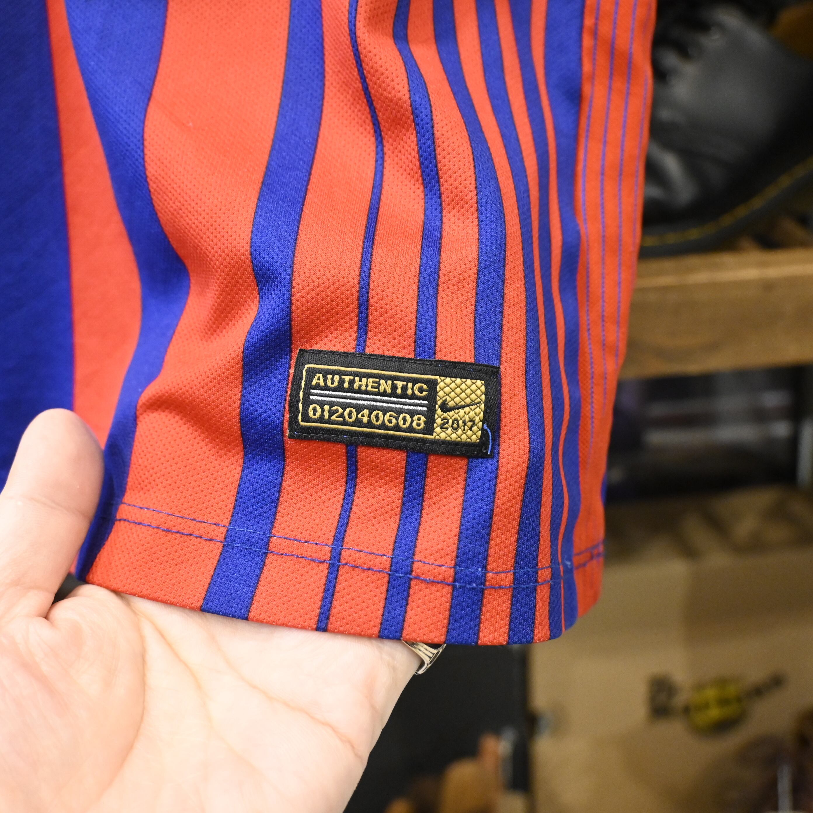 2017-18シーズンのFCバルセロナ、リオネル・メッシ選手の背番号10を配したオーセンティック仕様のホームユニフォーム。NIKEの「AEROSWIFT」テクノロジーを採用した選手支給モデルで、通気性と軽量性に優れた設計。胸元にはRakuten、右袖にはLaLigaパッチ、左袖にはbekoのスポンサーロゴがプリントされています。背面にはM-E-S-S-Iのネームと象徴的なNo.10が入っており、ファンにとってはコレクション価値の高い一枚です。