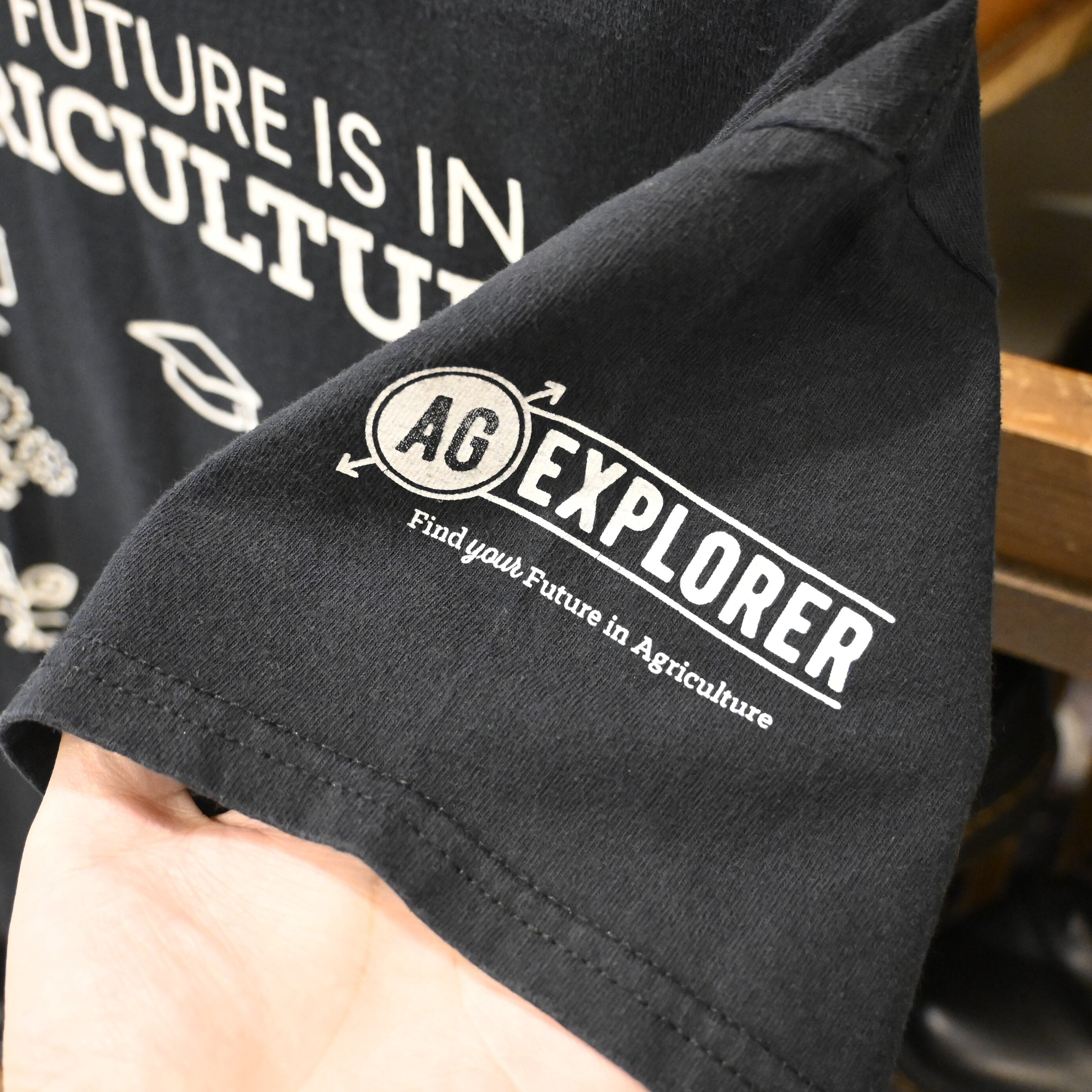 バックにはFFAのクラシックなロゴを大判で配置し、フロントには「MY FUTURE IS IN AGRICULTURE!」のメッセージと農業・教育・環境などを象徴するアイコンが整然と並ぶデザイン。袖には「AgExplorer」のロゴ入りで、農業分野でのキャリア促進をテーマにした一枚です。