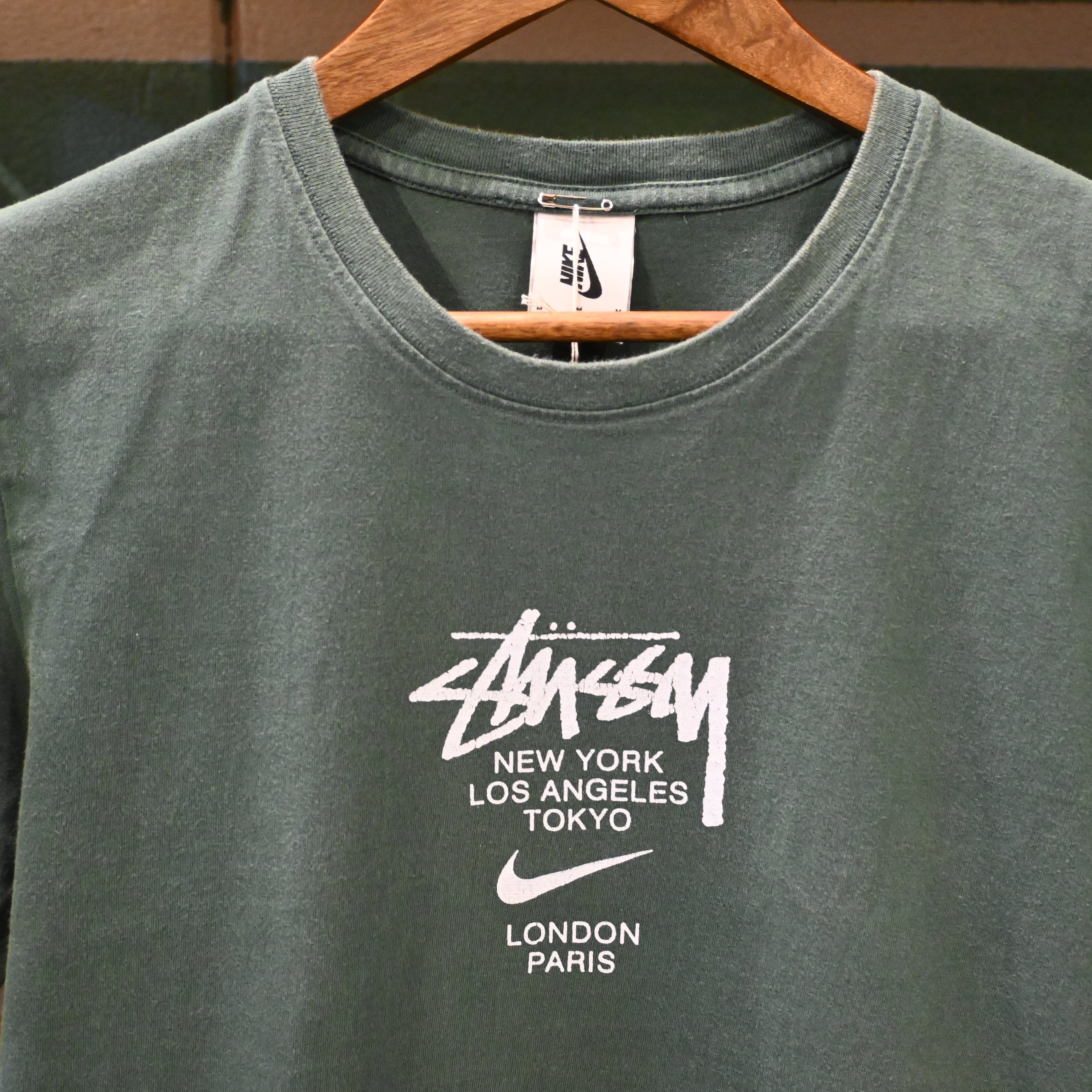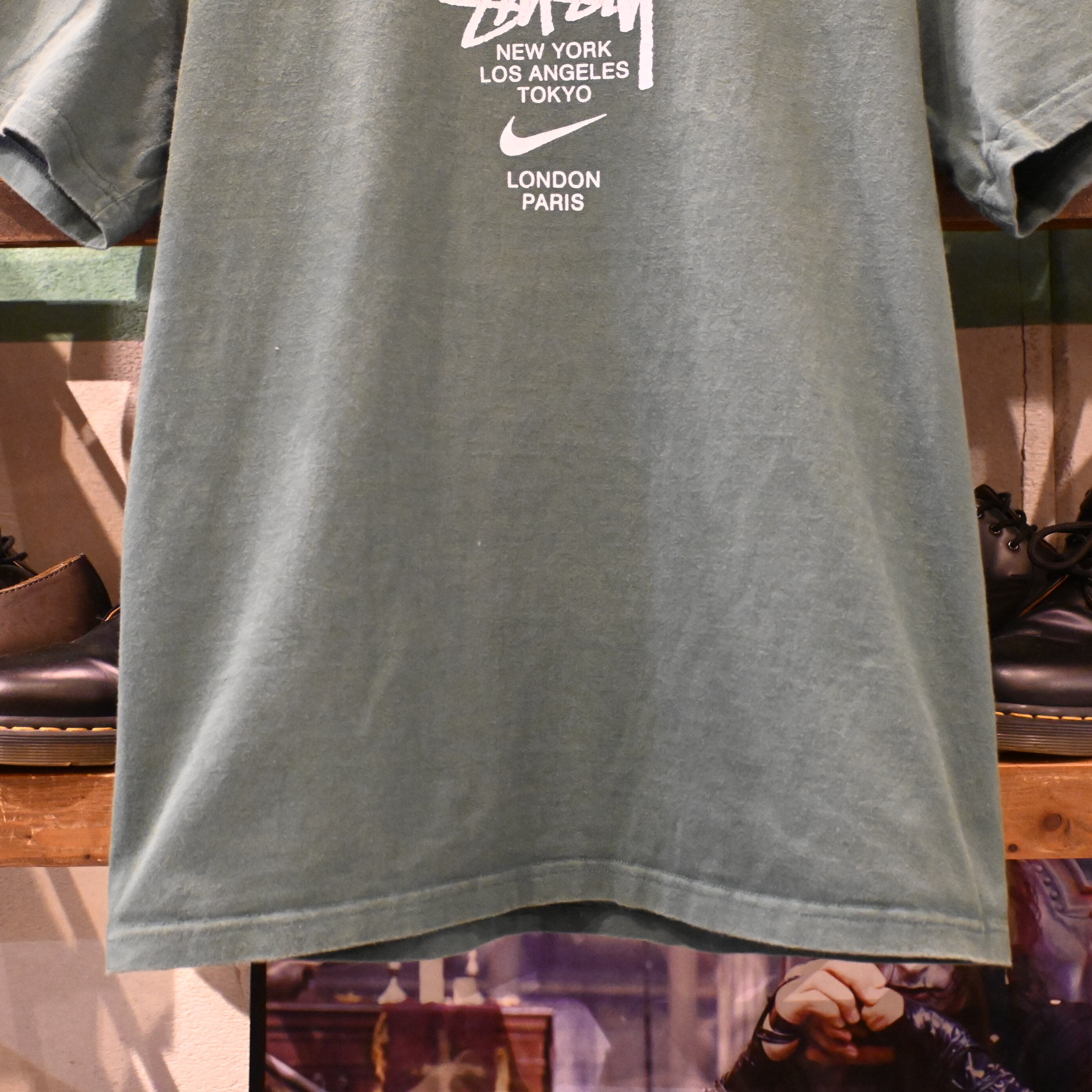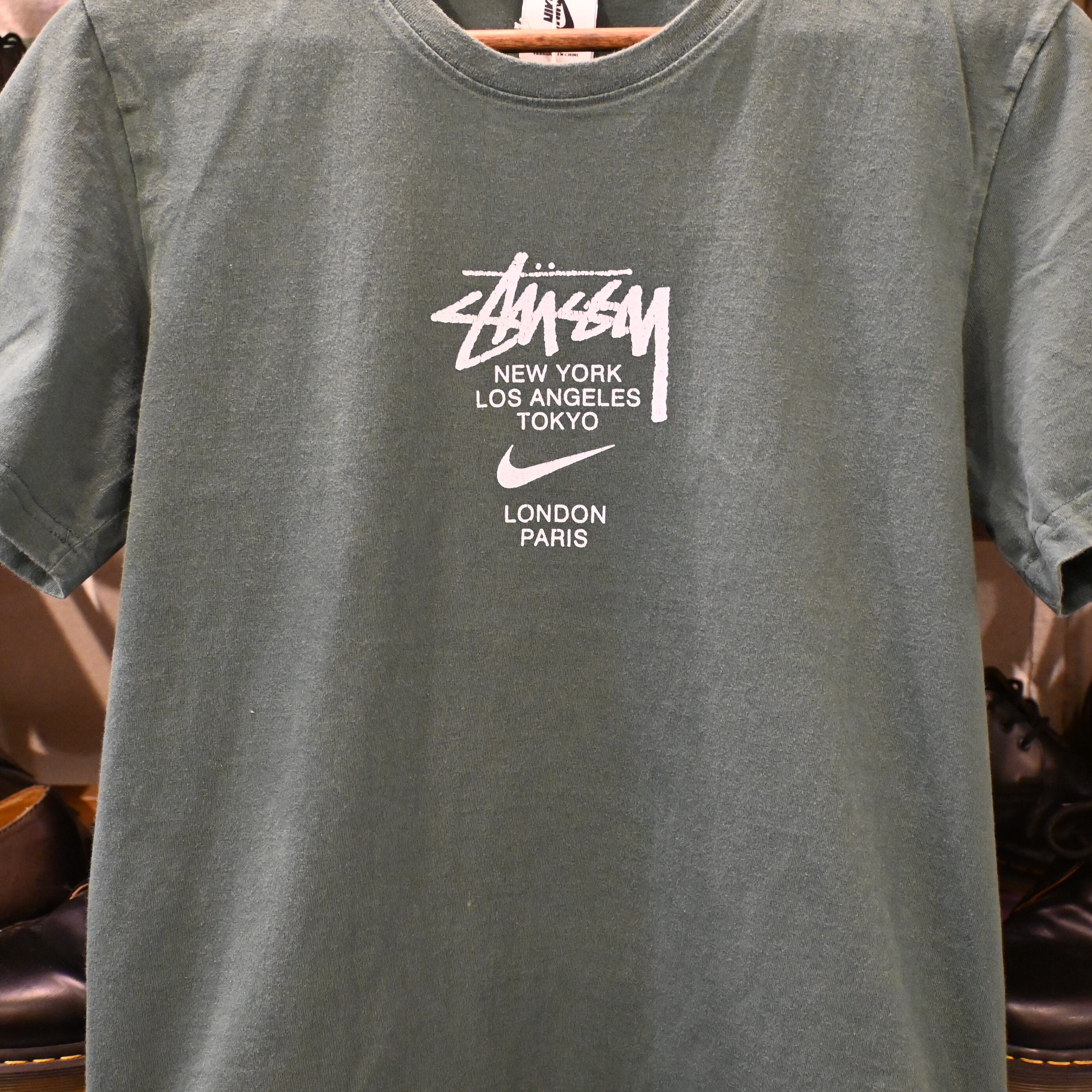 「NEW YORK」「LOS ANGELES」「TOKYO」「LONDON」「PARIS」の5都市名が並び、Stüssyらしいフォントとアイコニックな配置が映えるグラフィック。ボディはNIKEタグ付きで、ややフェードがかったグリーン系カラーがヴィンテージライクな雰囲気を演出しています。