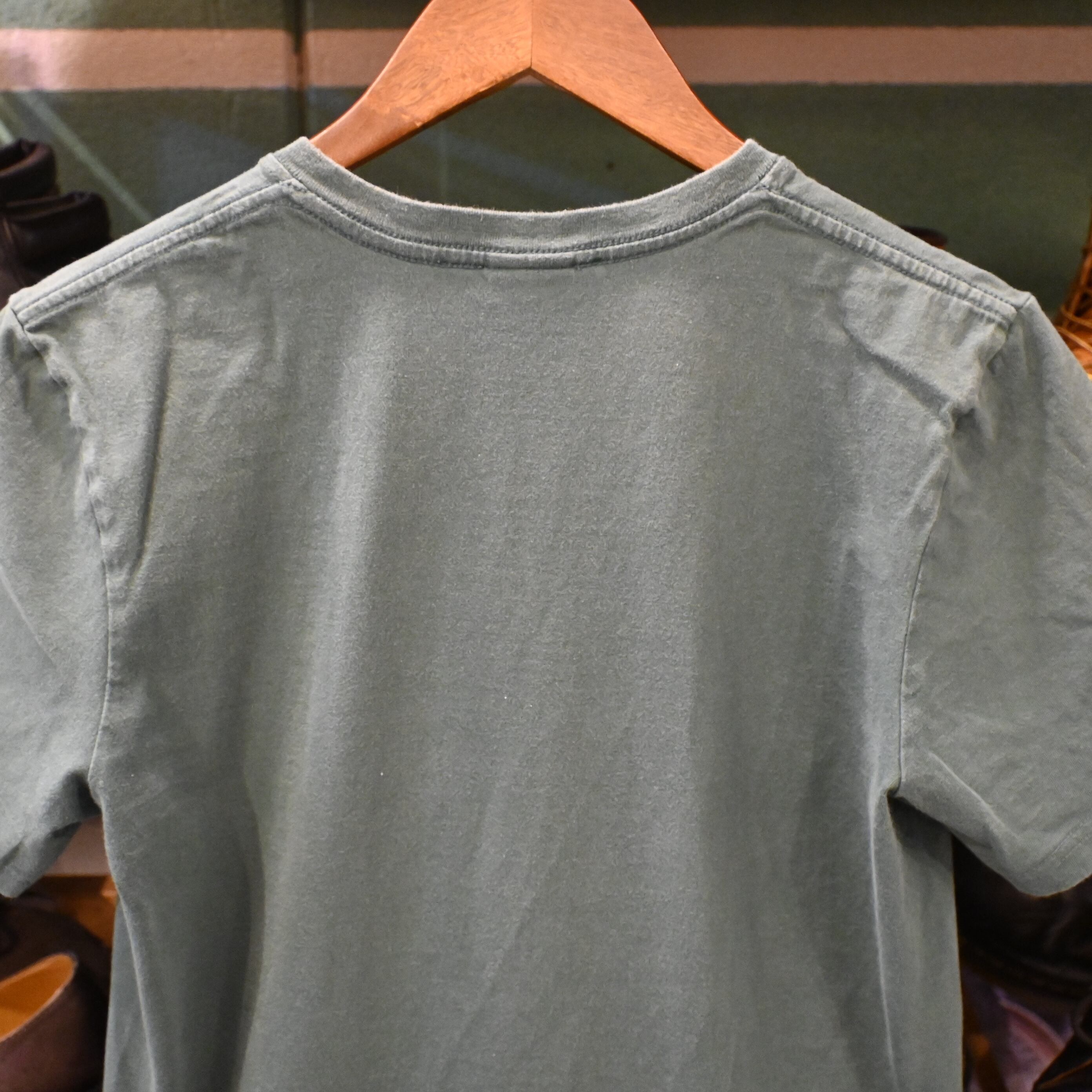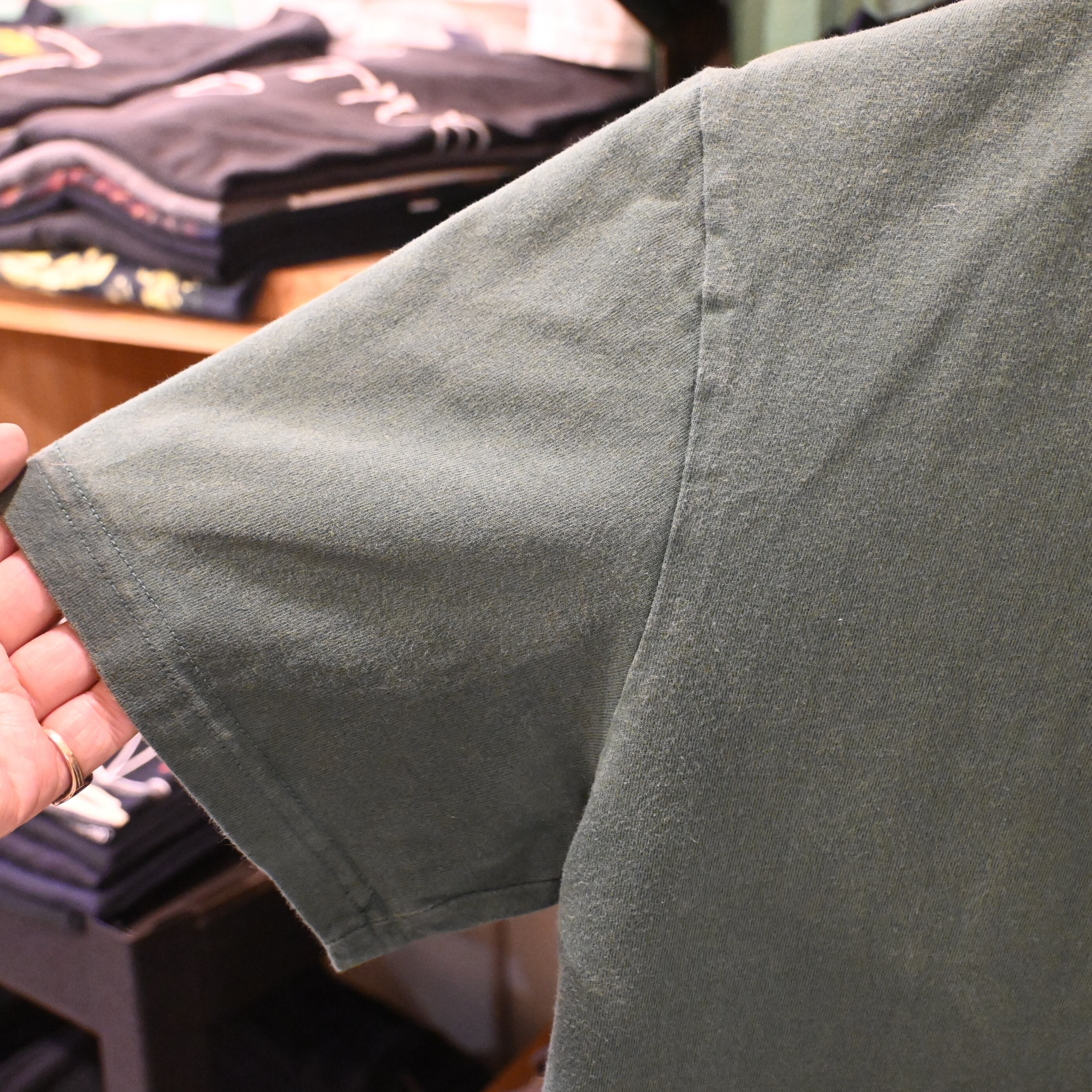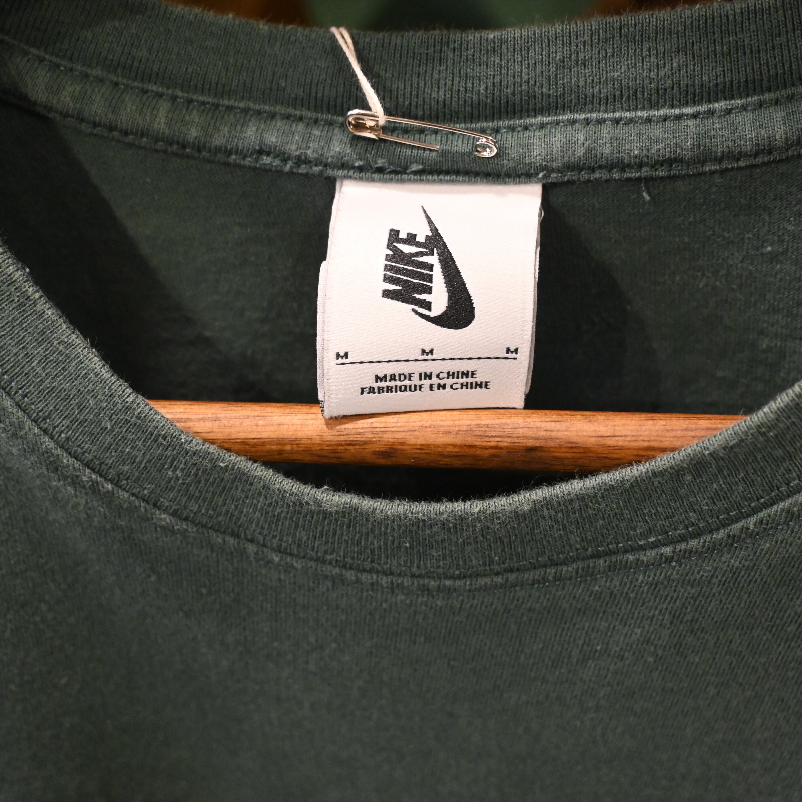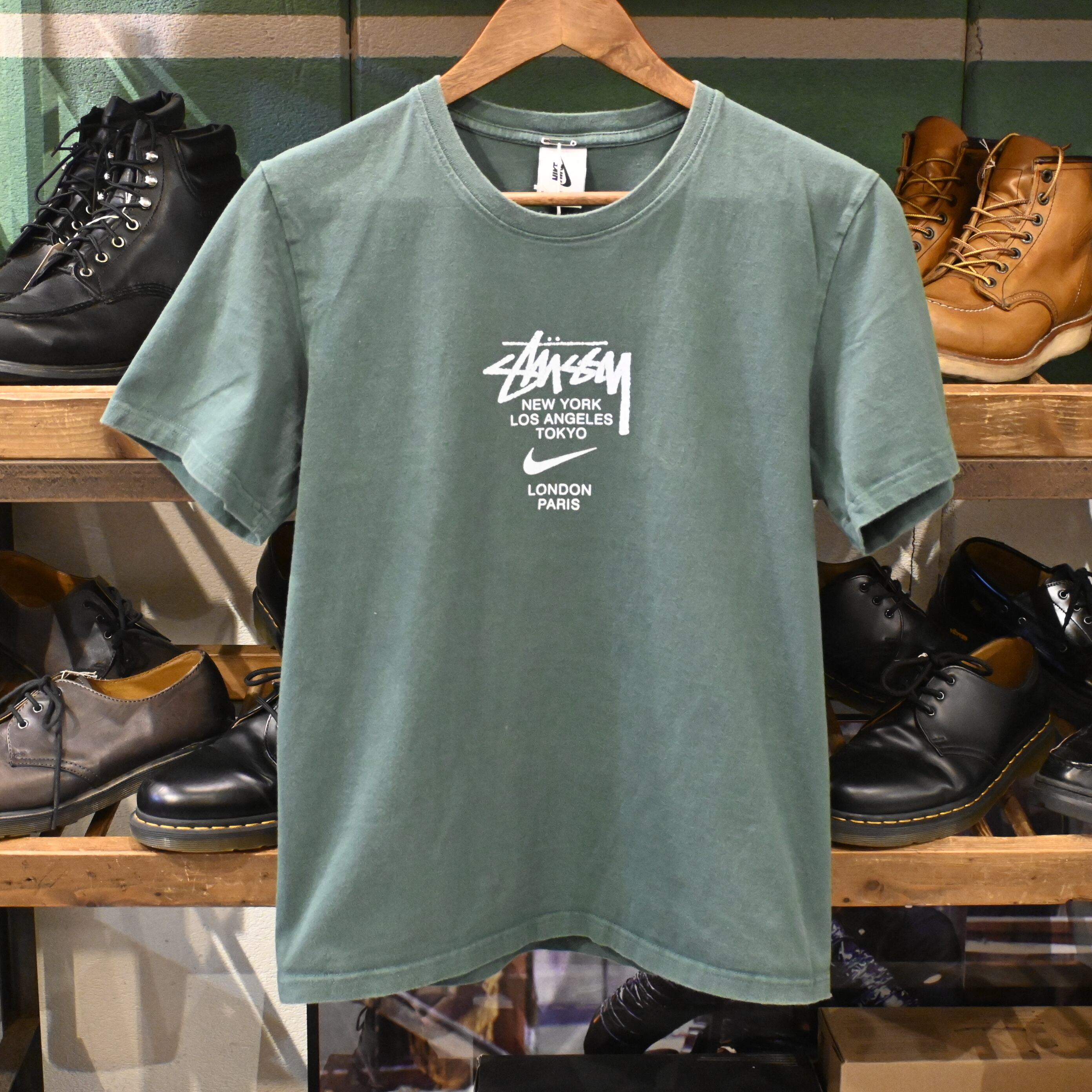 「NEW YORK」「LOS ANGELES」「TOKYO」「LONDON」「PARIS」の5都市名が並び、Stüssyらしいフォントとアイコニックな配置が映えるグラフィック。ボディはNIKEタグ付きで、ややフェードがかったグリーン系カラーがヴィンテージライクな雰囲気を演出しています。