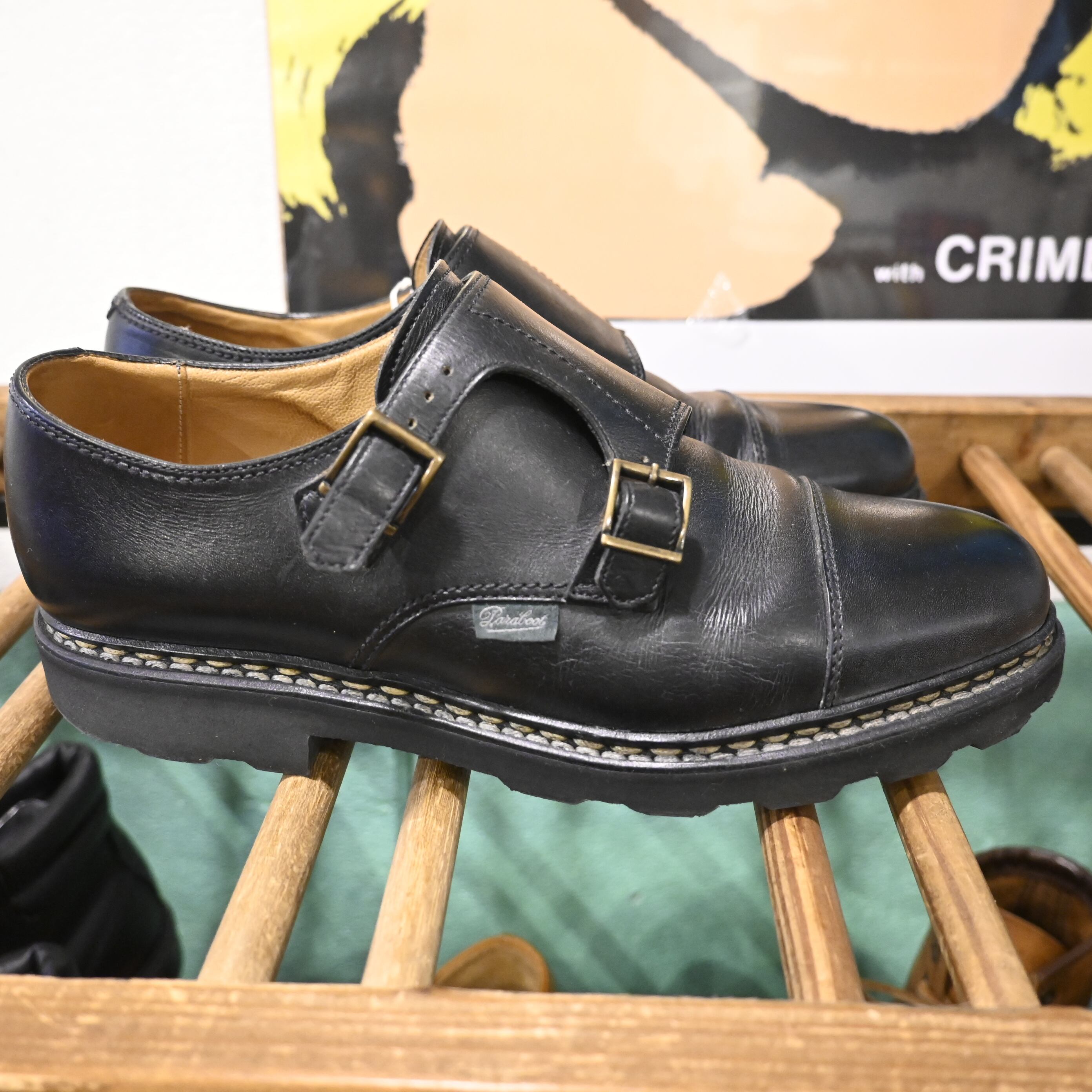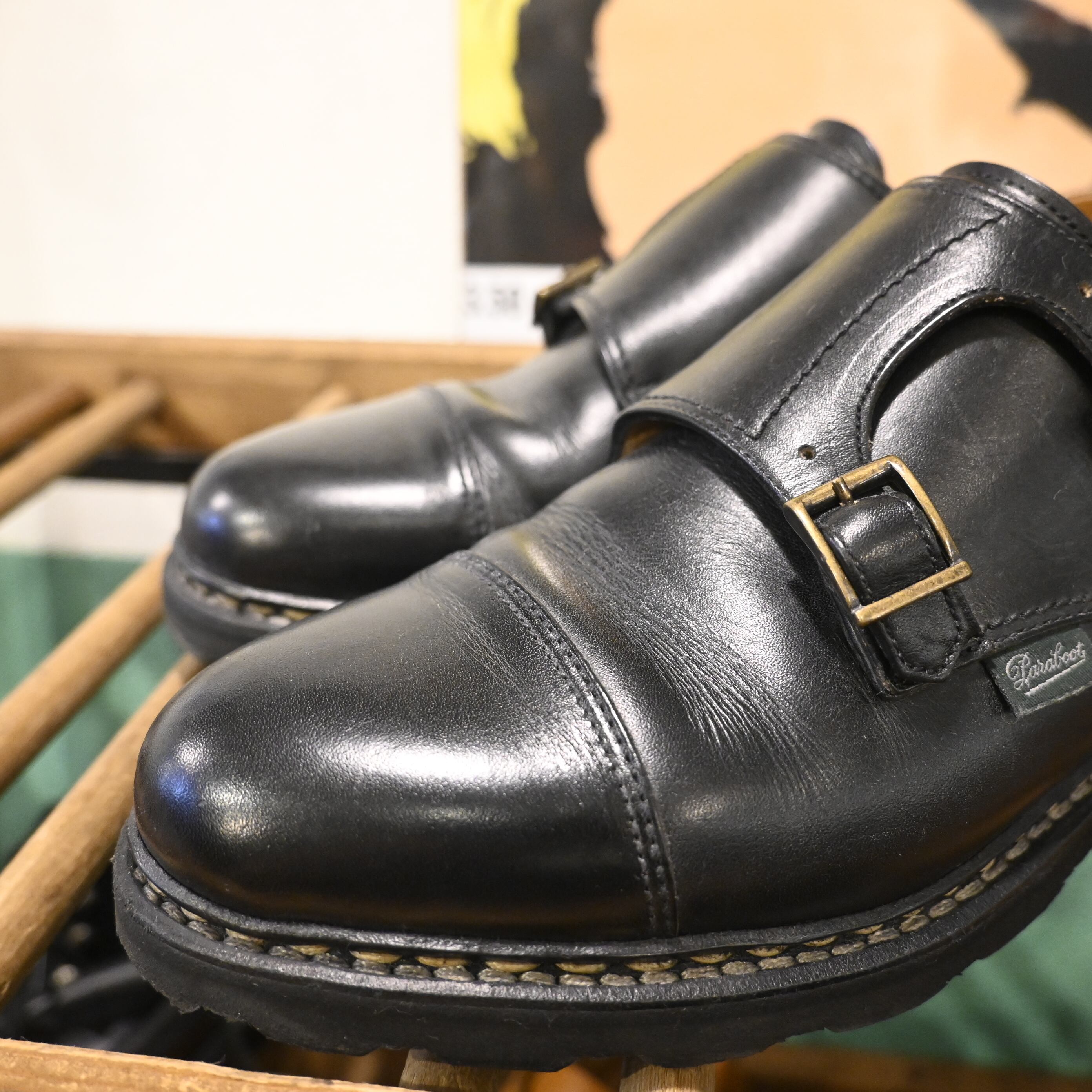 本モデルは、艶感のあるブラックレザーに、ダブルモンクのバックルが映える洗練されたデザイン。グッドイヤーウェルト製法を採用し、Paraboot独自のラバーソールにより、耐久性・歩行性にも優れています。