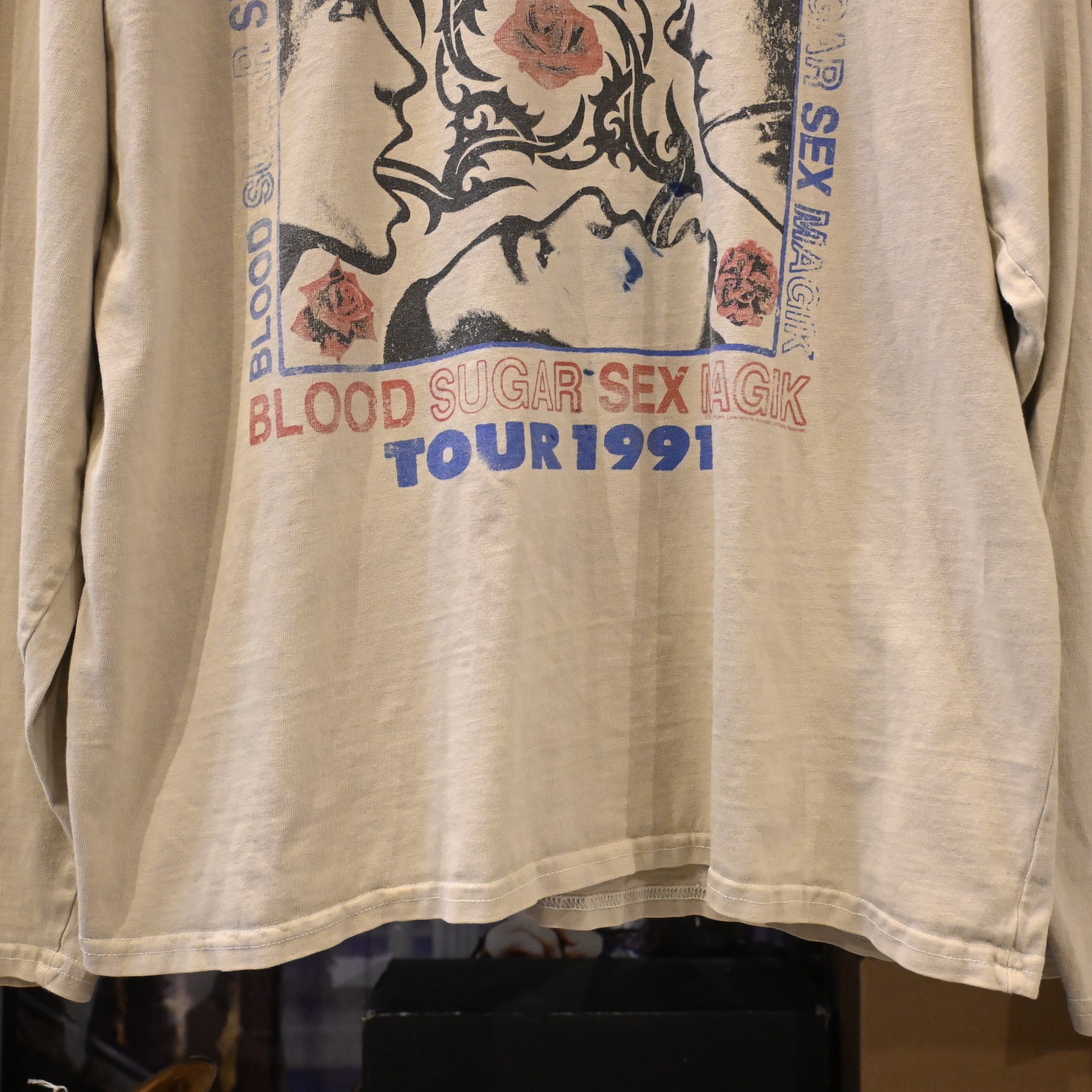 2013年コピーライト入り、RED HOT CHILI PEPPERS『Blood Sugar Sex Magik』ツアー1991デザインのロングスリーブTシャツ。フェード感のあるベージュボディに、アルバムアートを忠実に再現した大判プリントを施した一枚です。柔らかなコットン素材で着心地も良く、薄手で重ね着にも最適。デニムやチノパンとの相性も抜群で、シーズンを問わず活躍します。