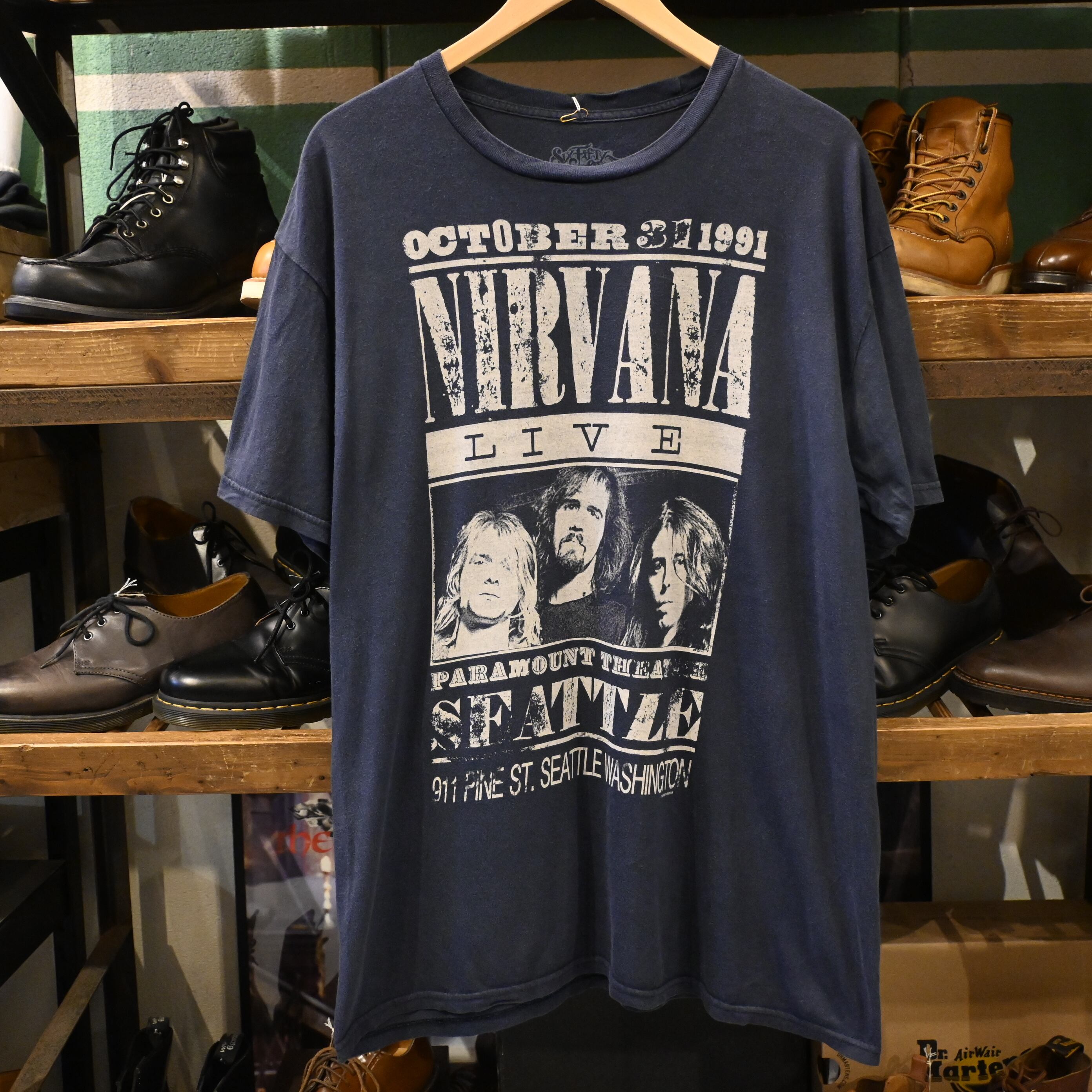 1991年10月31日、シアトル・パラマウントシアターで行われたNIRVANAのライブをモチーフにしたプリントTシャツ。2009年コピーライト入りで、メキシコ製「Sixty One」ボディを使用。フロントにはカート・コバーンらメンバーのフォトと公演情報が大胆にプリントされています。グランジファッションとの相性抜群な一枚です。