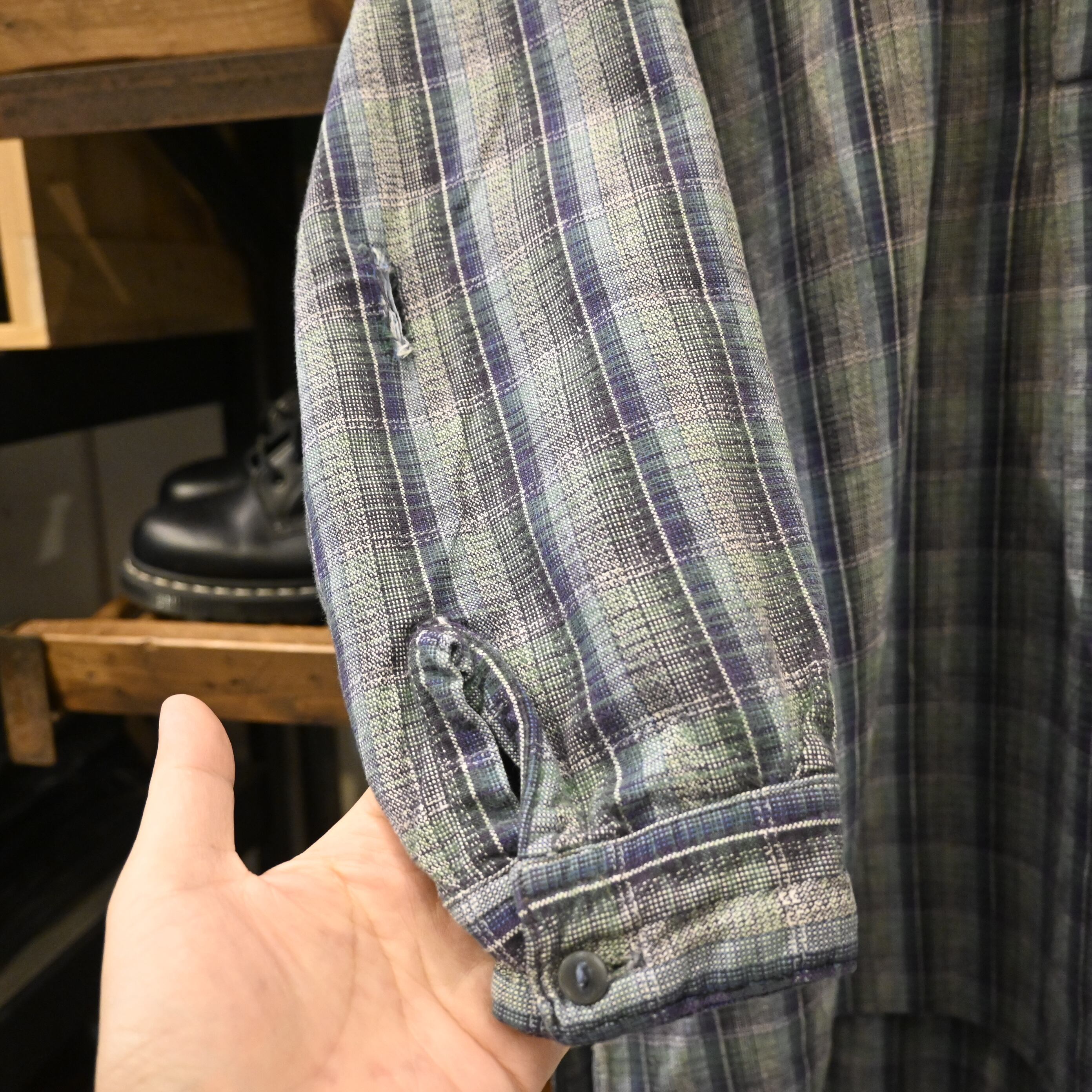粗めのコットンチェック生地で、糸のムラやざらつきが見られるため、現代的な大量生産品ではなく、当時の織機で織られた生地ならではの風合いが魅力的です。