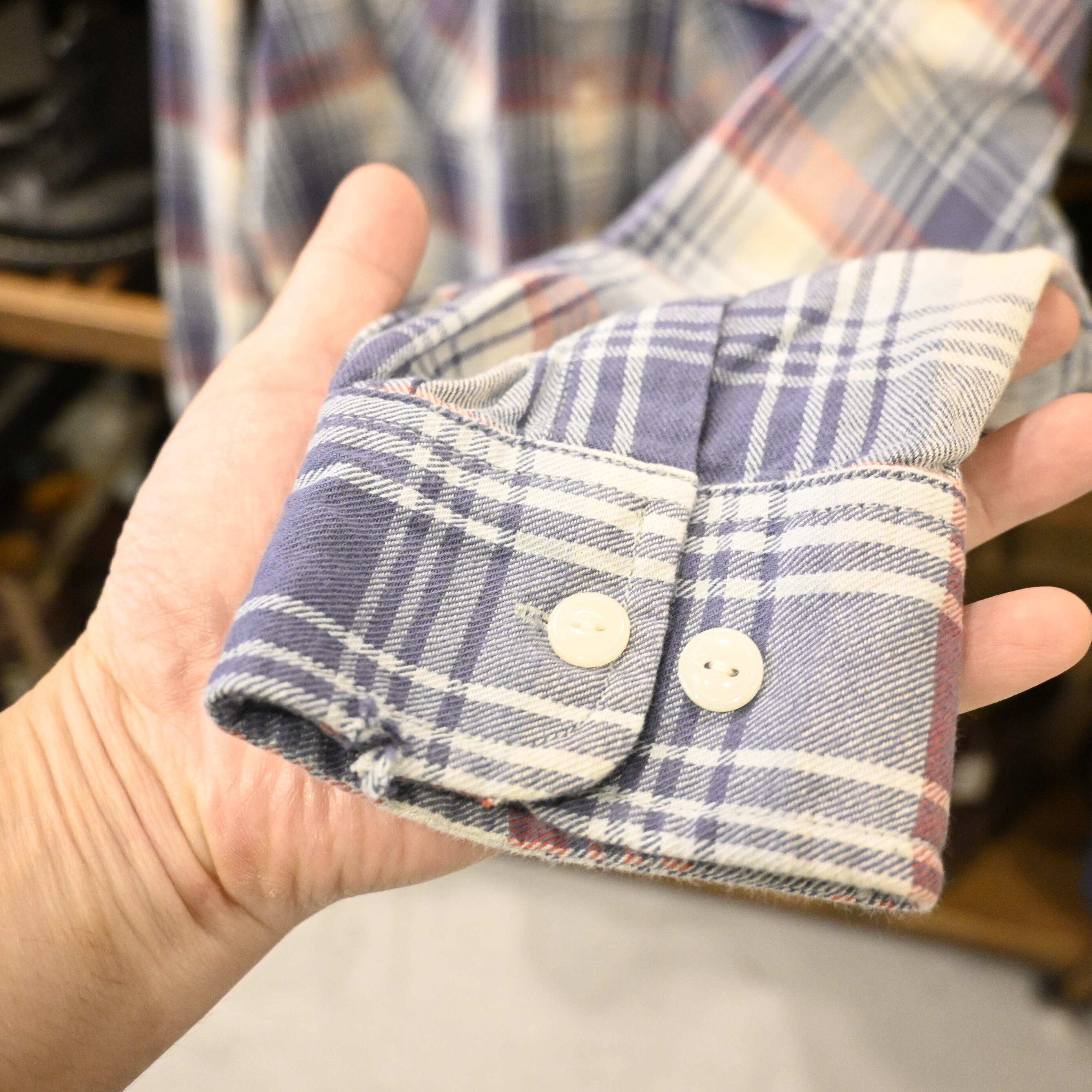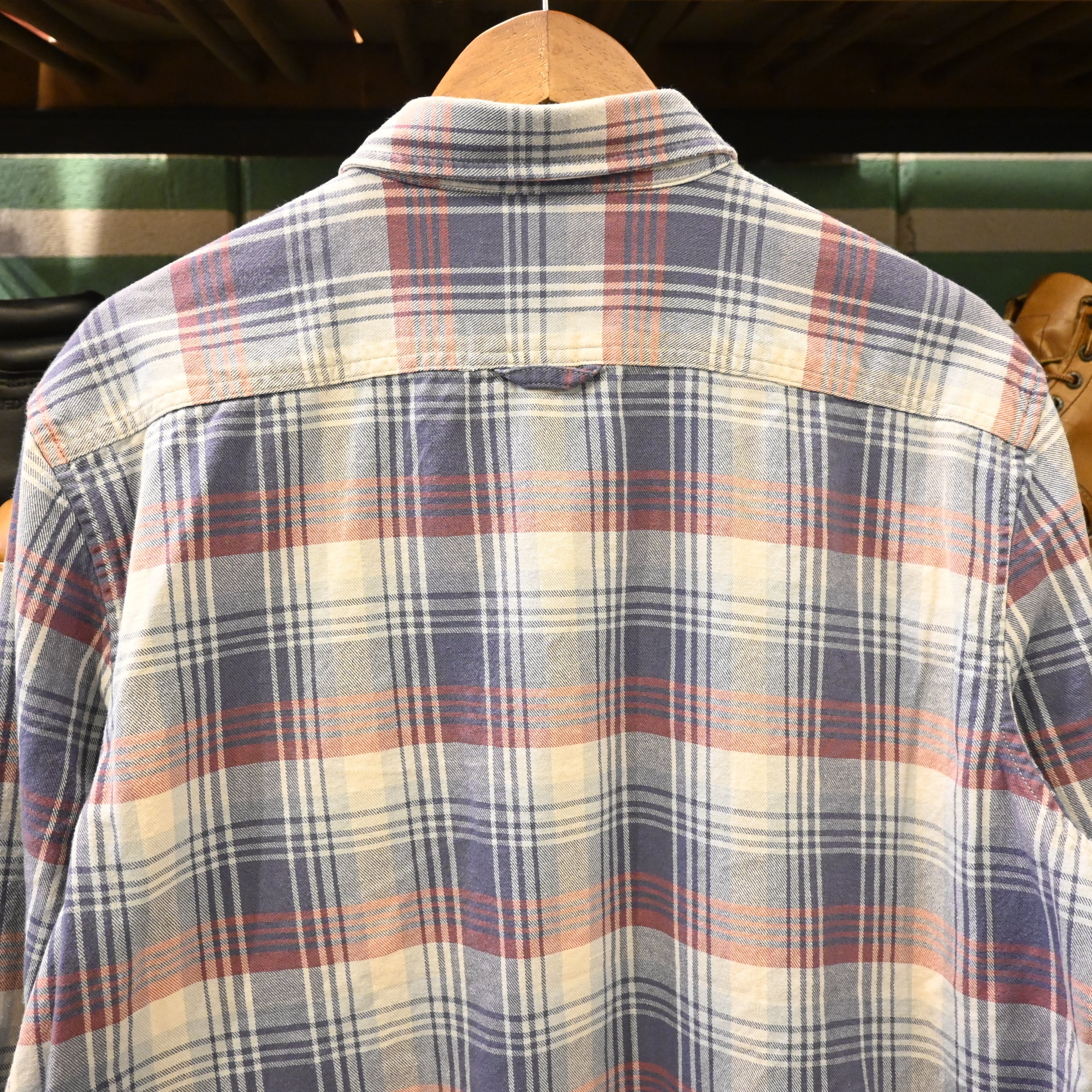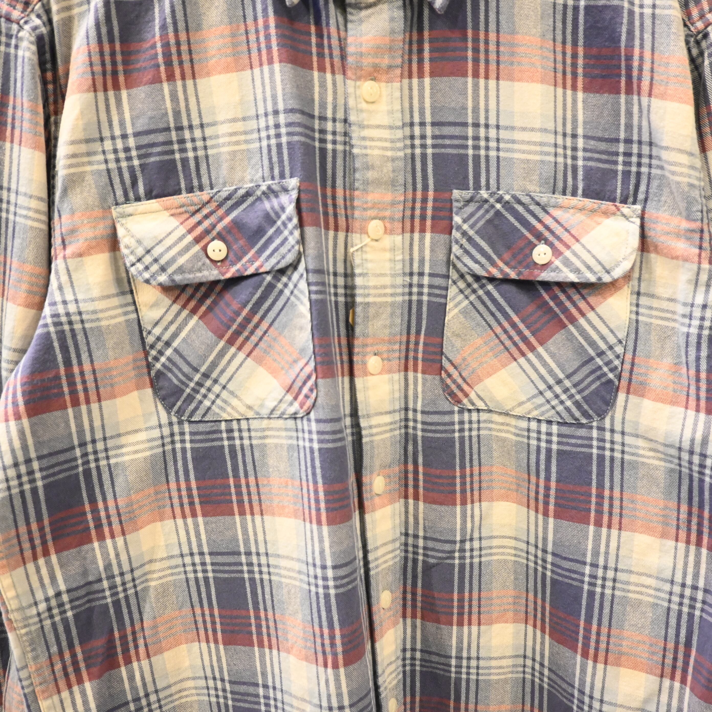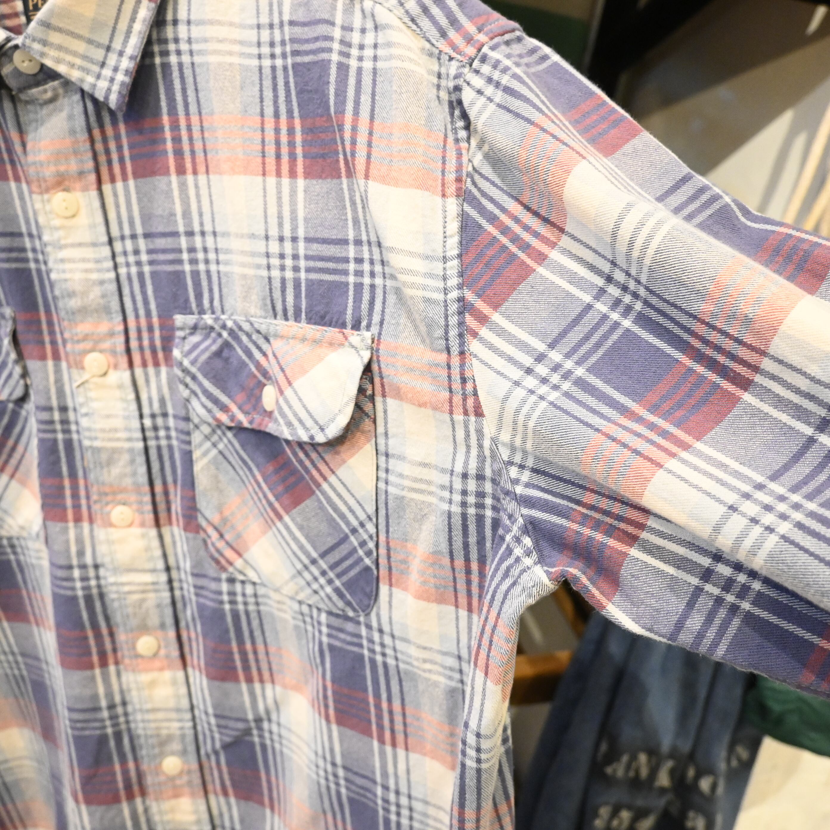 ブルーとレッドを基調とした柔らかいチェックパターンが特徴で、シンプルながら存在感のある一枚。両胸にフラップポケットを備えたベーシックなデザインで、Tシャツの上に羽織るだけで雰囲気のあるスタイルに仕上がります。