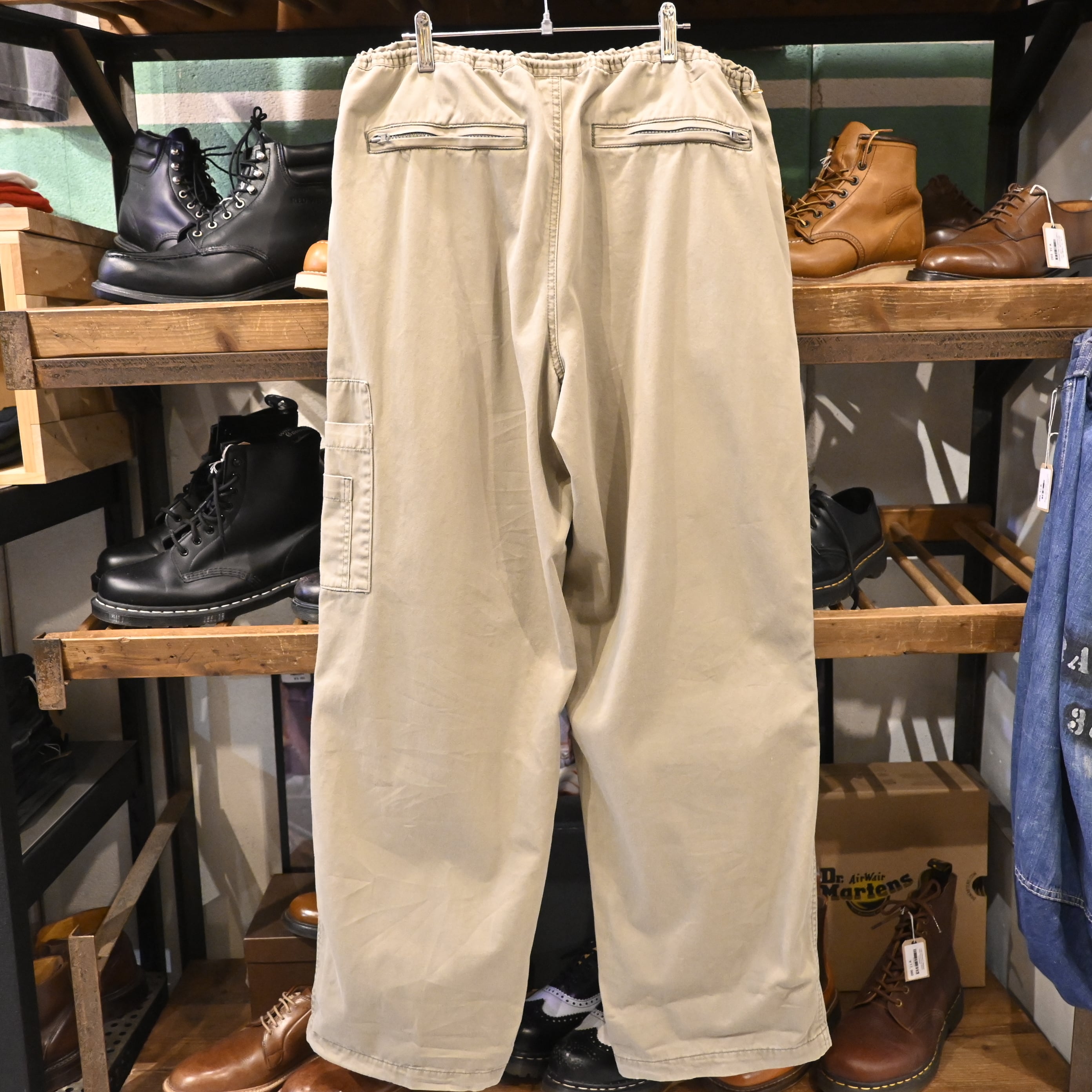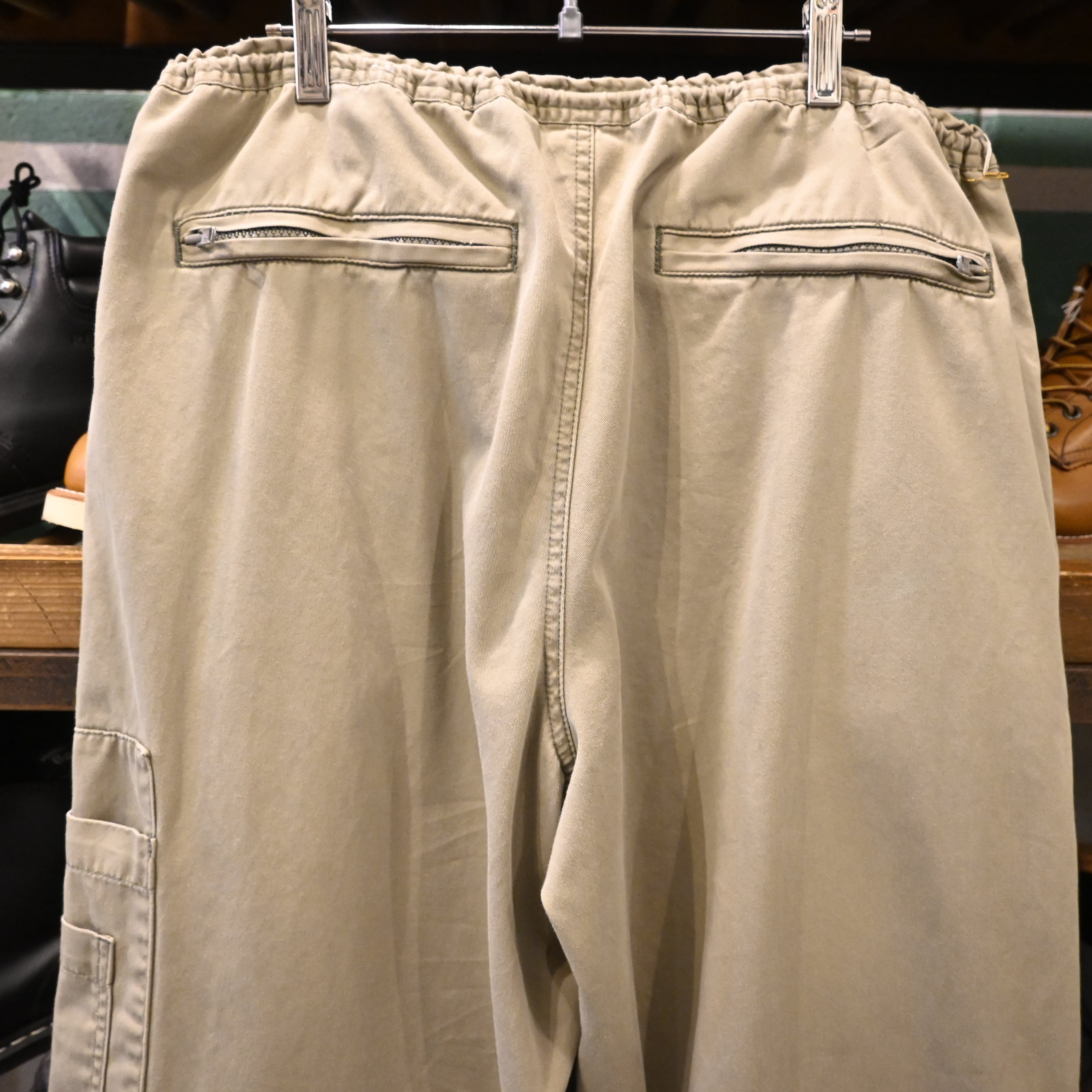 ドローコード付きのイージー仕様で、快適な履き心地とリラックスしたシルエットが特徴です。サイドにはカーゴポケットを備え、裾のドローコードは欠損していますm(__)mベージュ(ややカーキより)カラーで様々なコーディネートに合わせやすい一本です。