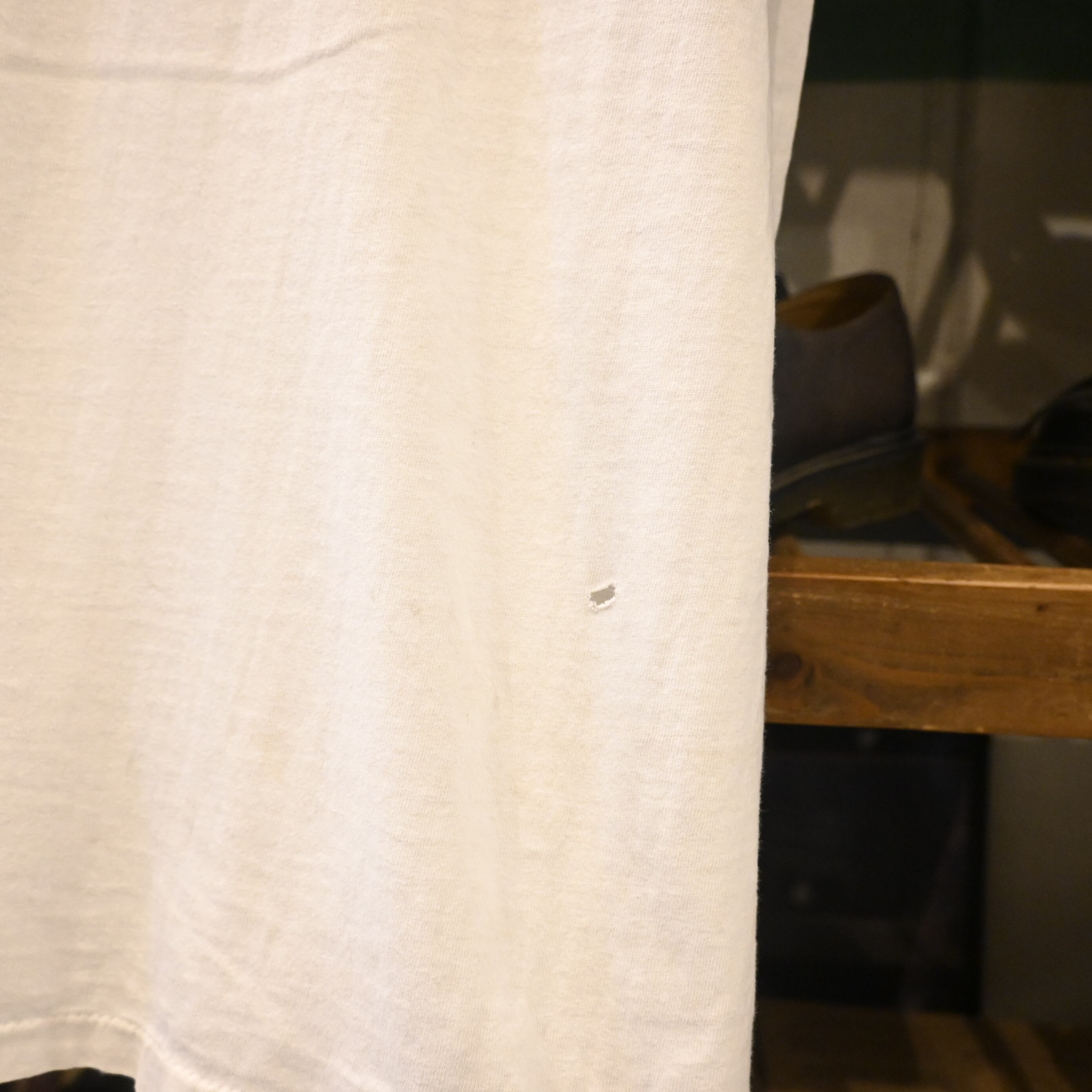 【コンディション】使用感あり。ダメージ多数あり。脇下破れ、フロント穴、首廻りダメージ。袖口裾付近にもダメージあり。ボロのTシャツです。