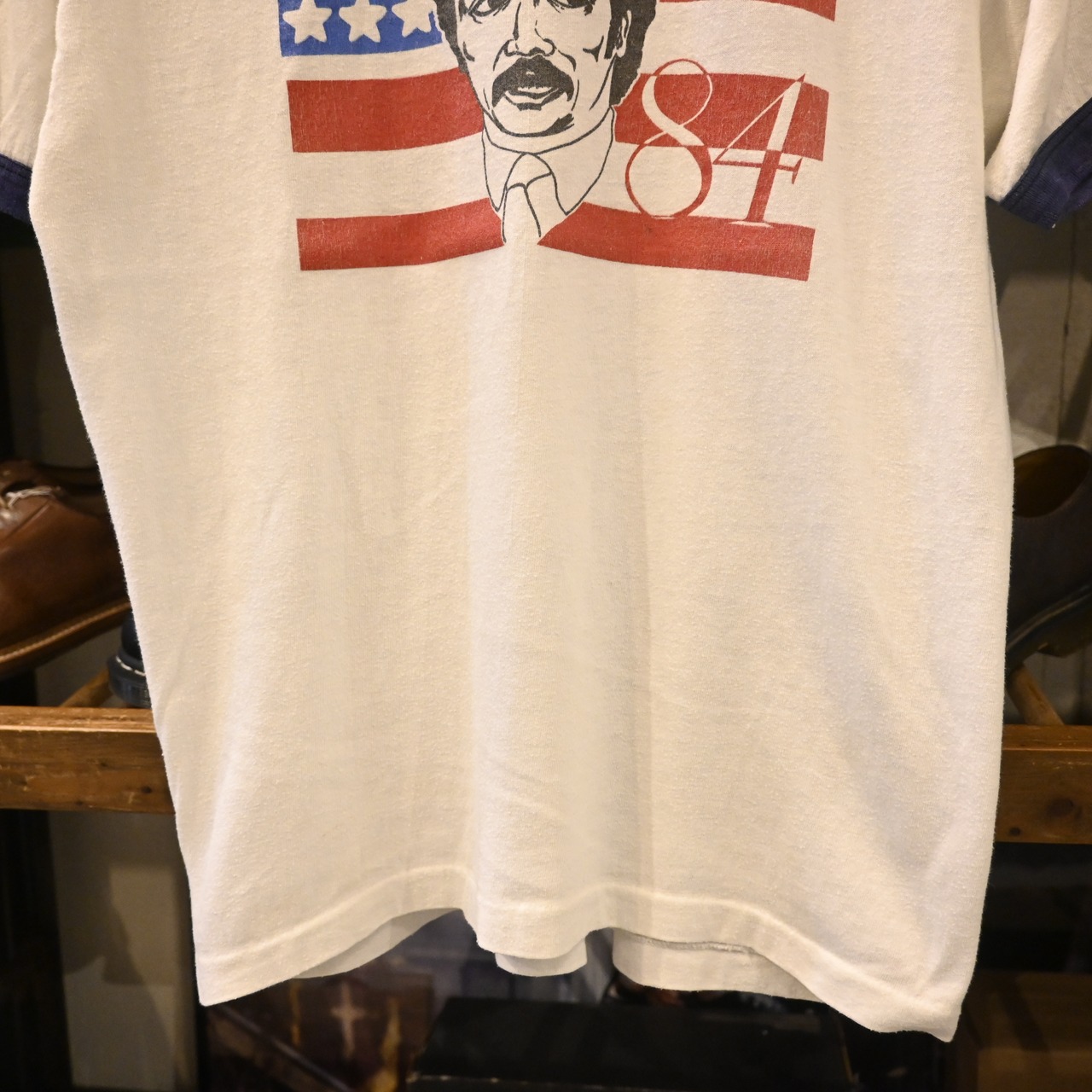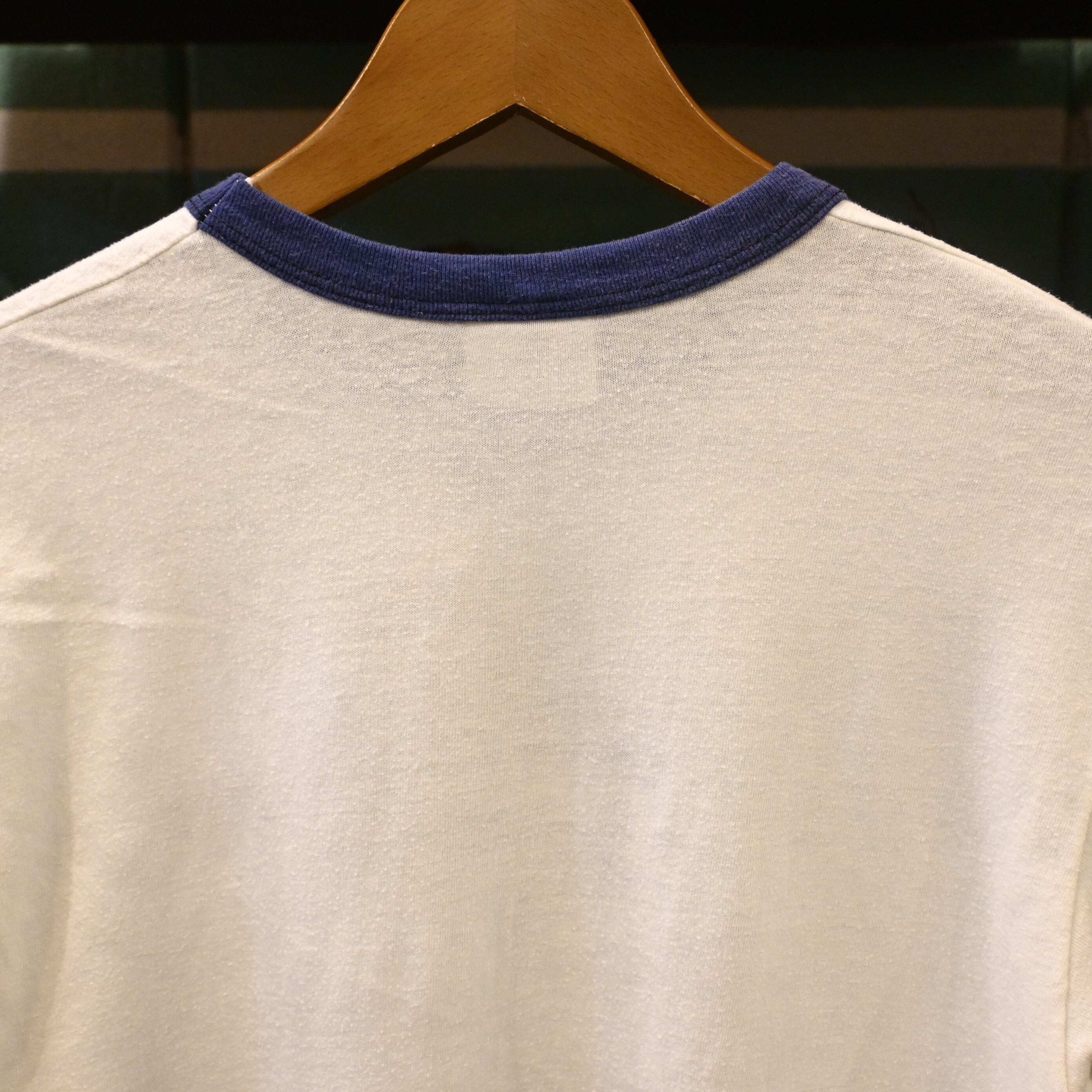 ネイビーのリンガー仕様がホワイトボディに映え、80年代らしいアメリカンカルチャーの雰囲気を楽しめます。