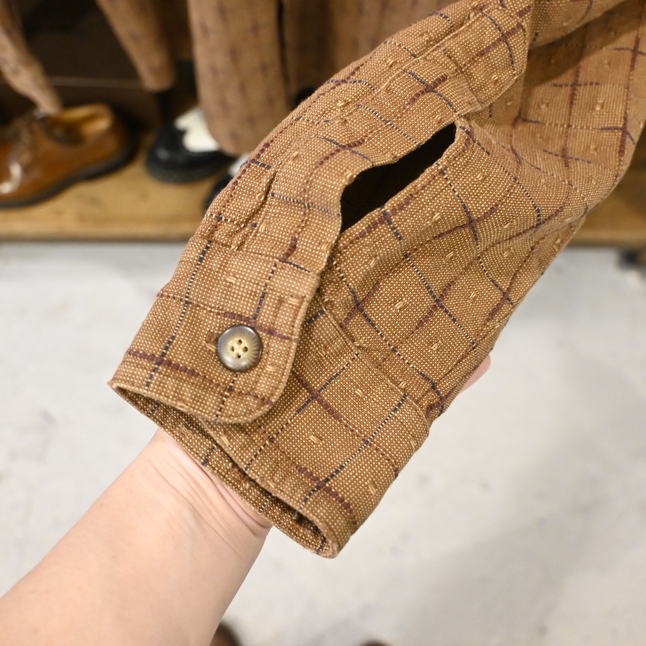 立体感のあるドビー織り風のチェック柄が特徴で、クラシックな雰囲気を持ちながら存在感のある一枚。