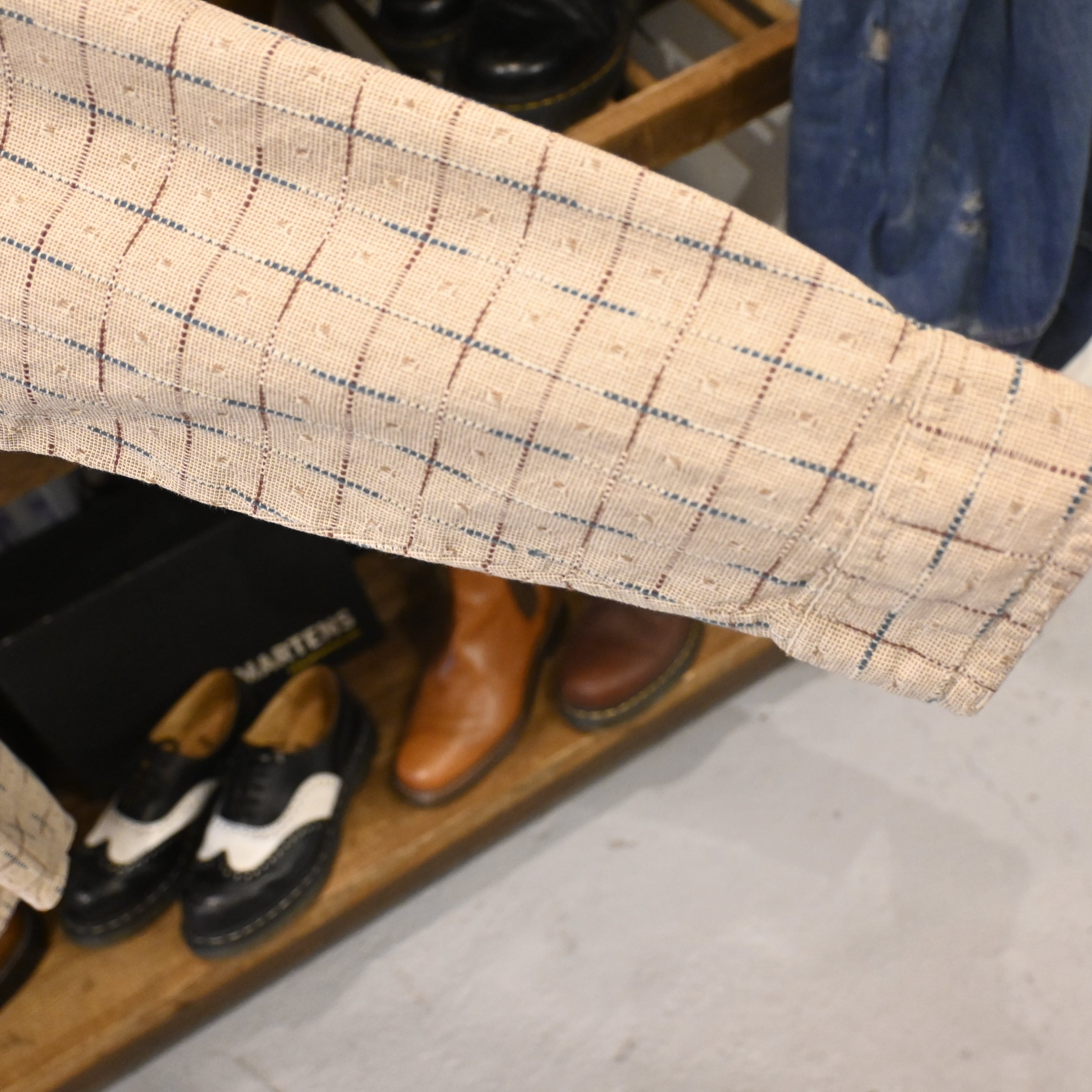 生成りベースにネイビーとブラウンのチェック柄が映える一枚。