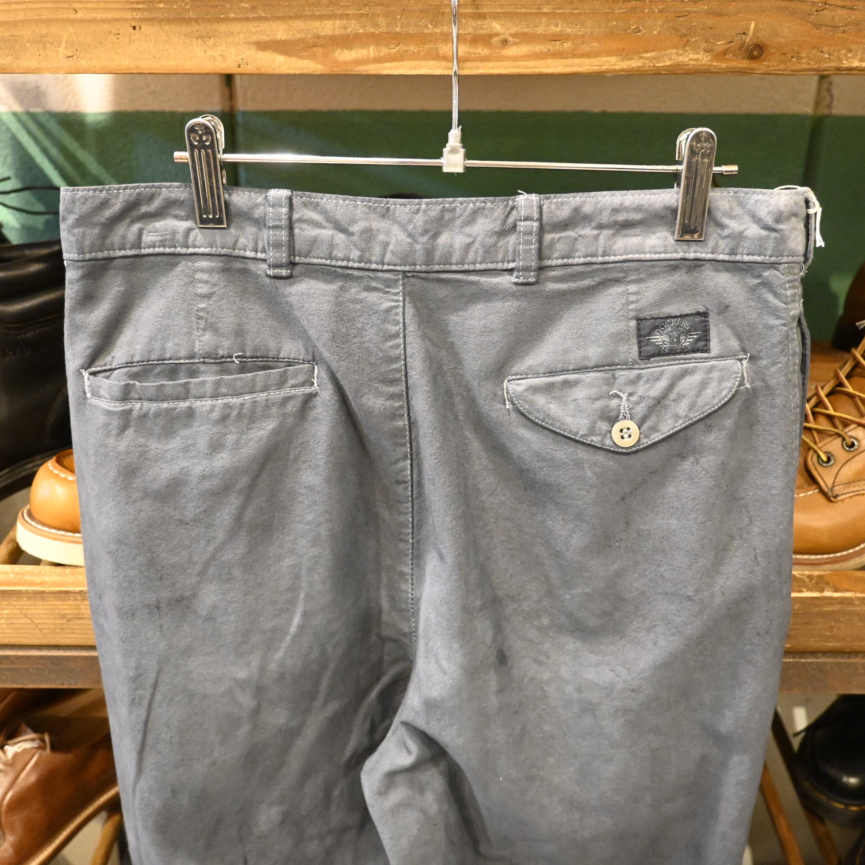 後染めの程よいフェードが上品なグレーのカラーリングで、シーンを選ばず着用可能。程よいゆとりを持たせたワイドシルエットで、ジャケットと合わせればビジネスカジュアルに、スウェットやスニーカーと合わせればカジュアルな着こなしも楽しめます。