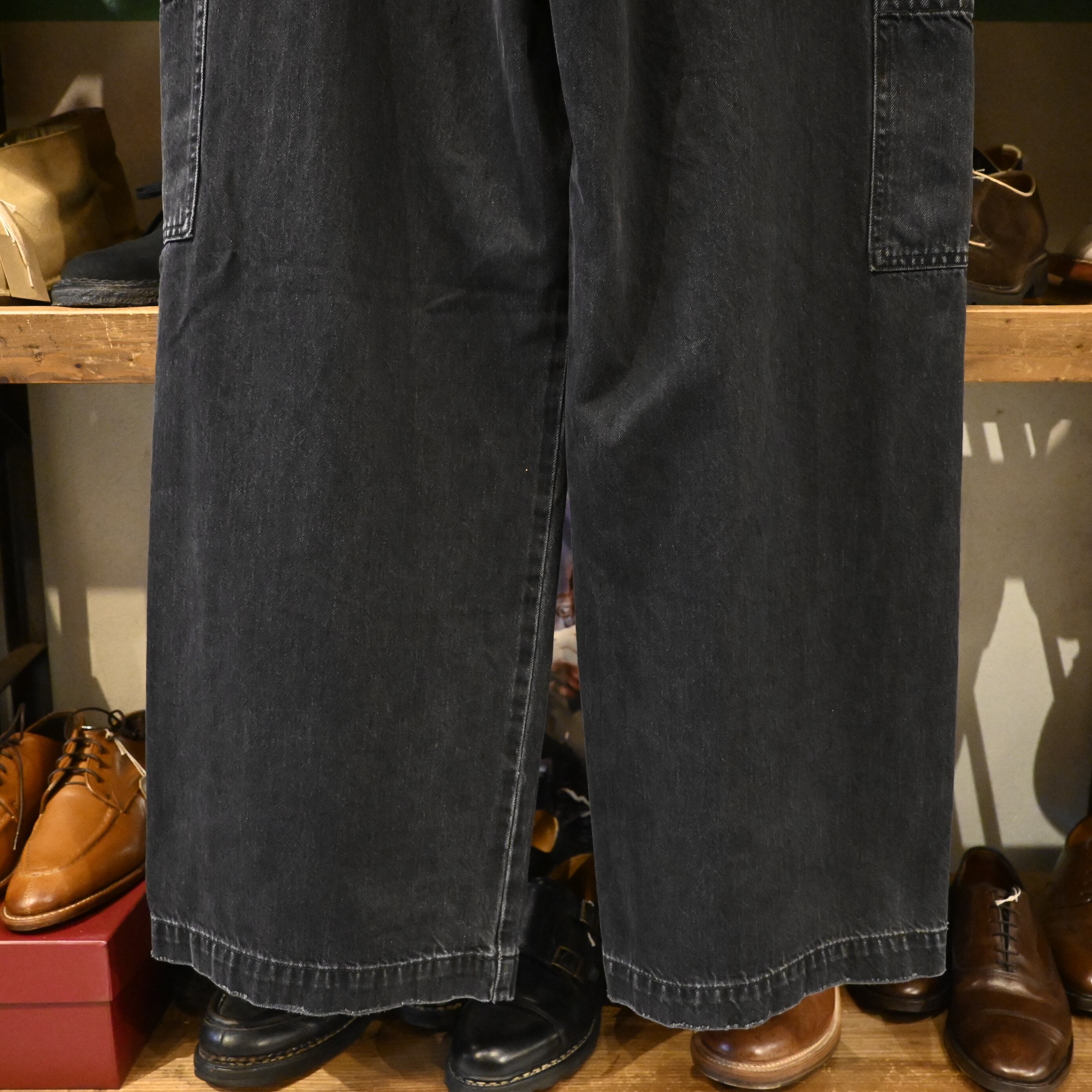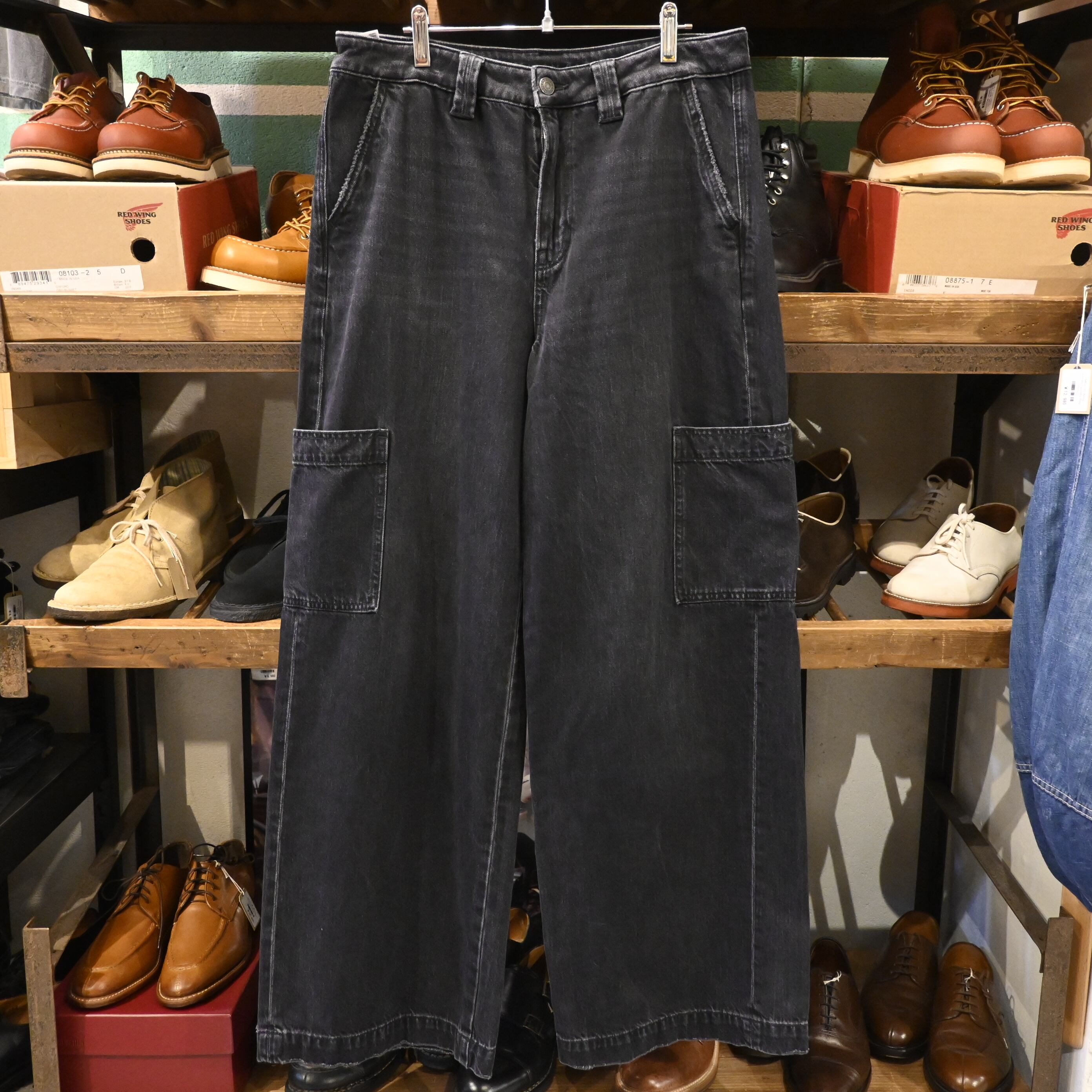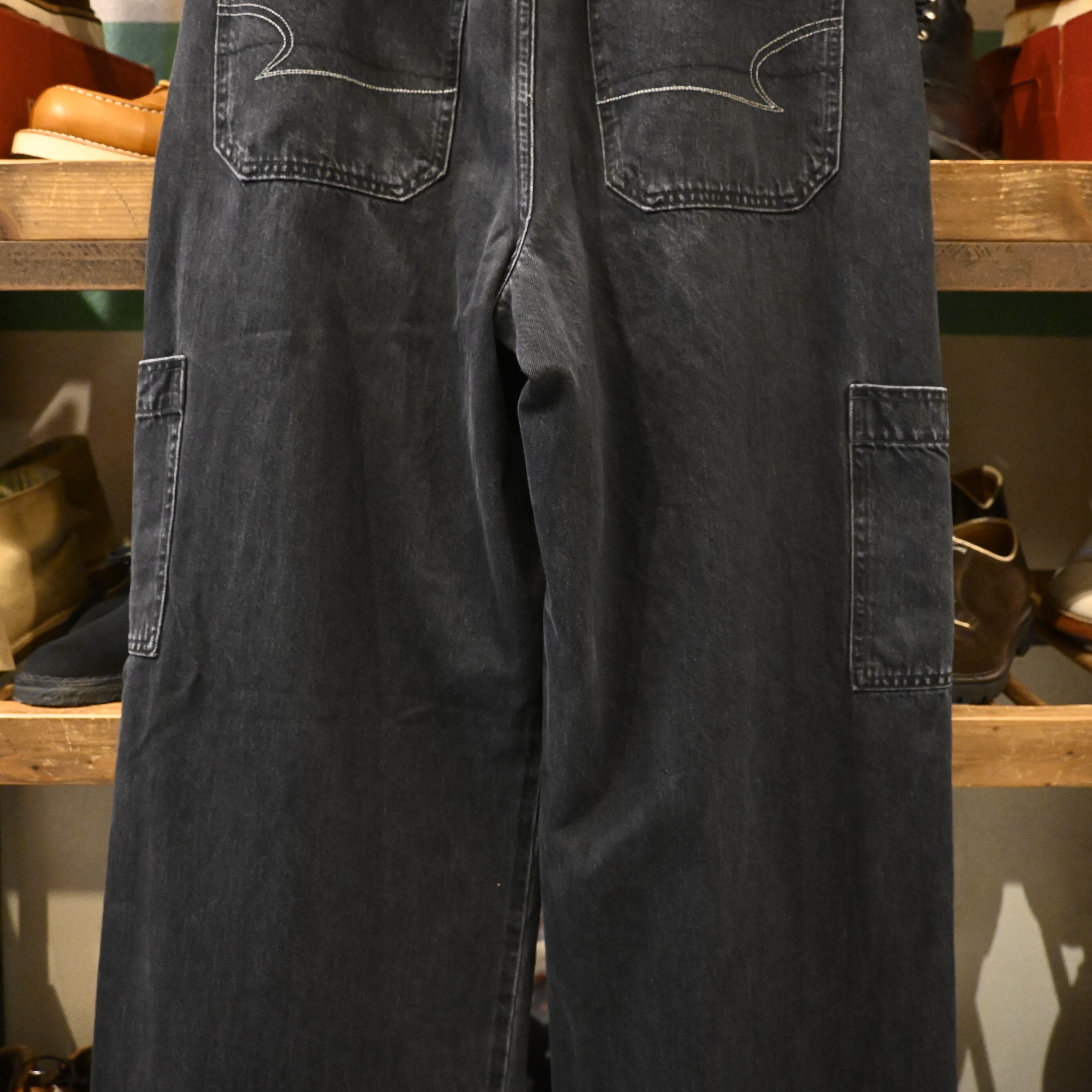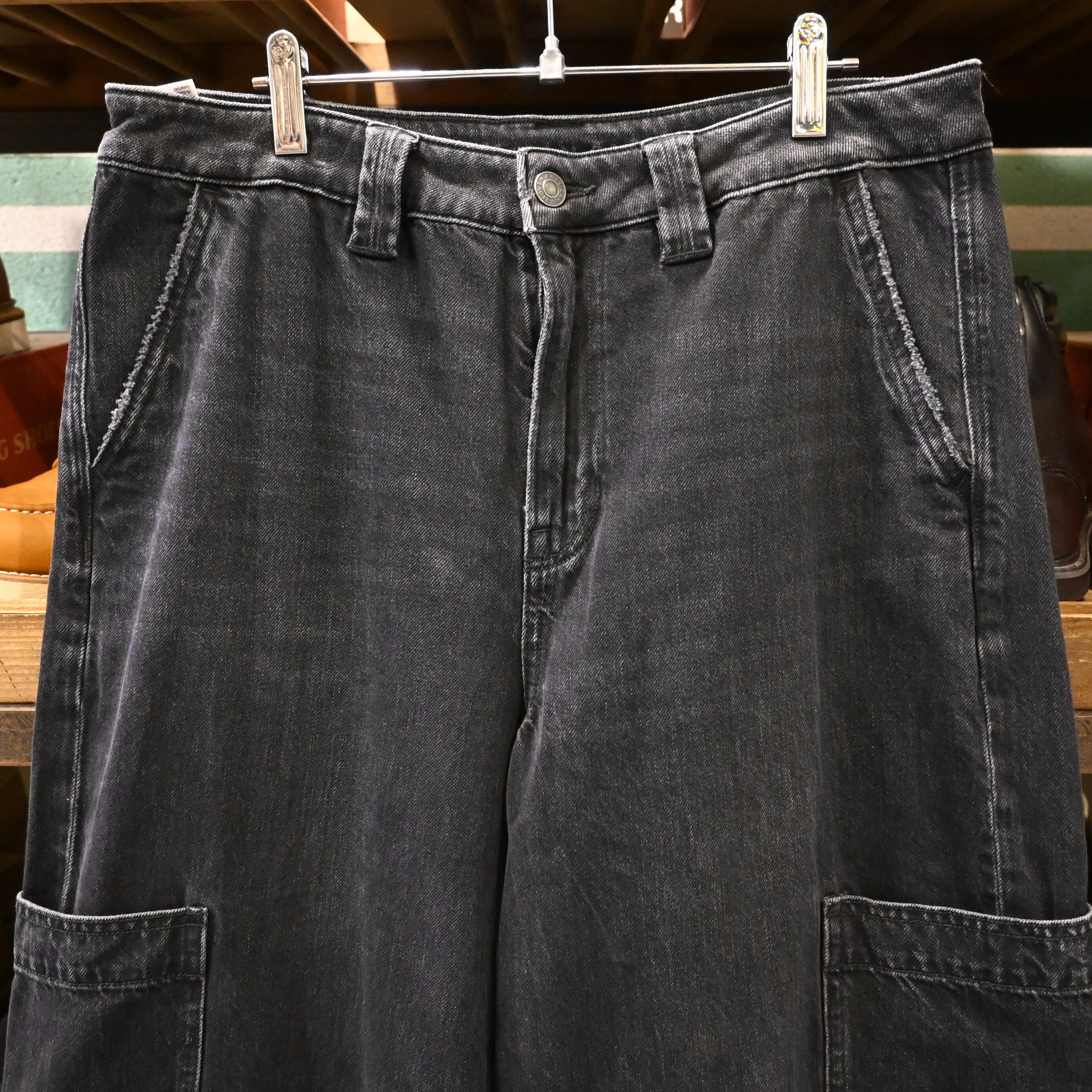 ブラックデニムにフェード感が表情を加え、シンプルながら存在感のある一本。両サイドには大きめのカーゴポケットが配置され、機能性とデザイン性を兼ね備えています。ワイドシルエットのためリラックス感があり、ストリートスタイルからカジュアルな着こなしまで幅広く対応。Tシャツやスウェットと合わせることで、トレンド感のあるコーディネートを楽しめます。