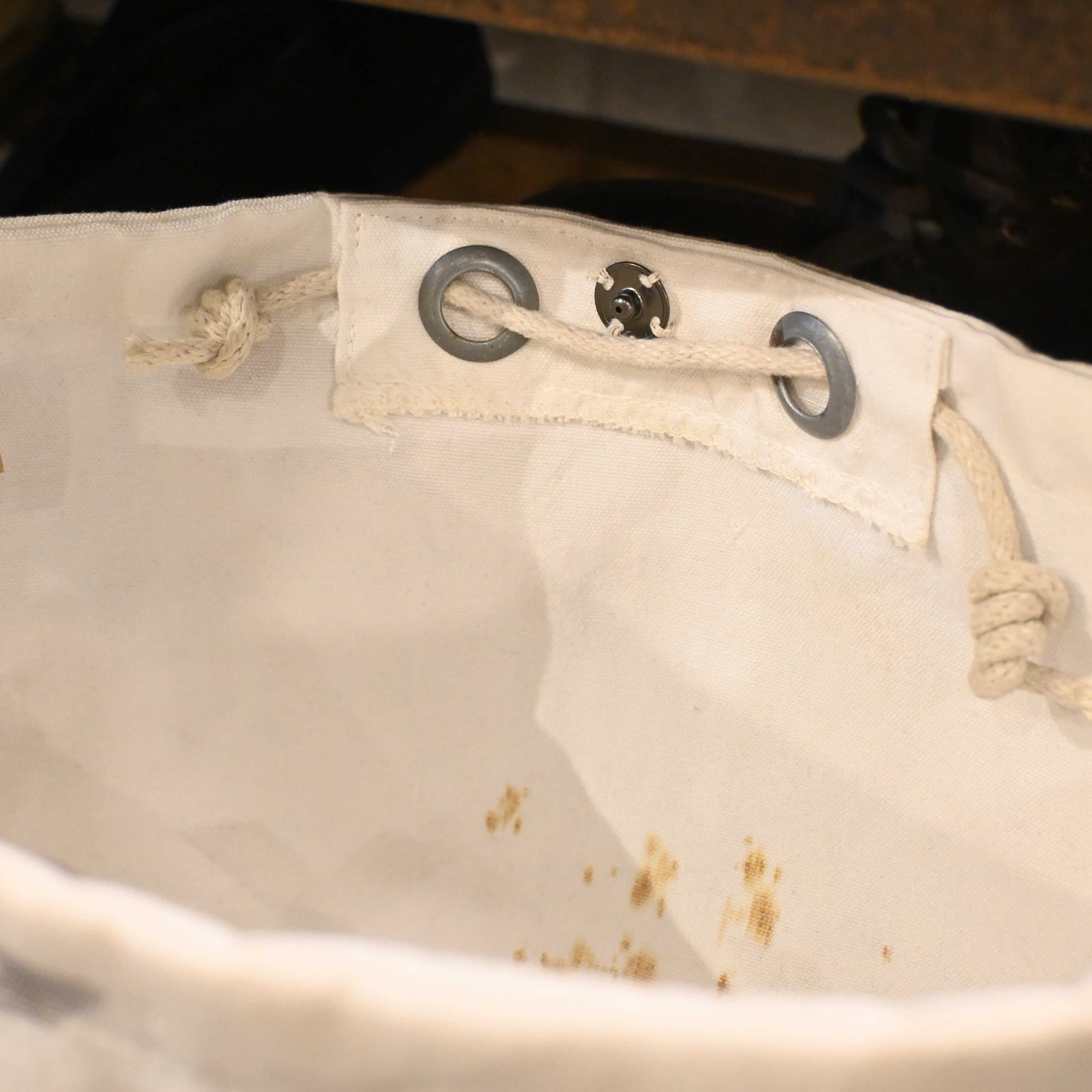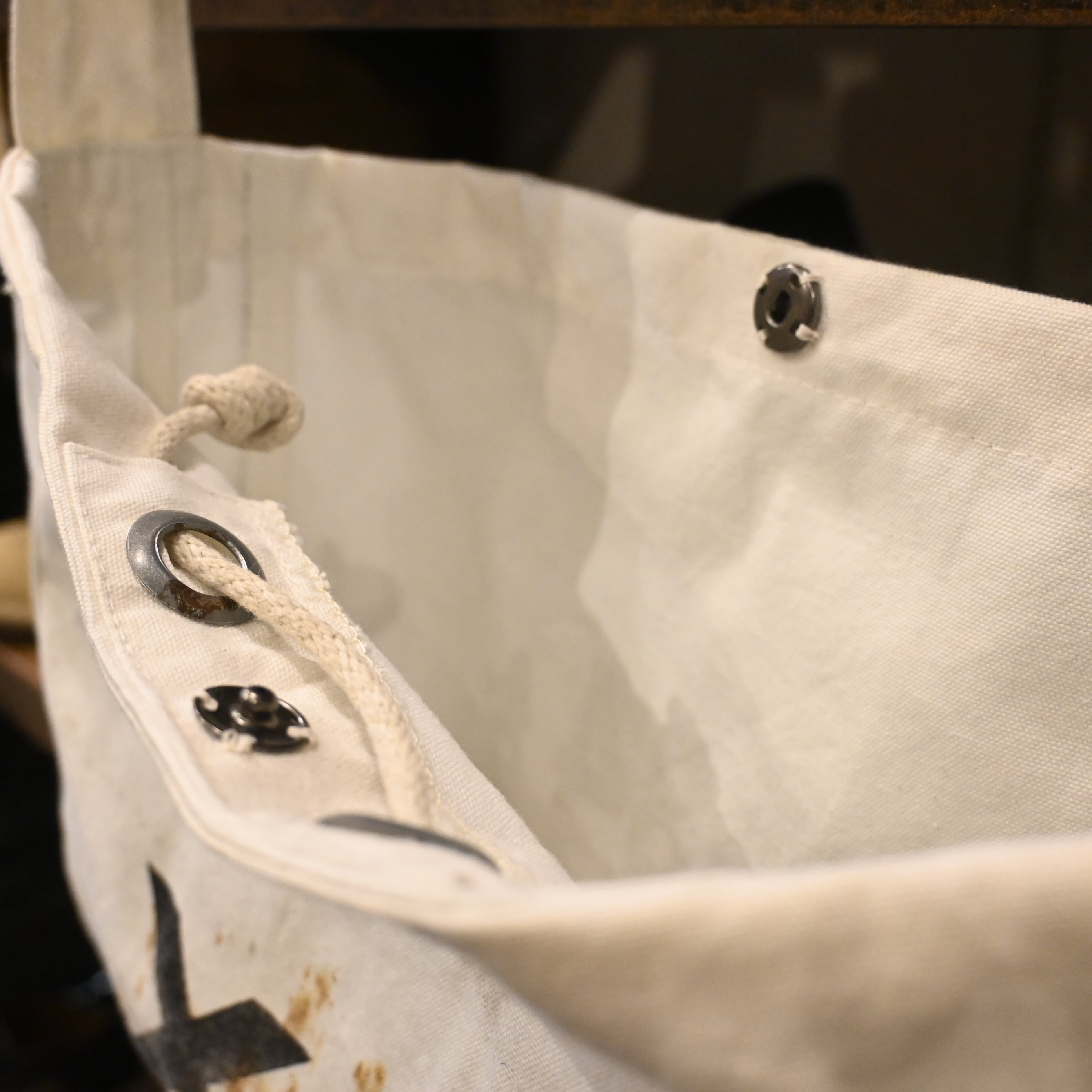 厚手のキャンバス生地を使用した頑丈な作りで、フロントには「XX」のステンシルプリント、背面には「6-84」のナンバリング入り。経年による汚れやステンシルのかすれがリアルな風合いを生み出しており、ヴィンテージならではの一点物の存在感を放ちます。