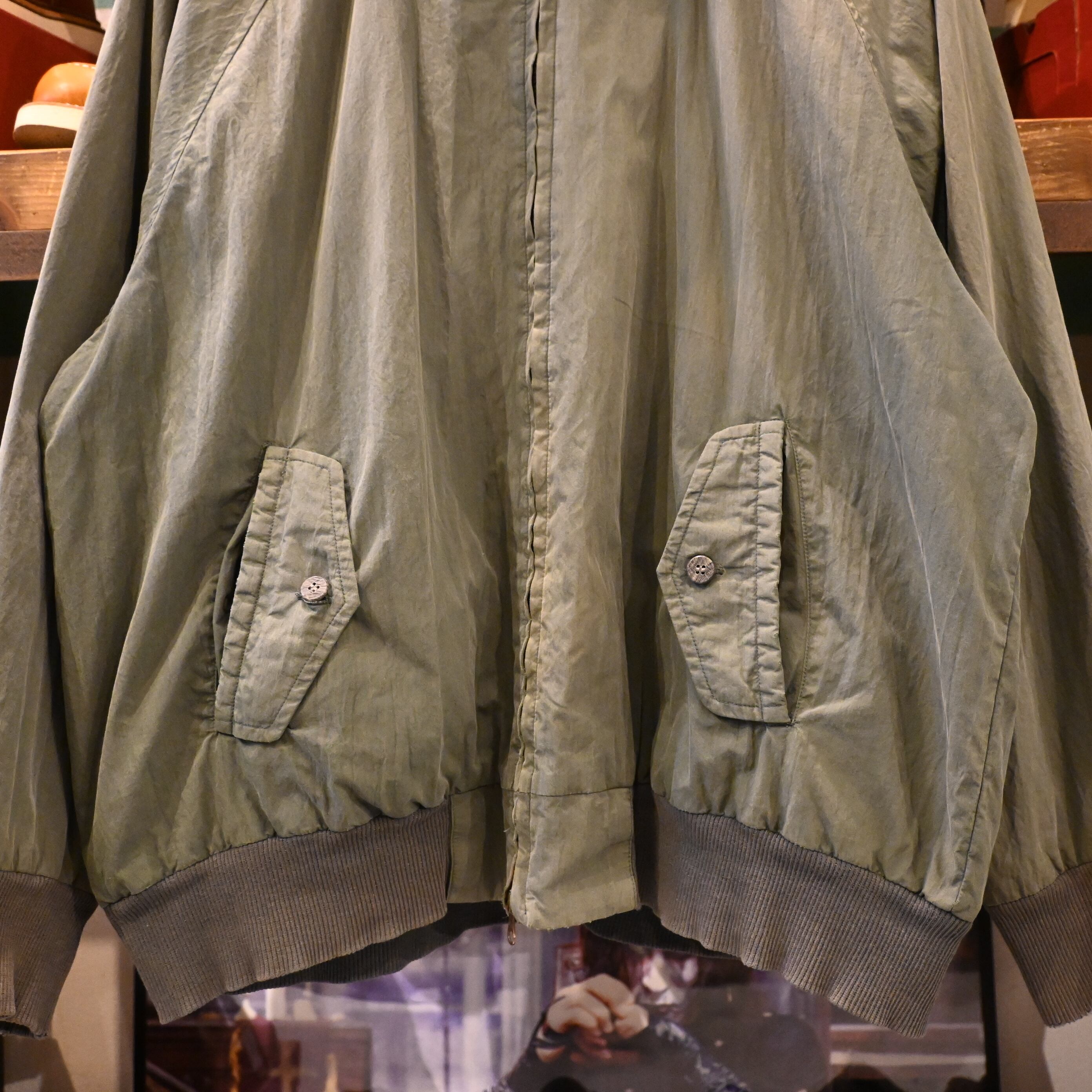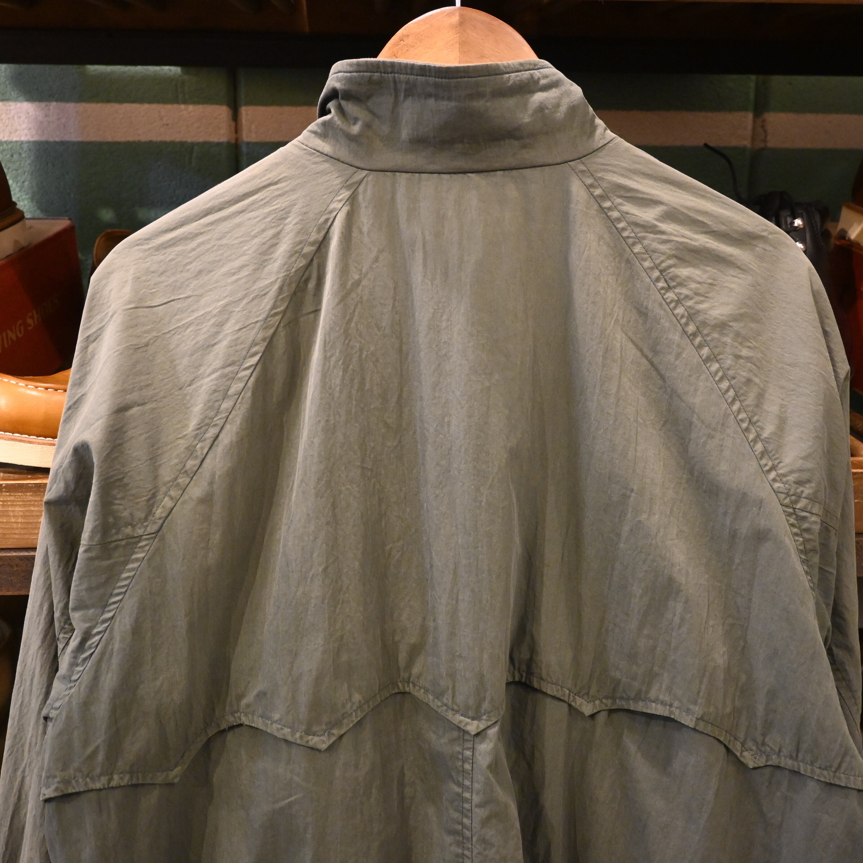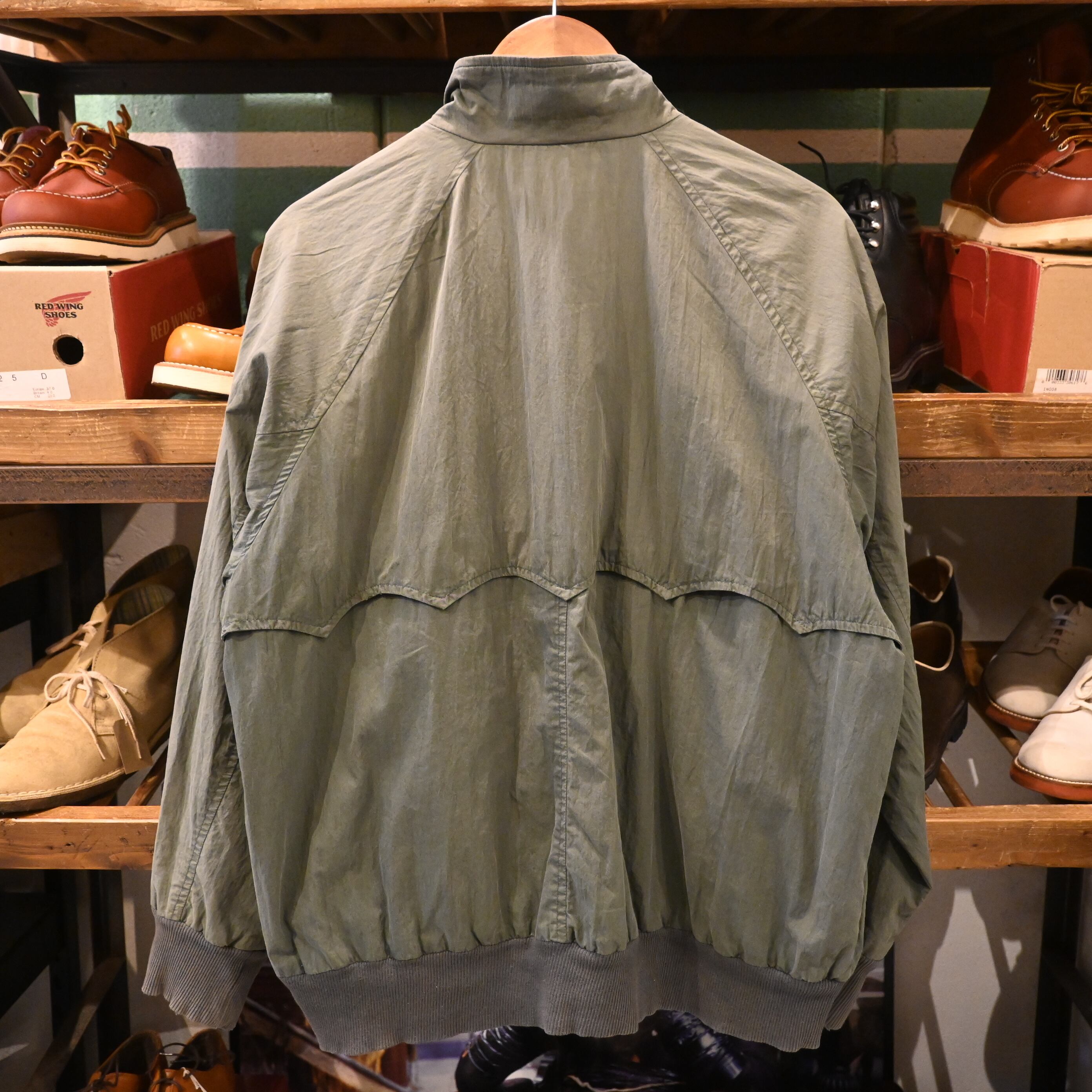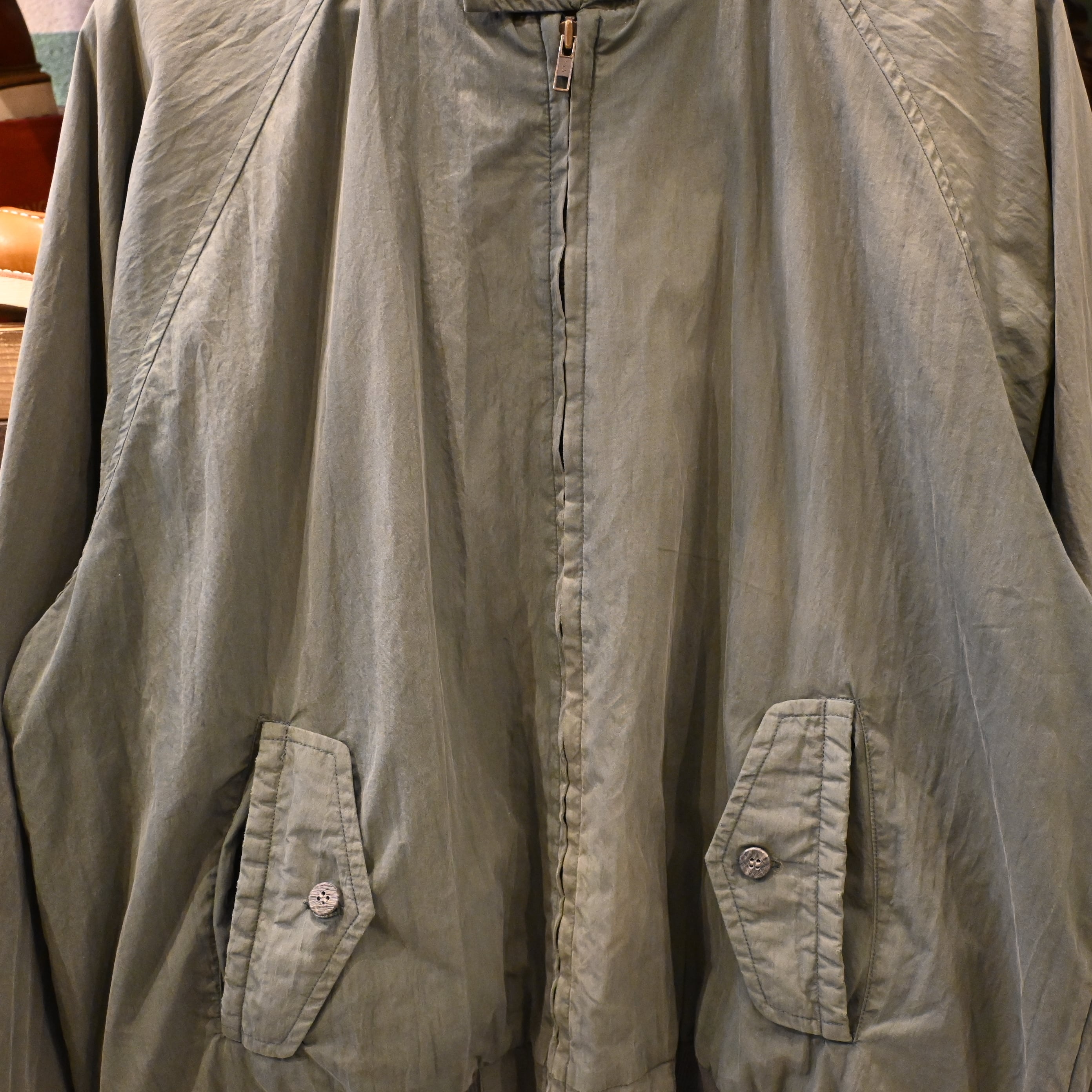 王道のハリントンらしいディテール(ラグランスリーブ・スタンドカラー・フラップ付きポケット)を備え、裏地はチェック柄仕様。コットン×ナイロン混紡の生地は経年変化でフェードしており、ヴィンテージならではの雰囲気を楽しめる一着です。