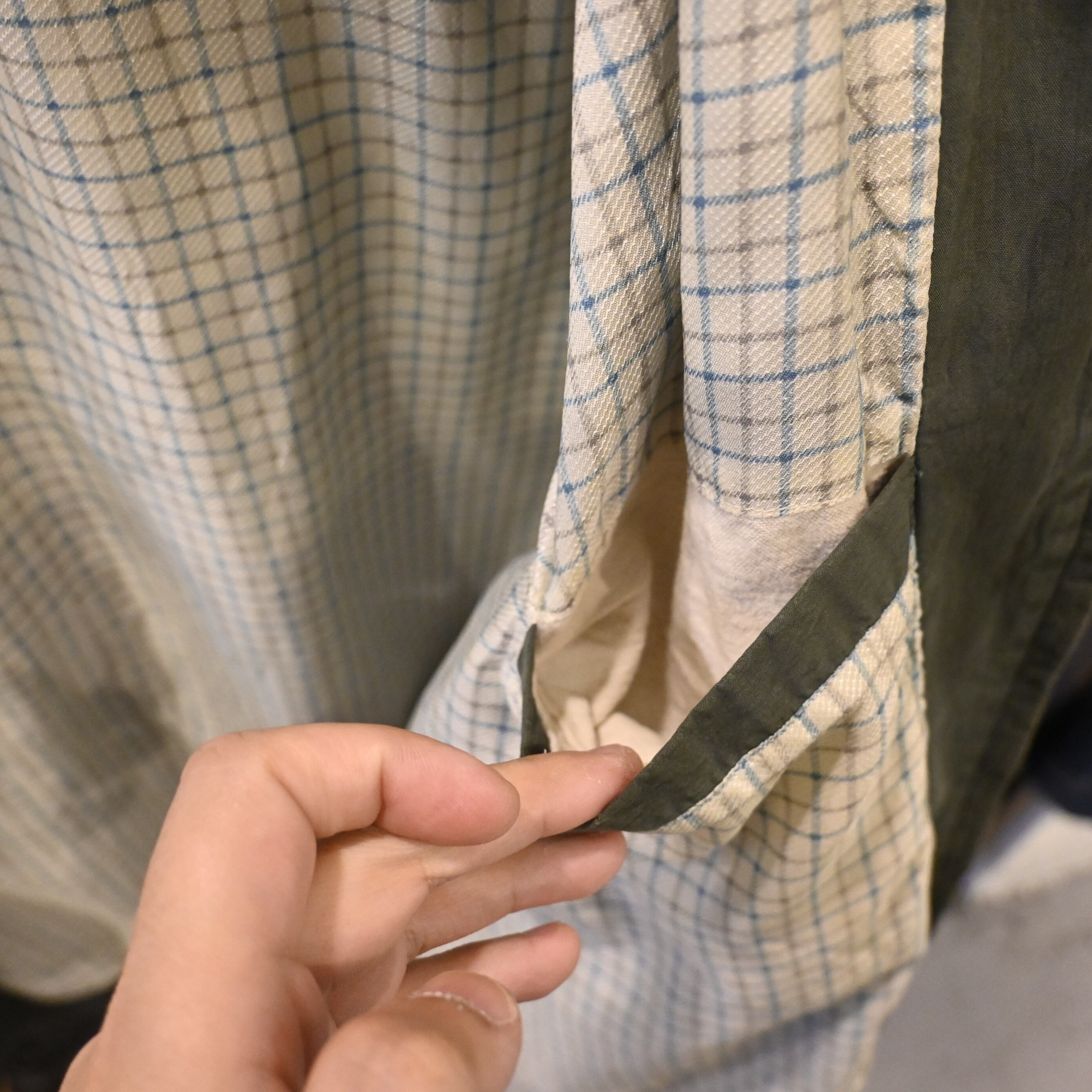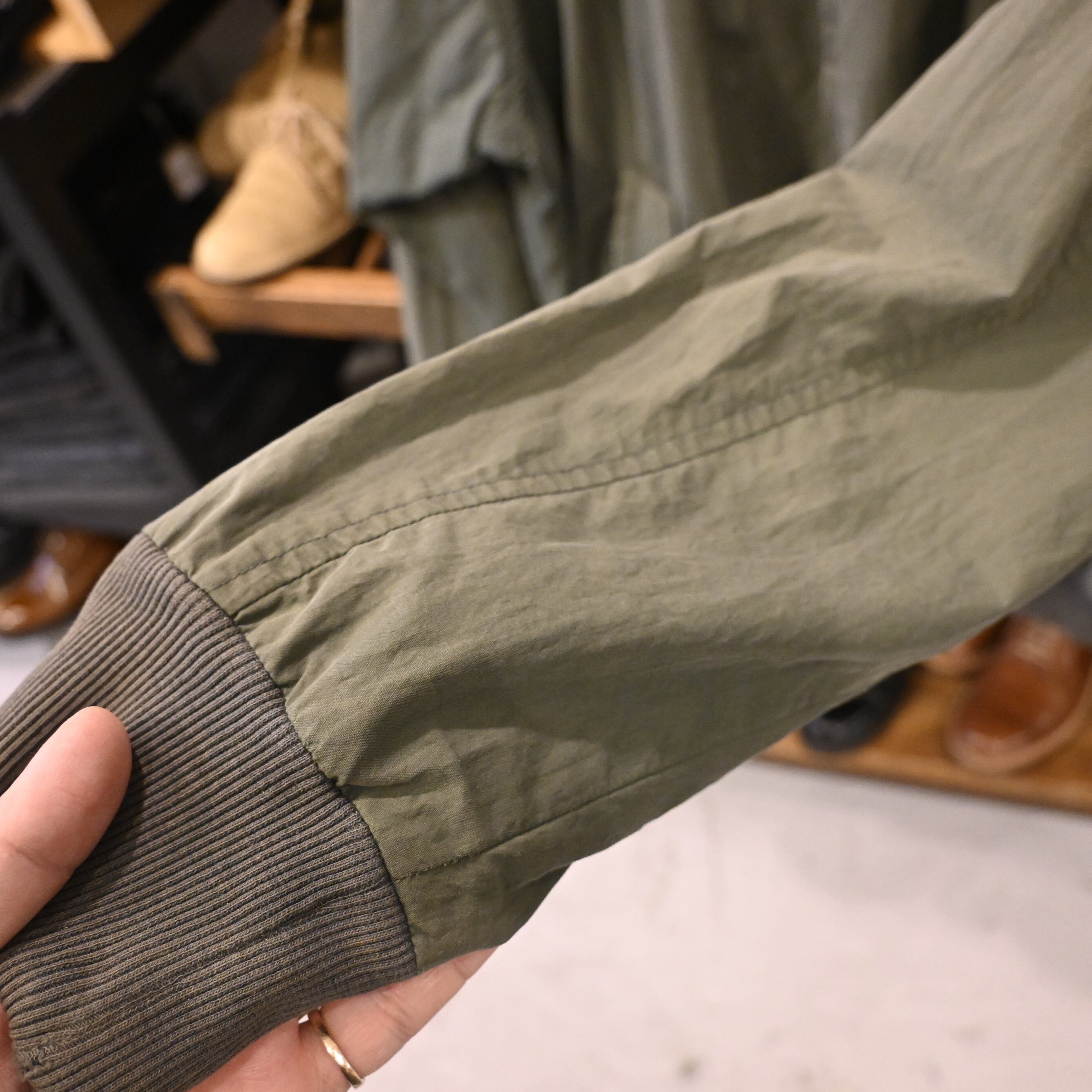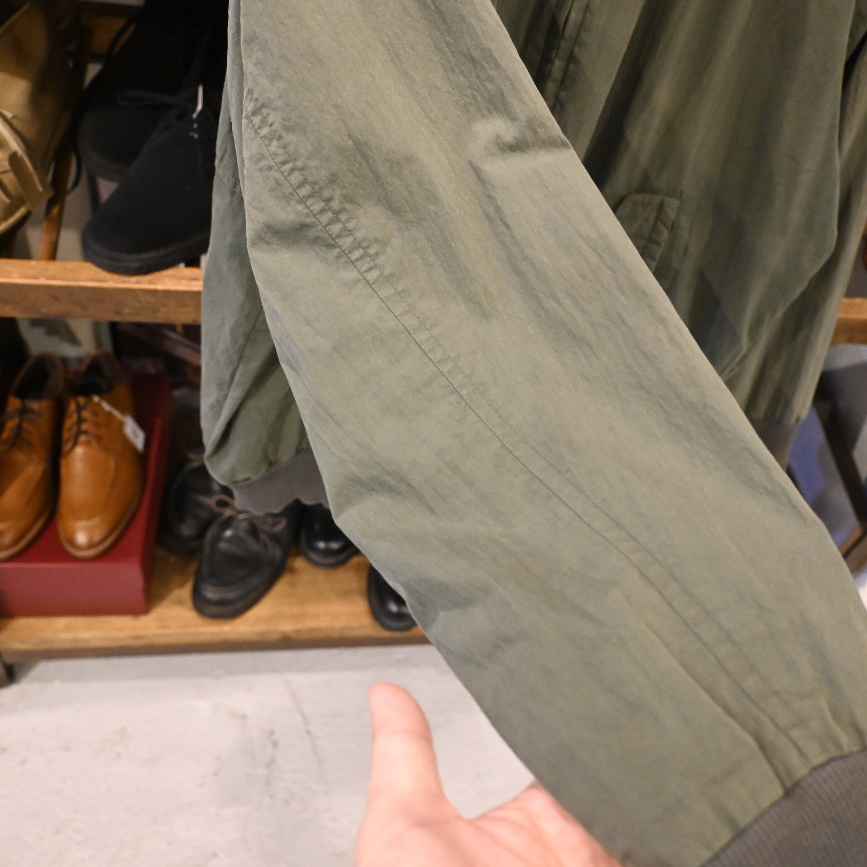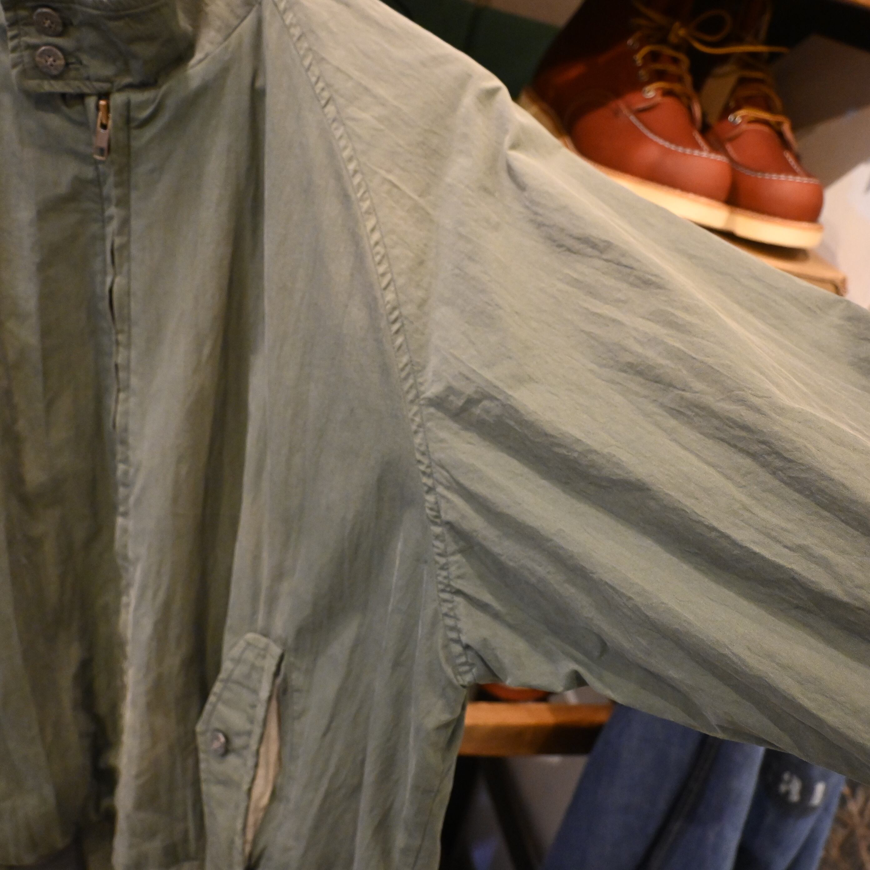 王道のハリントンらしいディテール(ラグランスリーブ・スタンドカラー・フラップ付きポケット)を備え、裏地はチェック柄仕様。コットン×ナイロン混紡の生地は経年変化でフェードしており、ヴィンテージならではの雰囲気を楽しめる一着です。