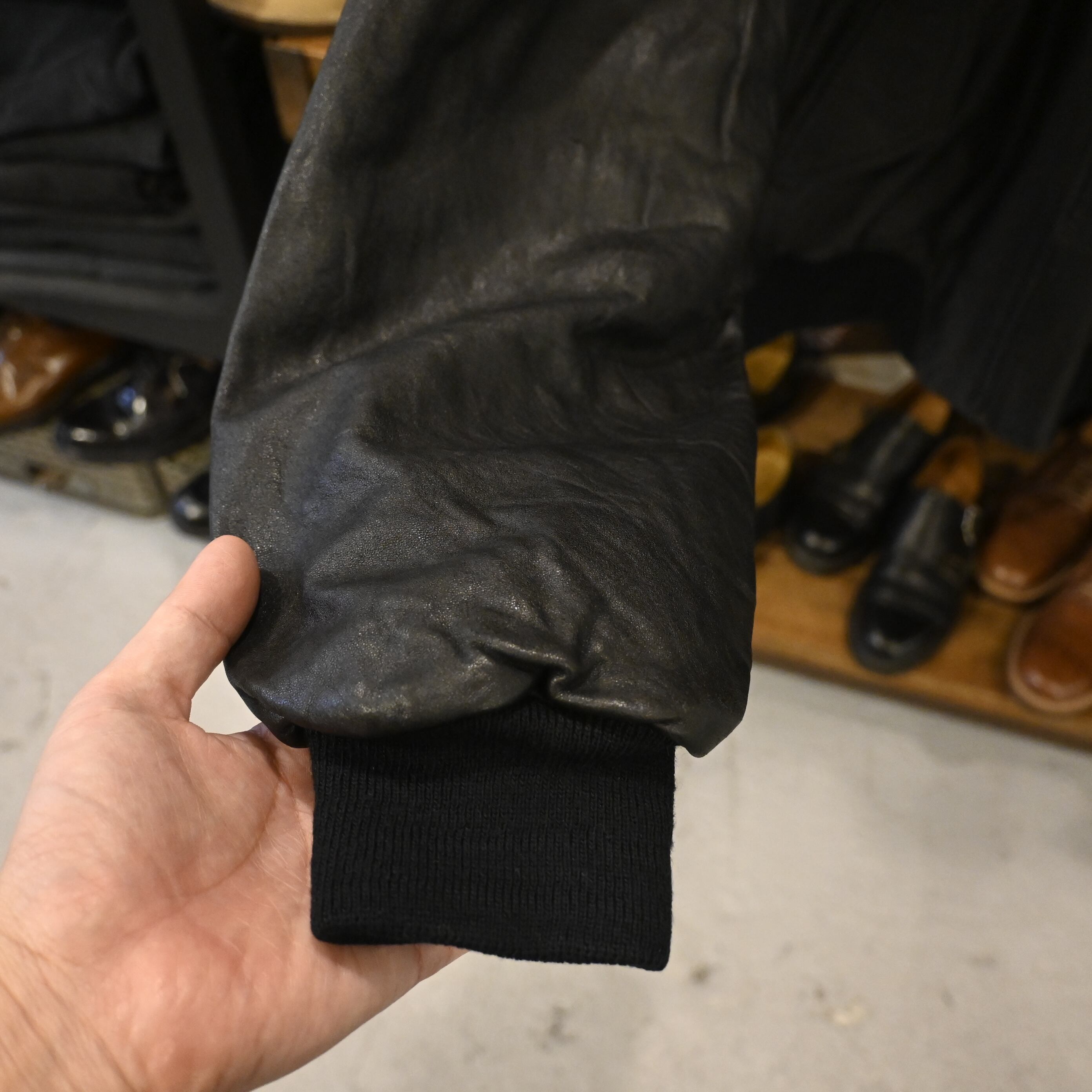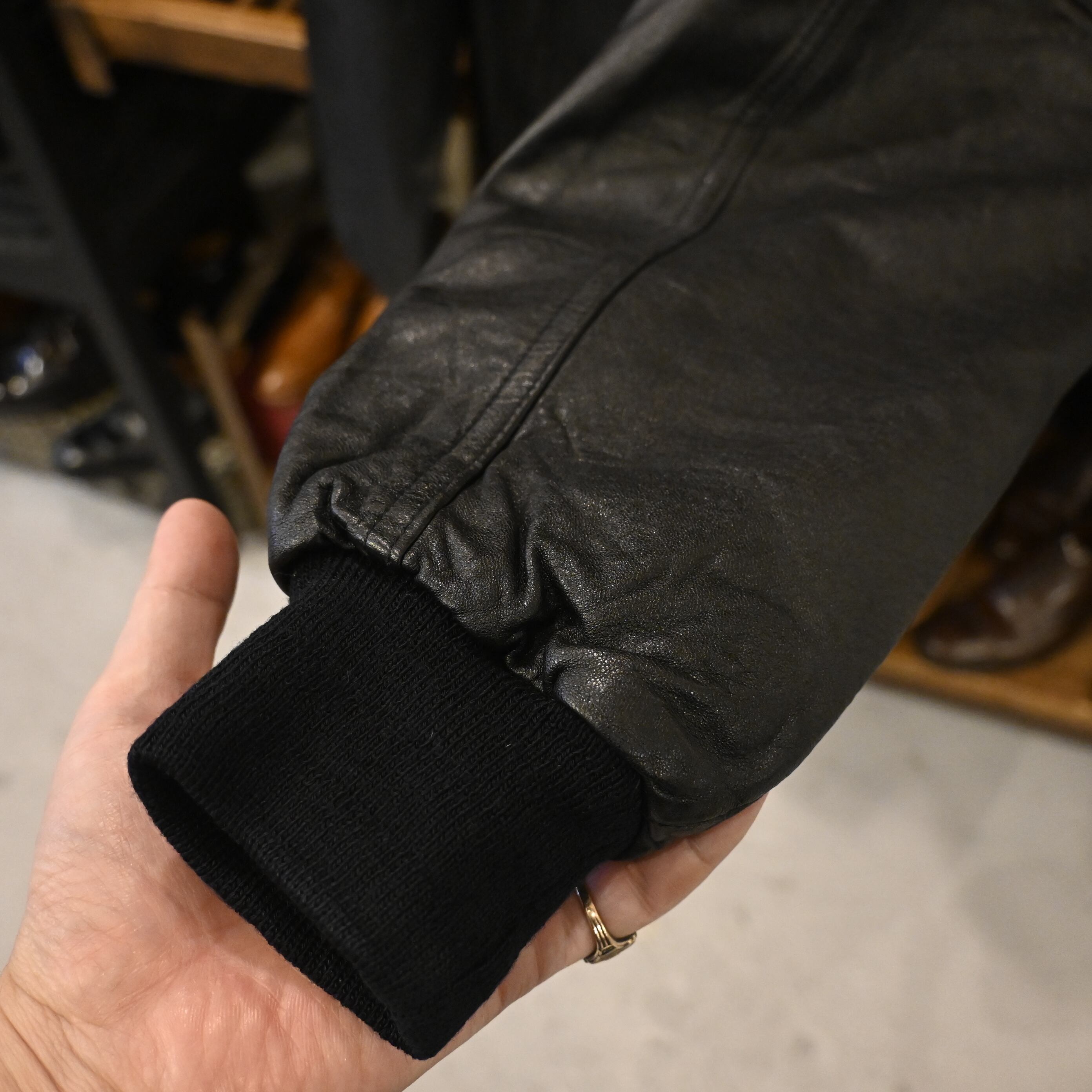 【コンディション】使用感あり。レザーにスレやシワ、細かなキズあり。裏地ナイロン部分に軽度の使用感。目立つ汚れやダメージは無く古着らしい風合いをお楽しみいただけます。