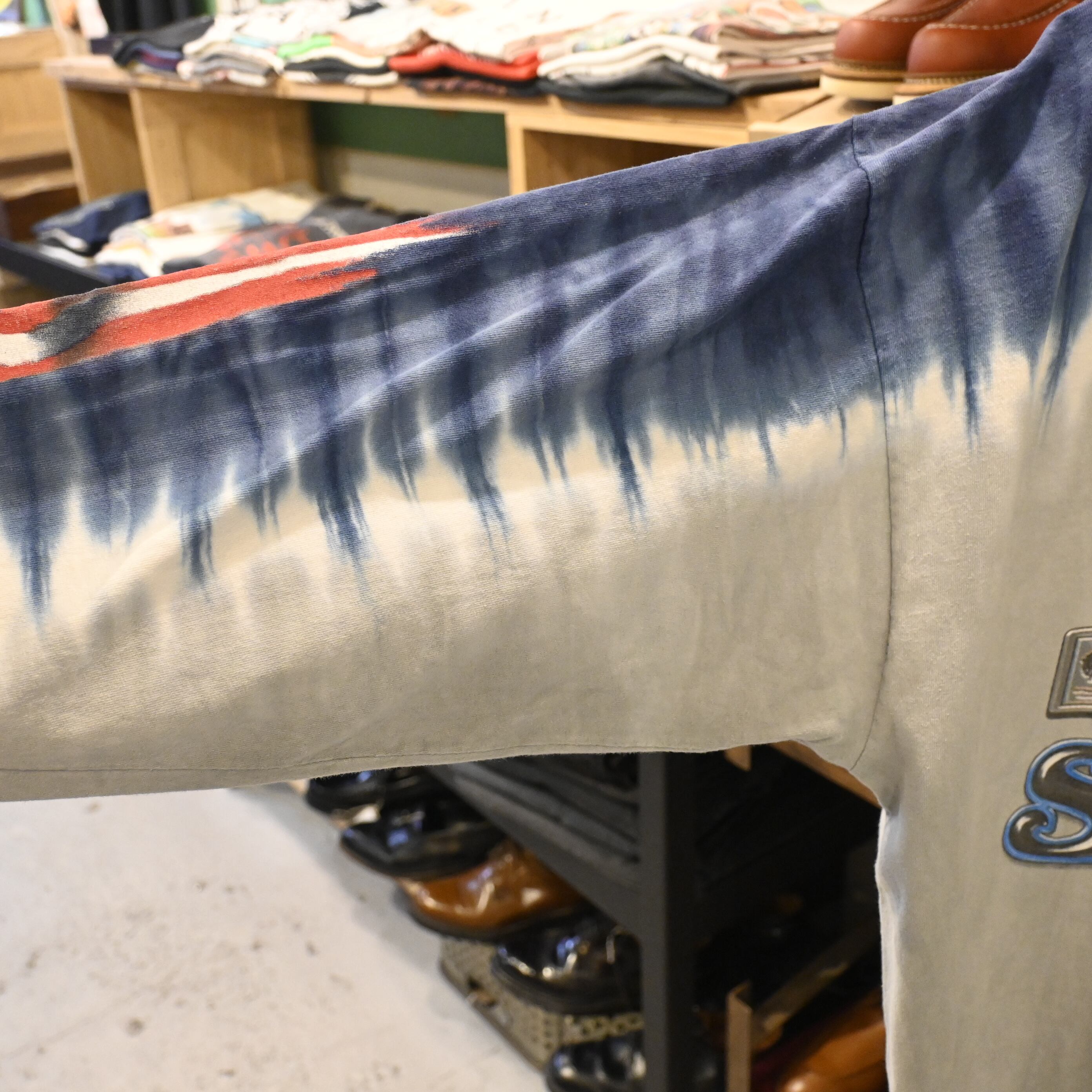 USA製・タイダイ染めのボディに加え、袖には星条旗モチーフのプリントが入り、細部までこだわりの詰まった一枚。ストリートスタイルやライダースとのレイヤードにも相性抜群です。