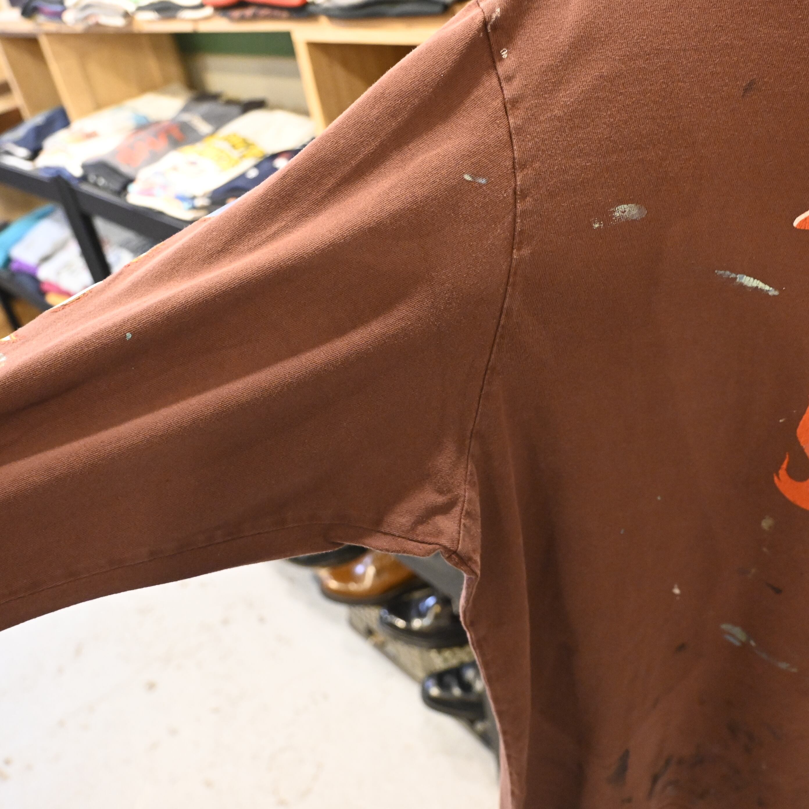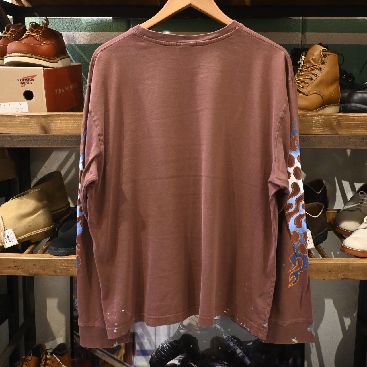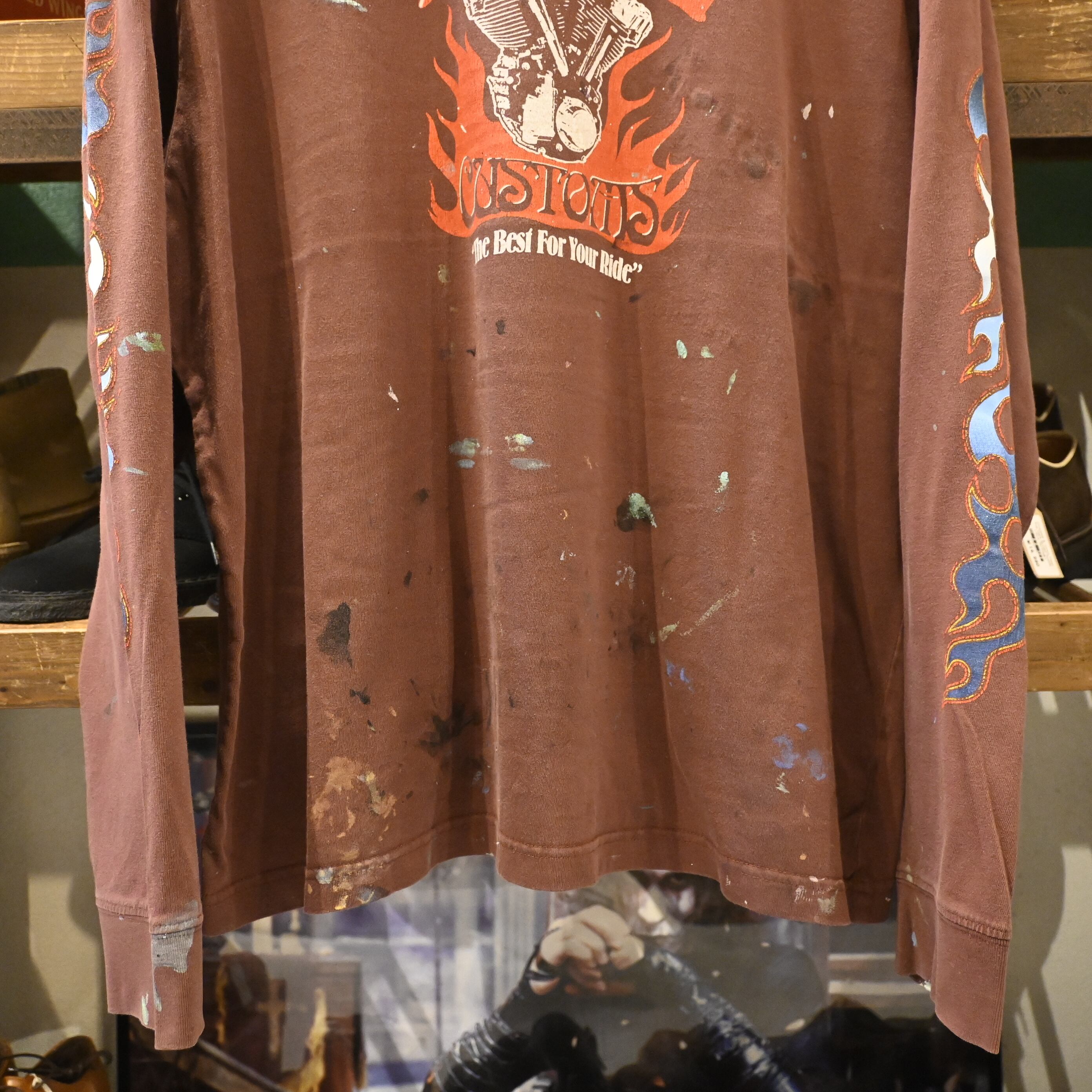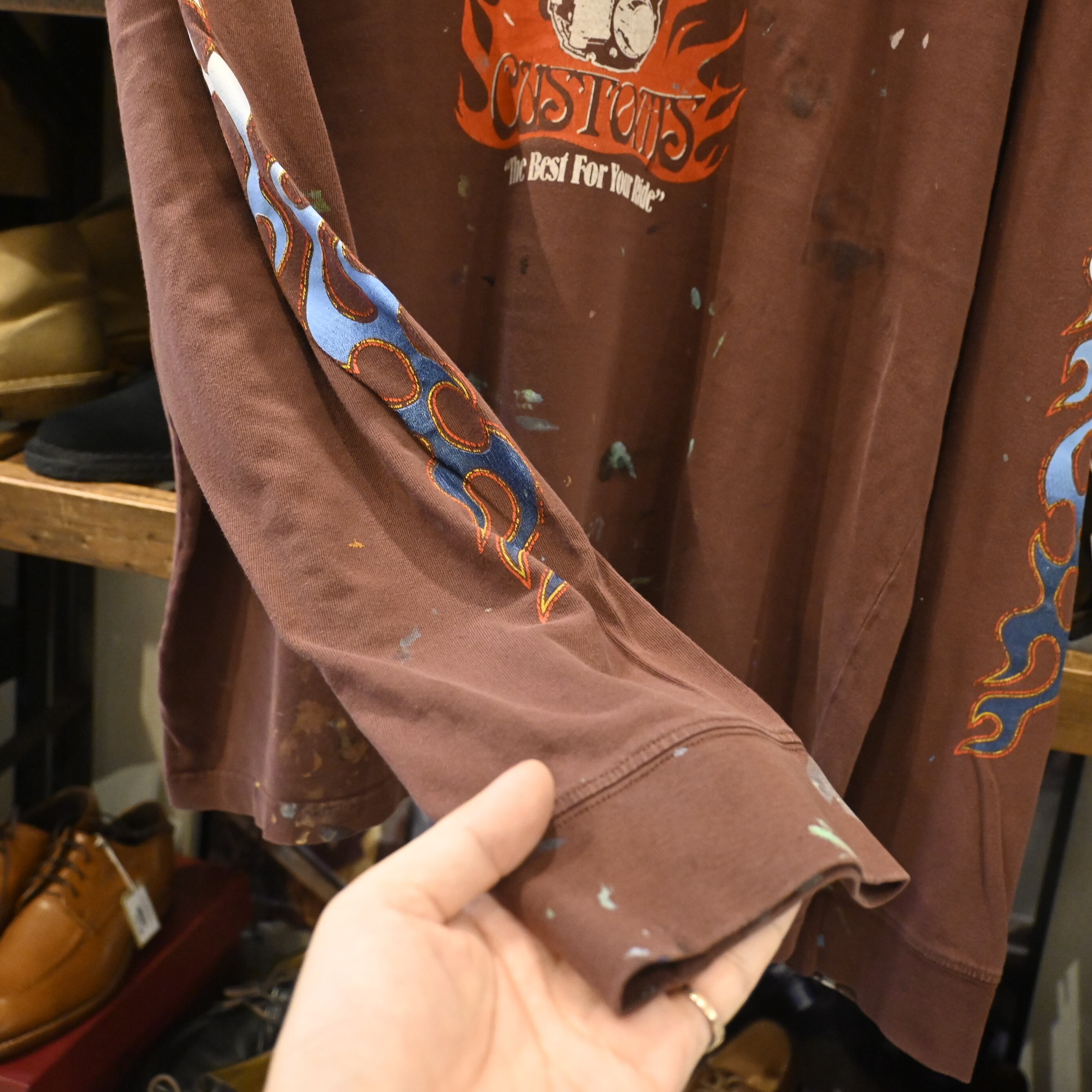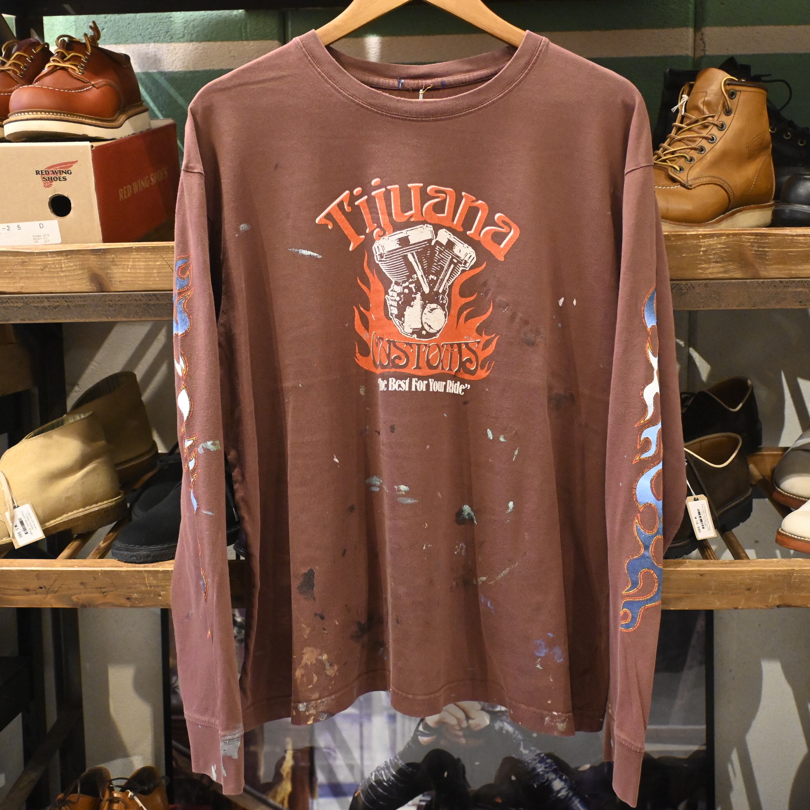Tijuana Customs ロングスリーブTシャツ/ブラウン/フレイムスリーブ/ペンキ飛び/ショップ系(90s〜00s頃 推定)