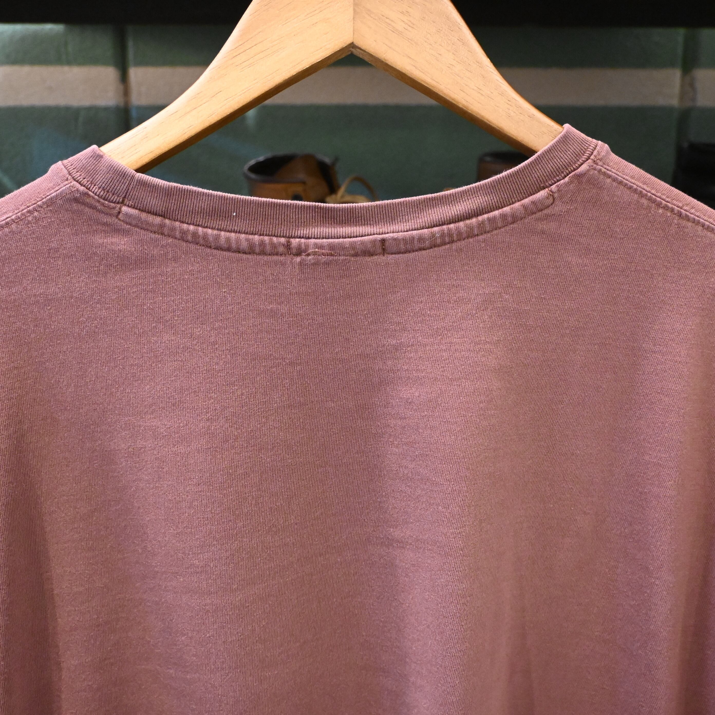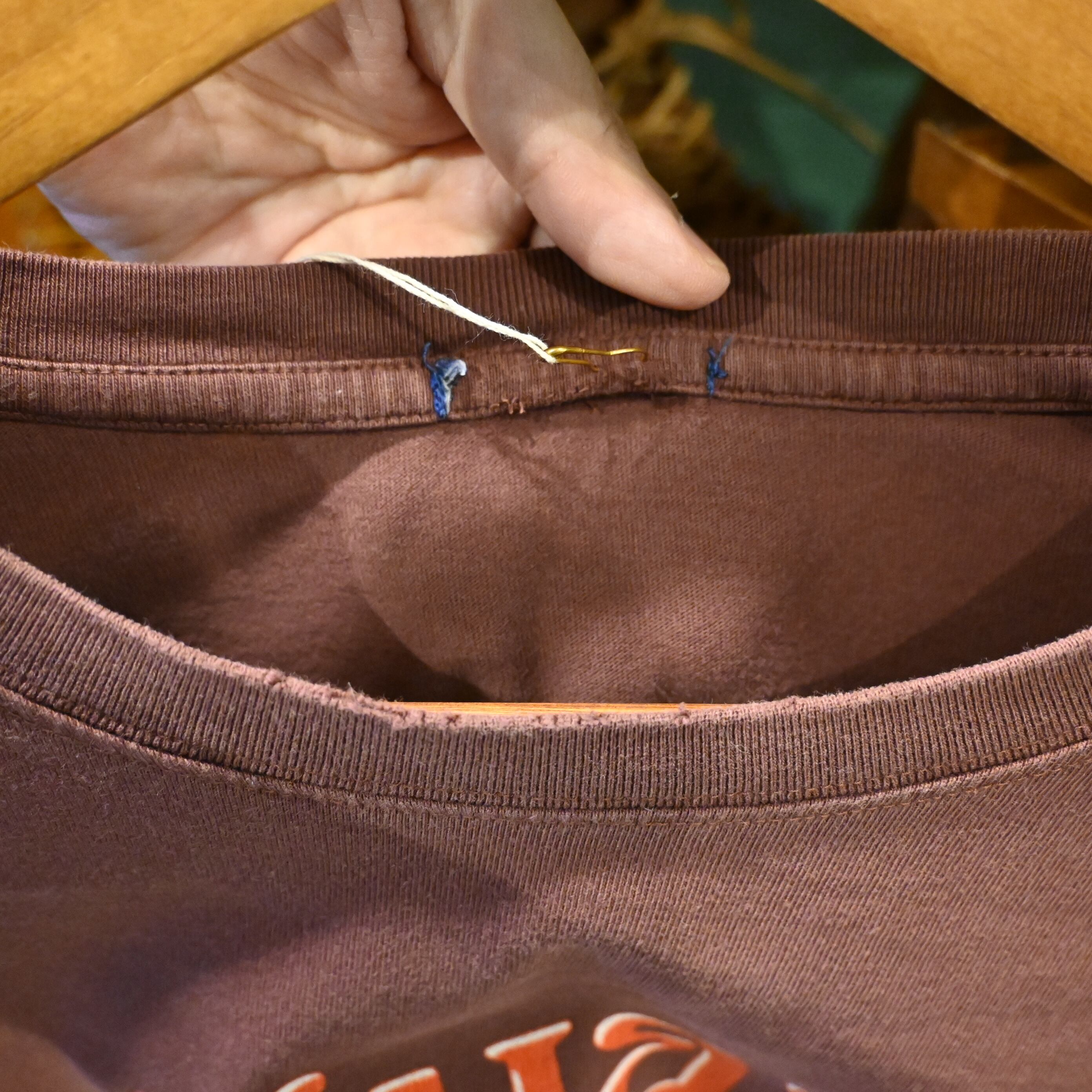 胸にはVツイン×フレイム、両袖にフレイムパターンが入るインパクト抜群のデザインです。ボディ全体に見られるペンキの飛び・擦れは作業着由来のようなリアルなエイジングで、同じ表情は二つとない一点物。ブラウン、バーガンディー系の褪色トーンと相まって、ワーク・ストリートにすっと馴染みます。