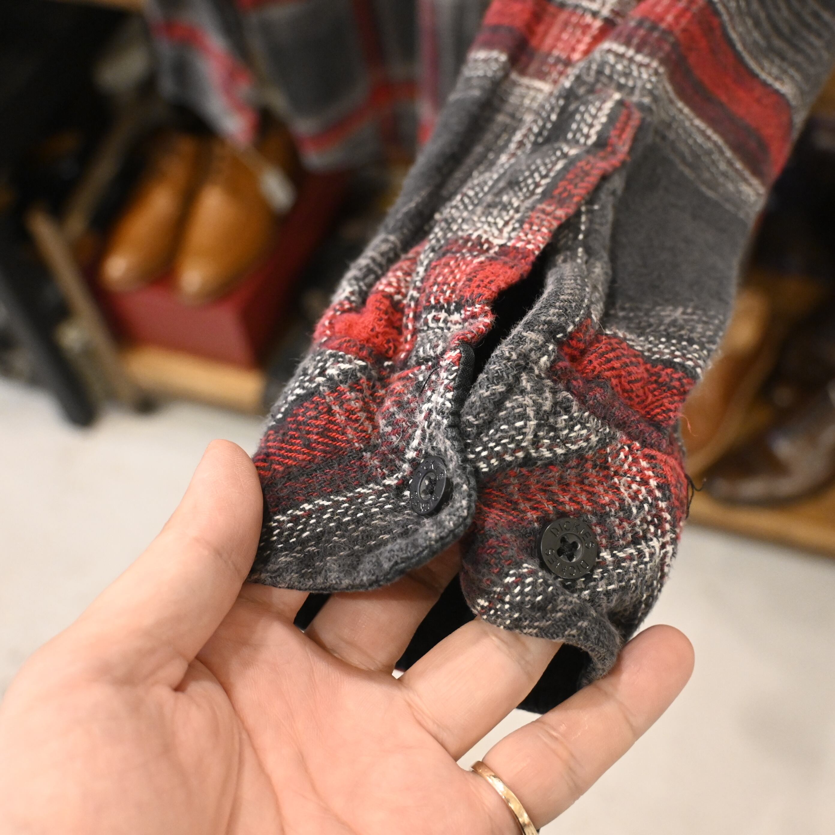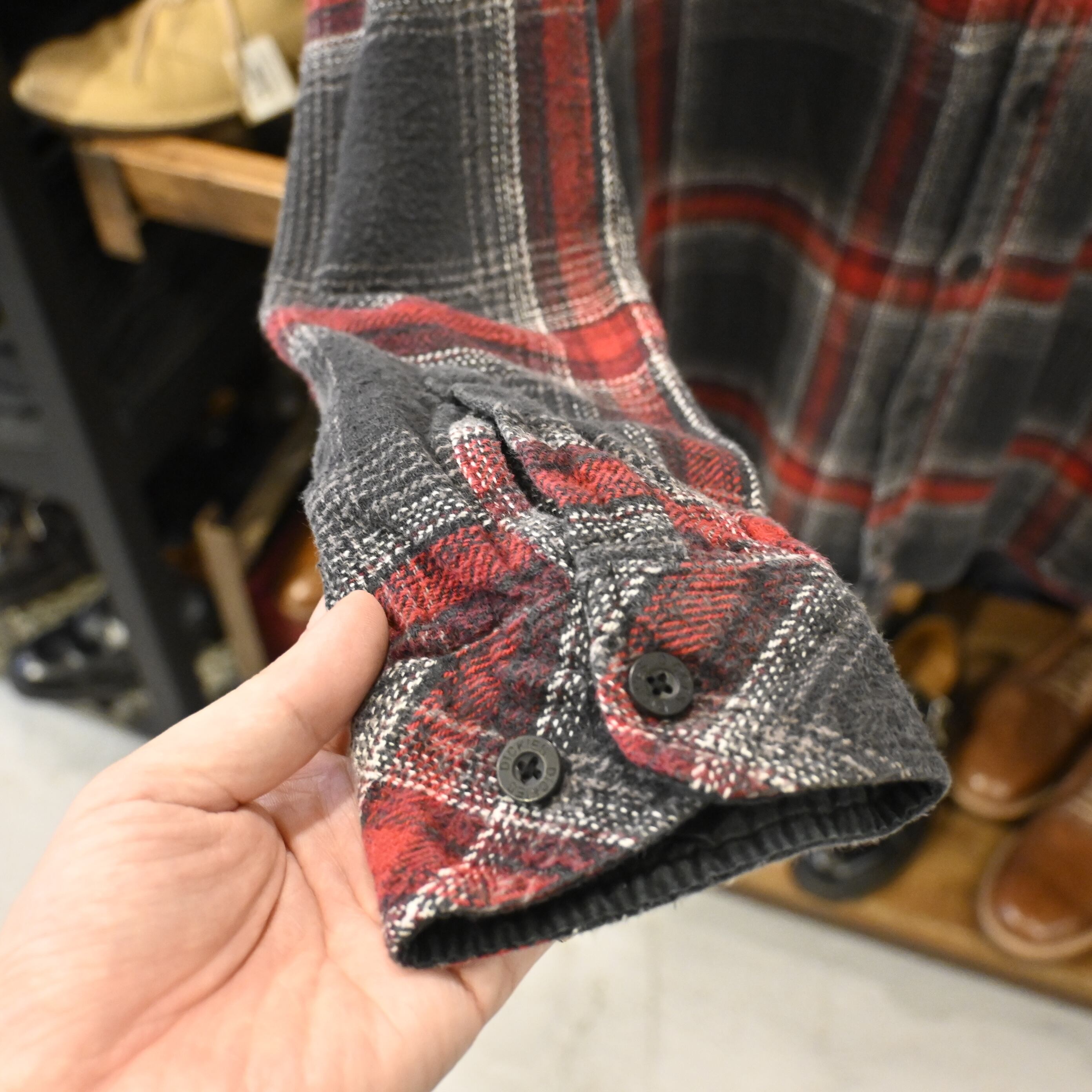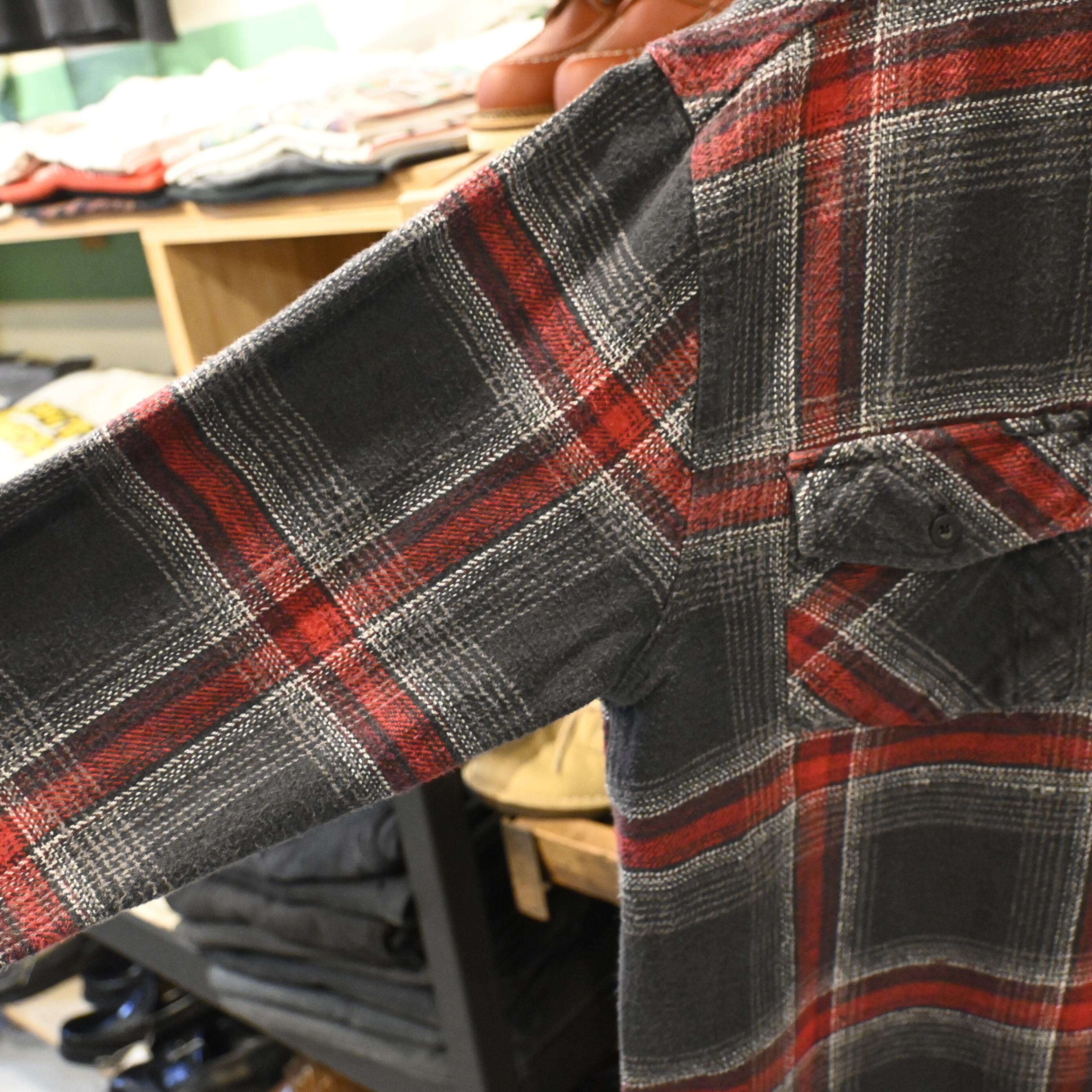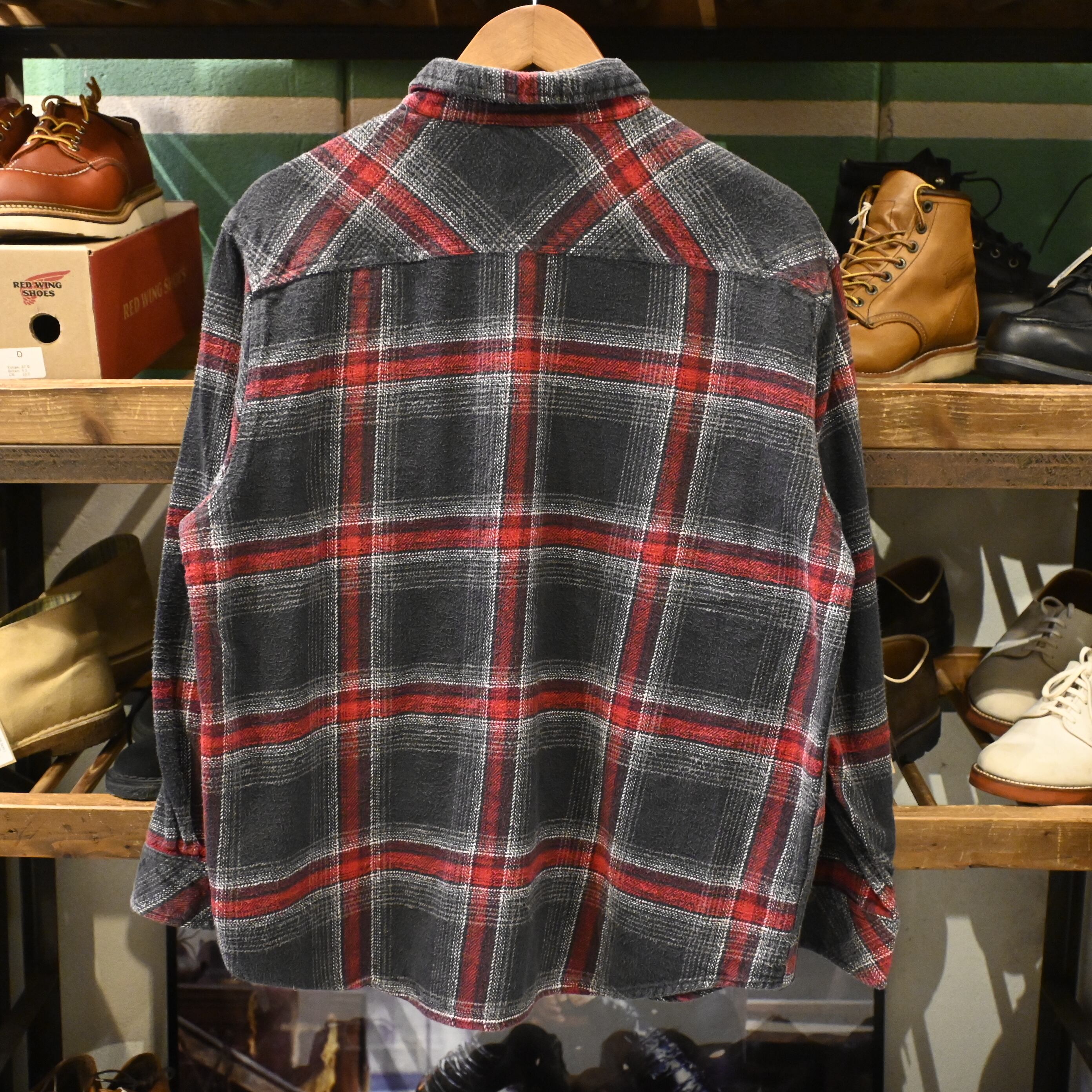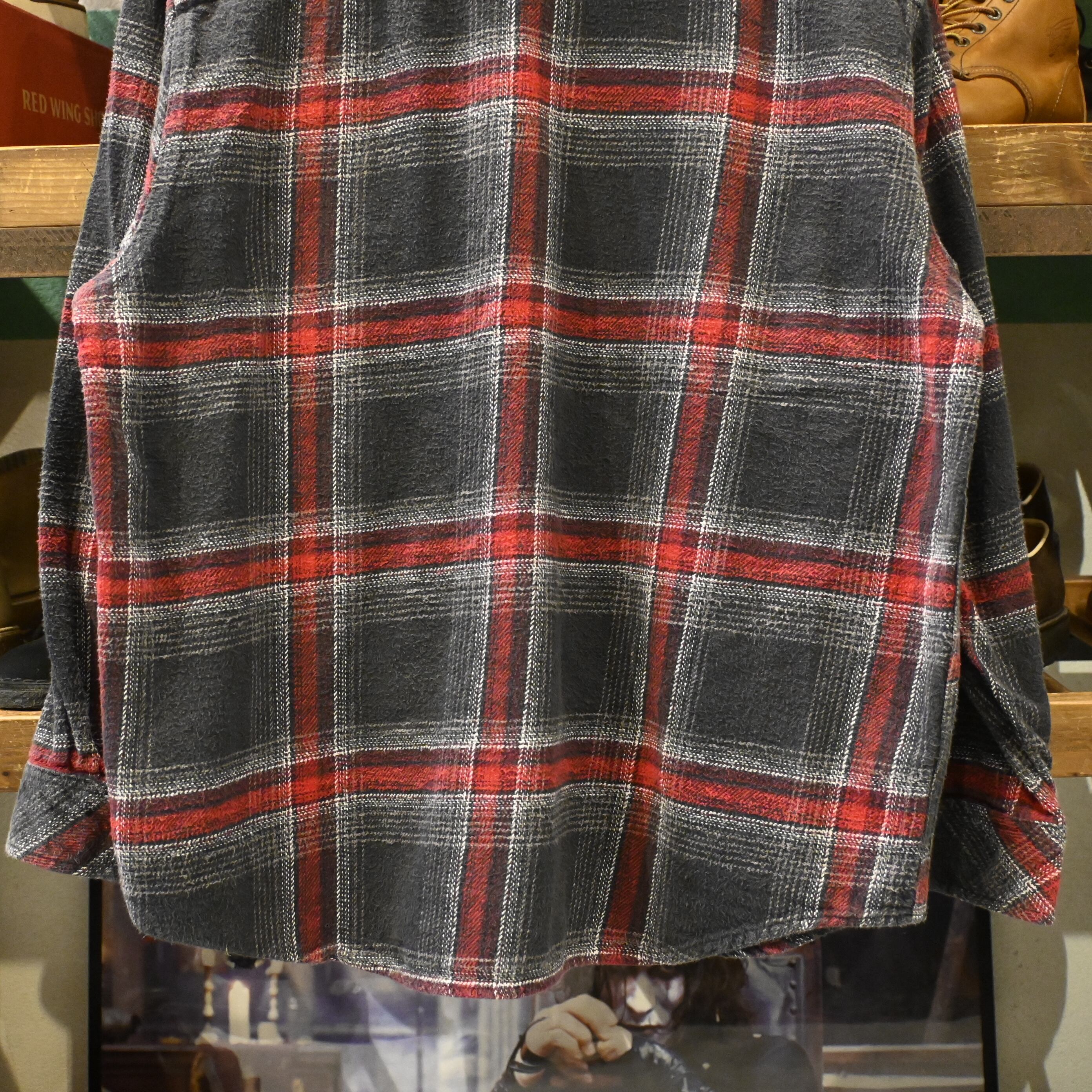 ブラックとレッドを基調としたブロックチェックが目を惹くデザインで、肉厚でしっかりとした生地感はワークウェアならではのタフさを感じさせます。