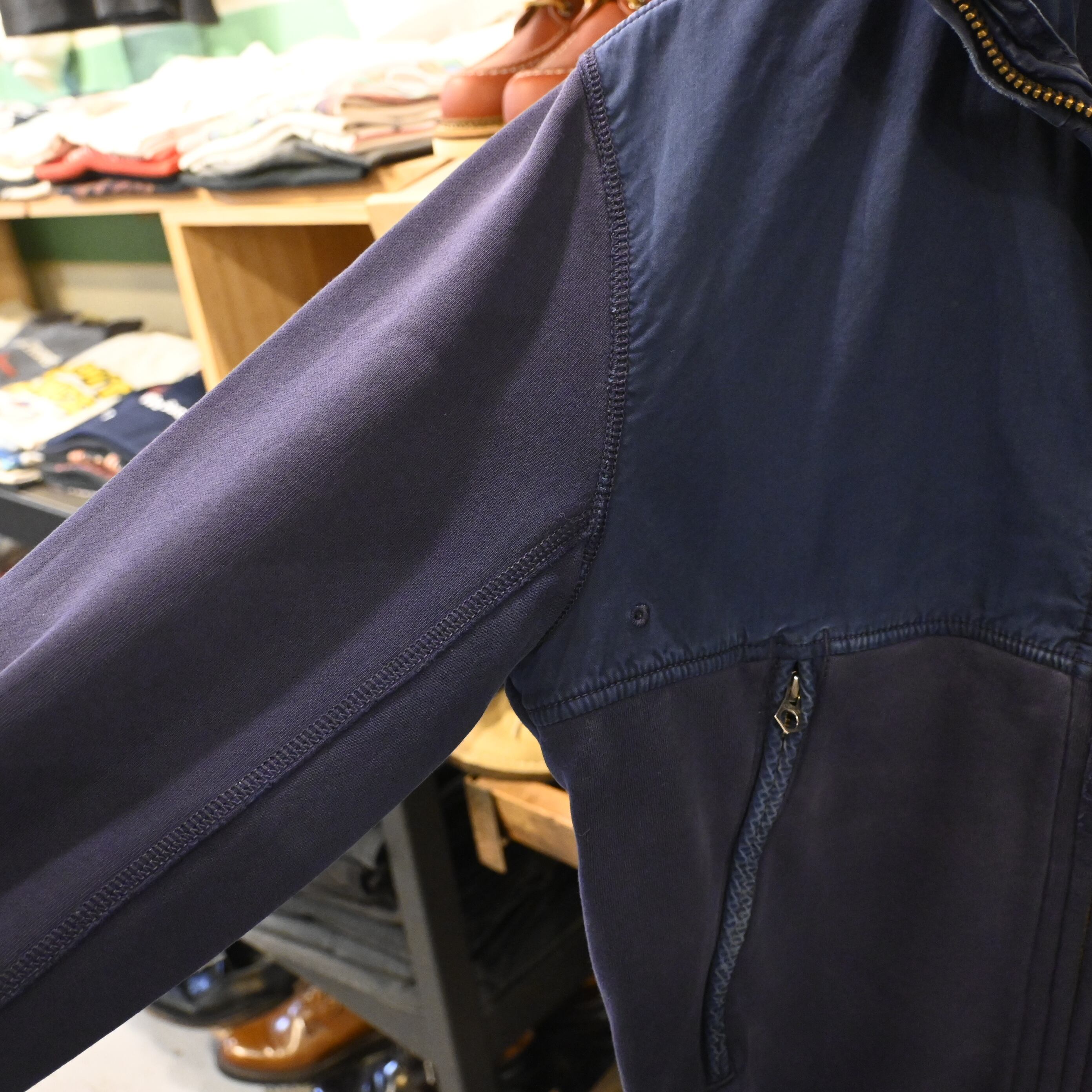フロント上部はナイロン素材の切り替え、下部はスウェット生地で構成されており、都会的でスポーティーなデザインが特徴です。