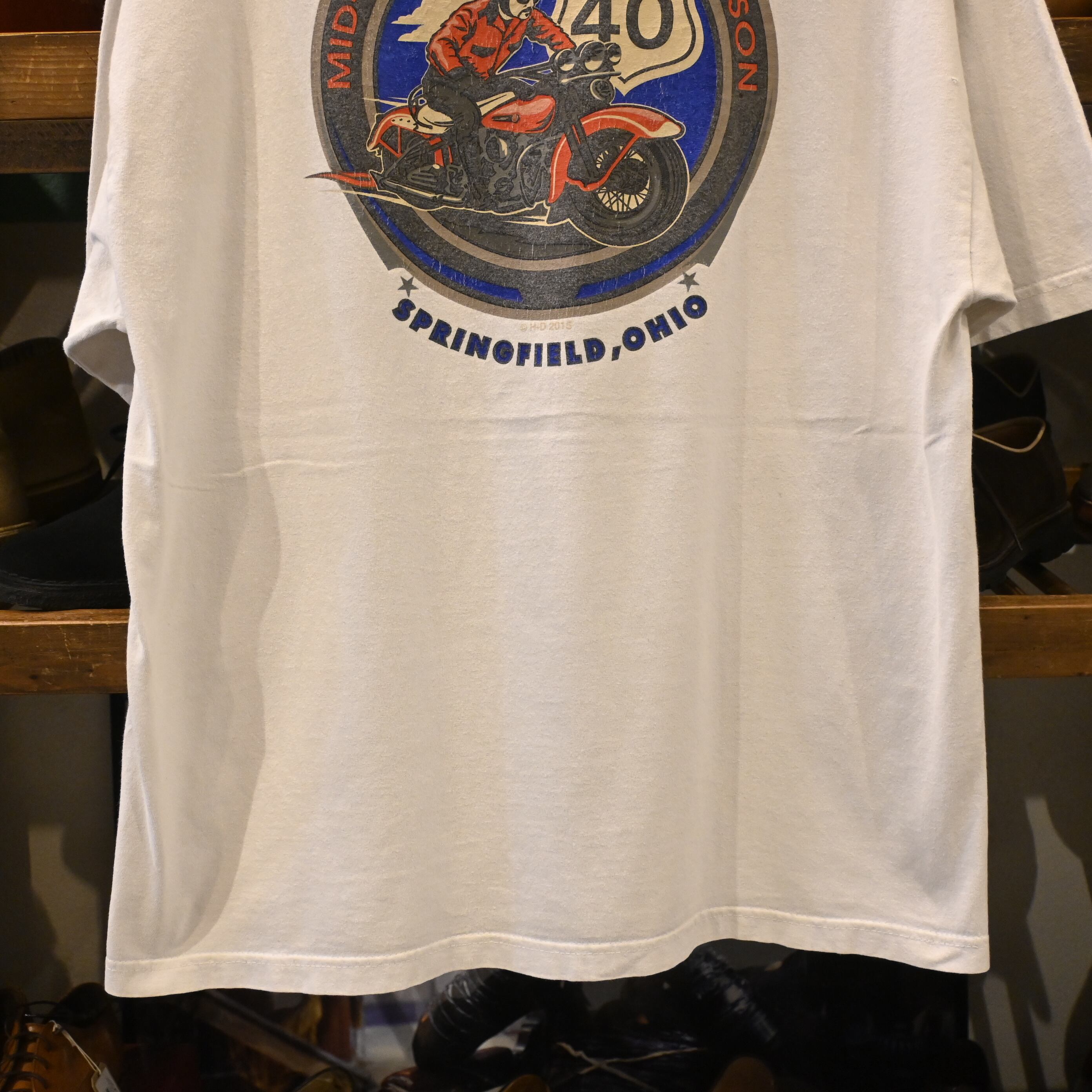フロントにスカルメイクの女性、バックに「MID-OHIO HARLEY-DAVIDSON / US ROUTE 40」グラフィックが大きく入った両面プリントTシャツです。