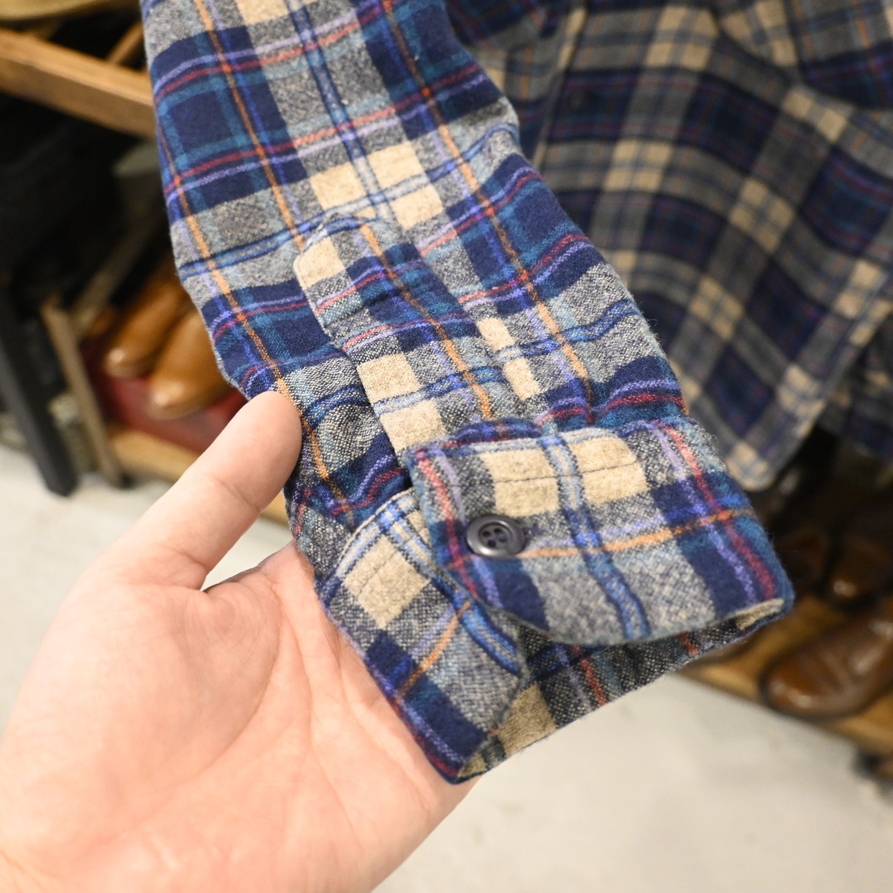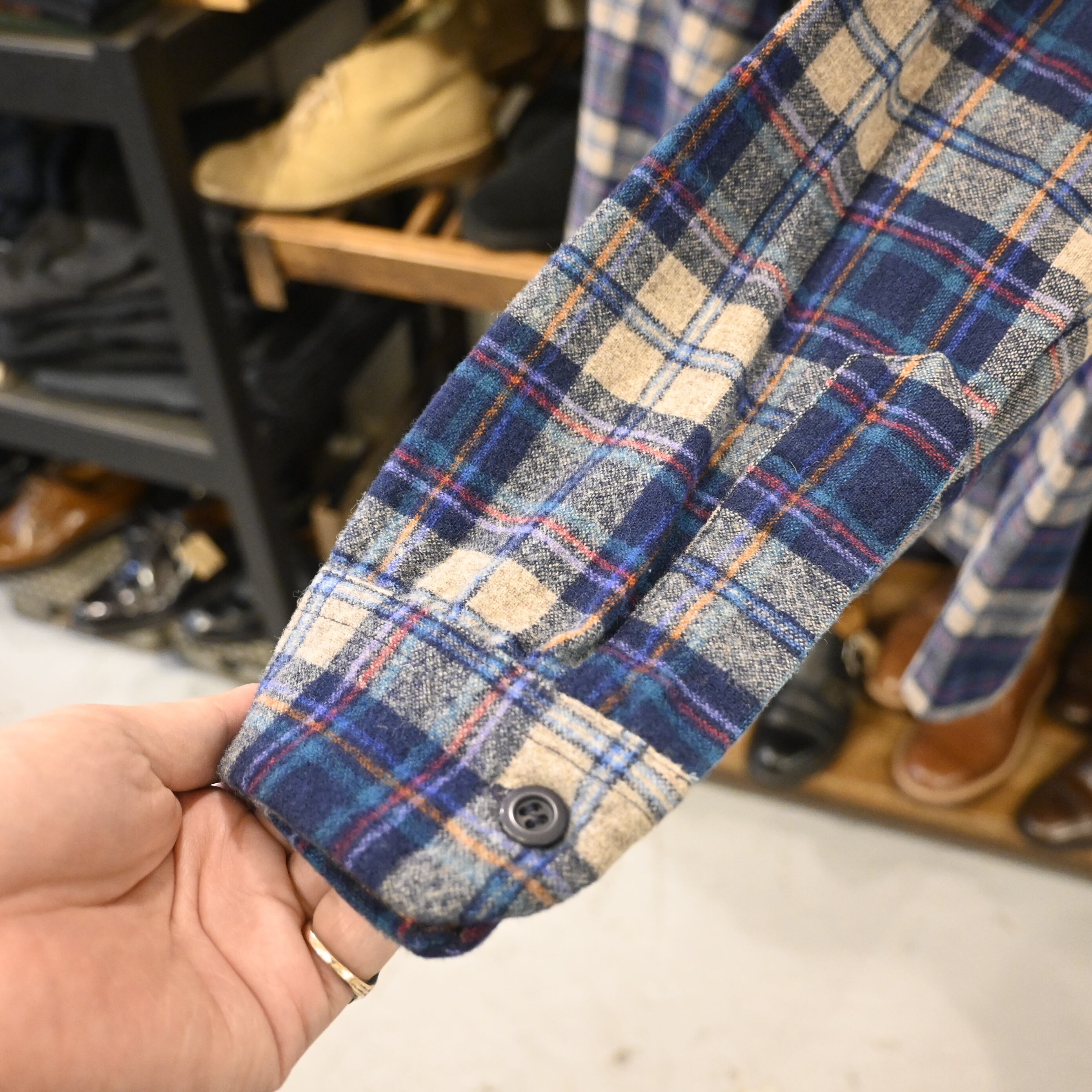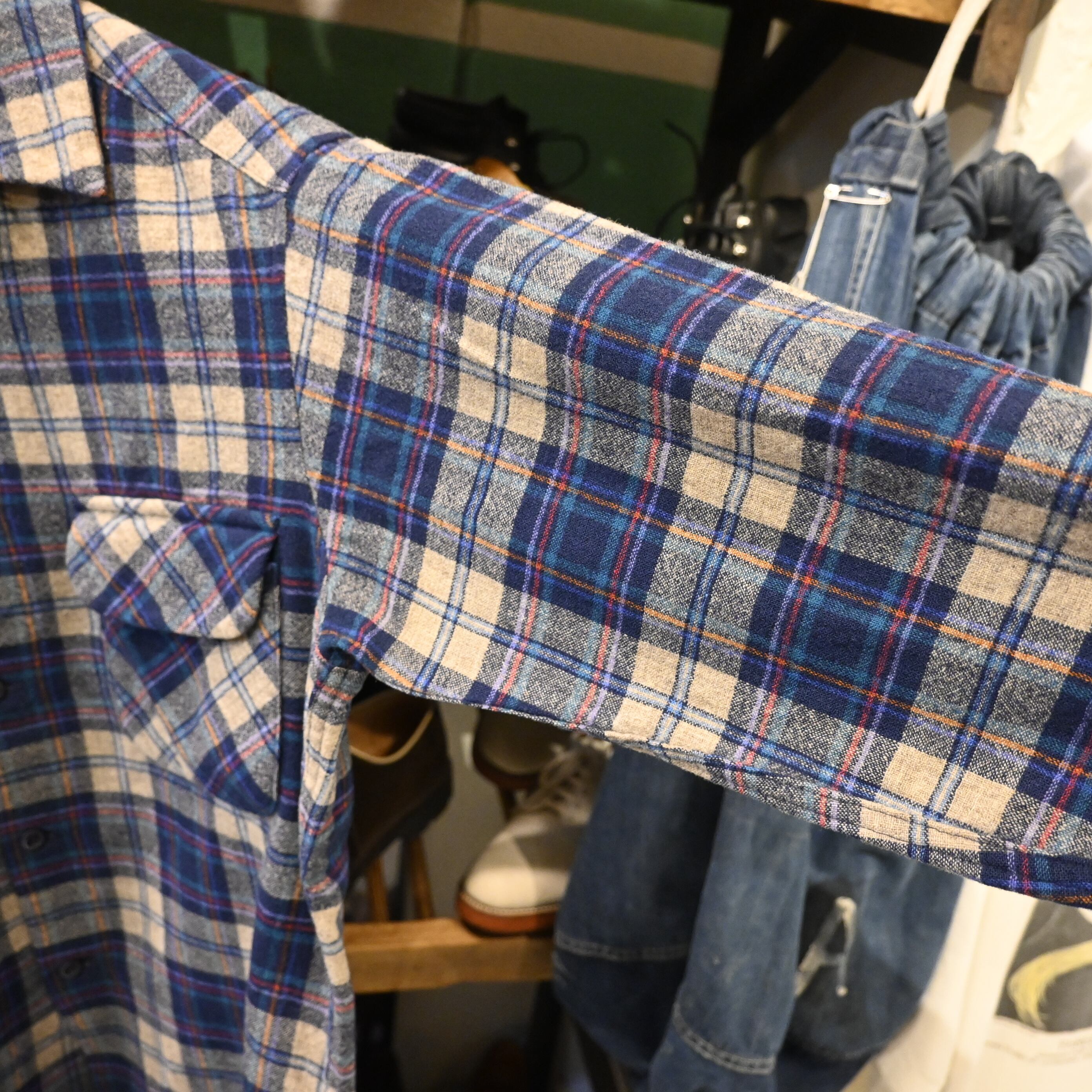 クラシックなネイビー×オフホワイトのチェック柄で、胸ポケットはバイアス仕様。ヴィンテージらしい存在感と上質なウールの質感が魅力の一着です。