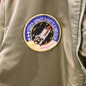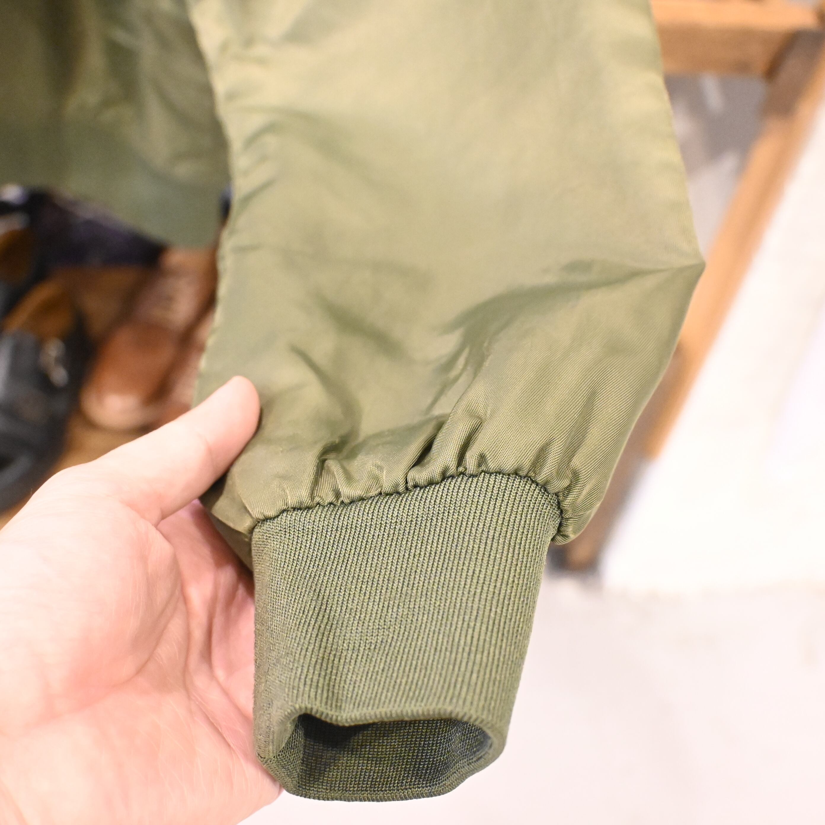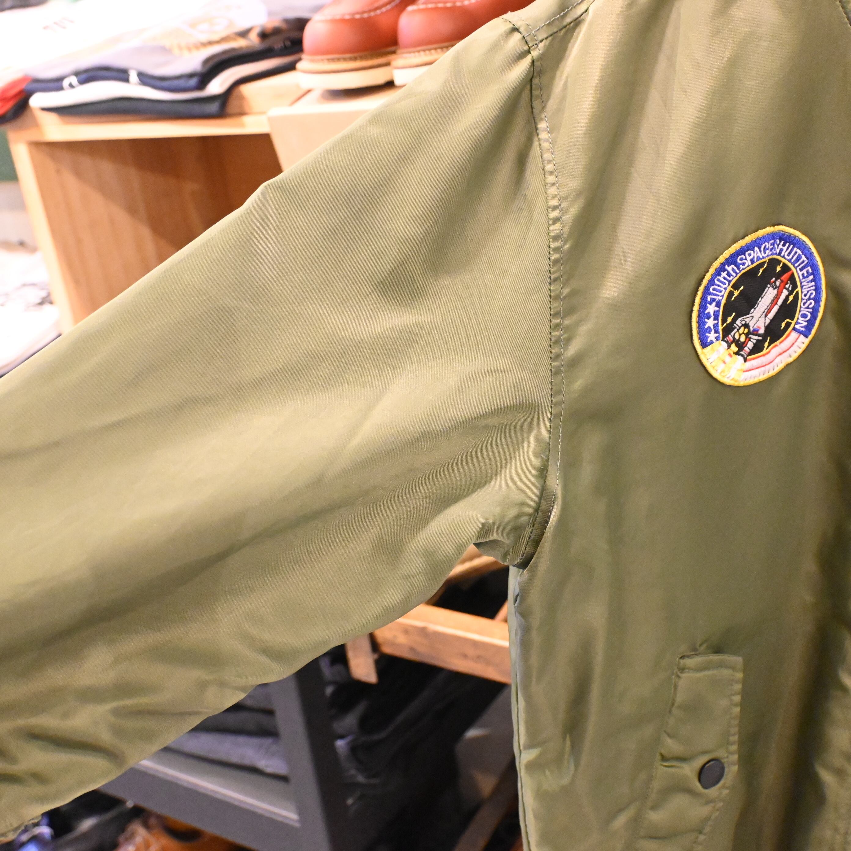 王道のオリーブドラブに、NASAワッペンやスペースシャトルミッションのパッチが映える存在感抜群の一着です。裏地は鮮やかなオレンジで、リバーシブル仕様ならではの雰囲気も楽しめます。