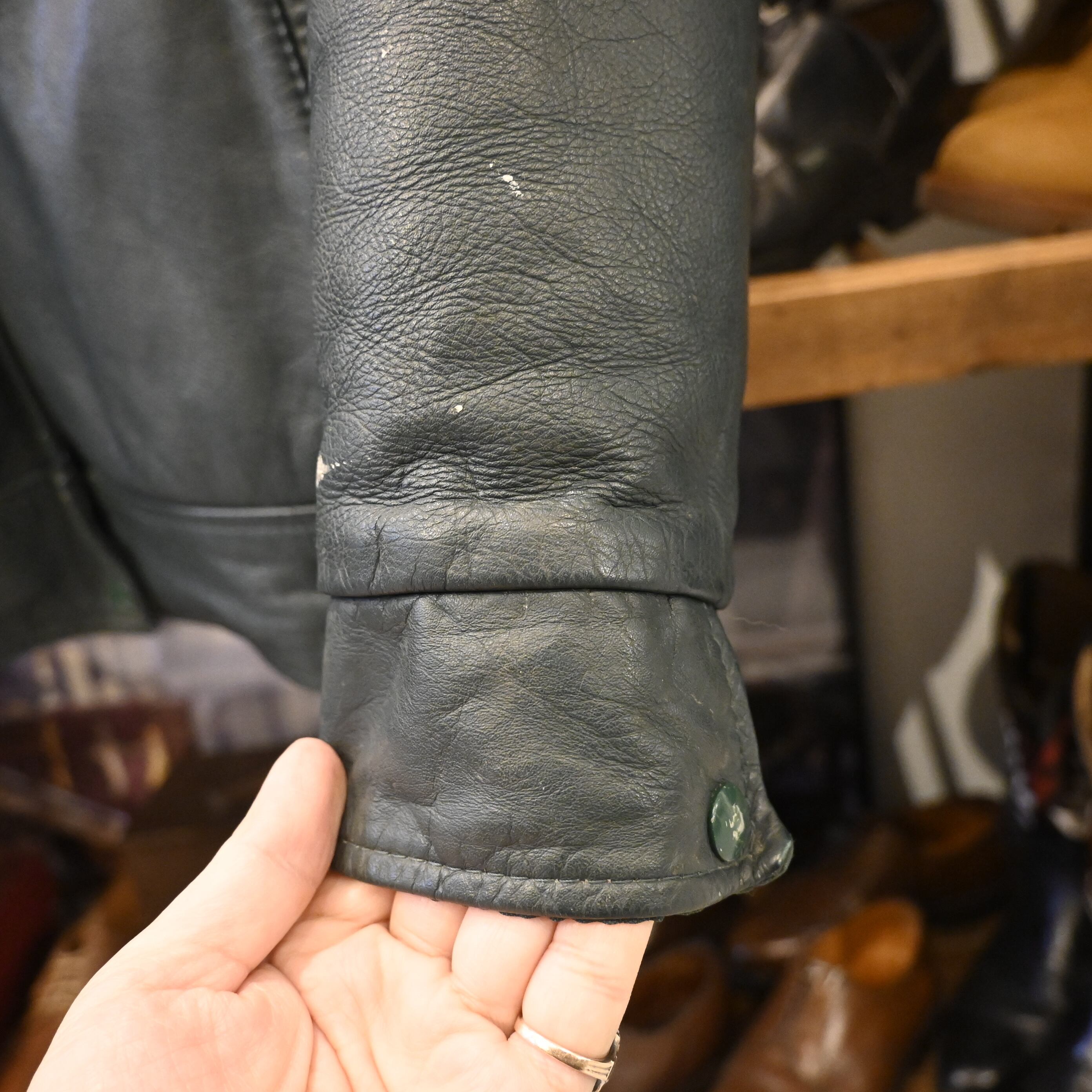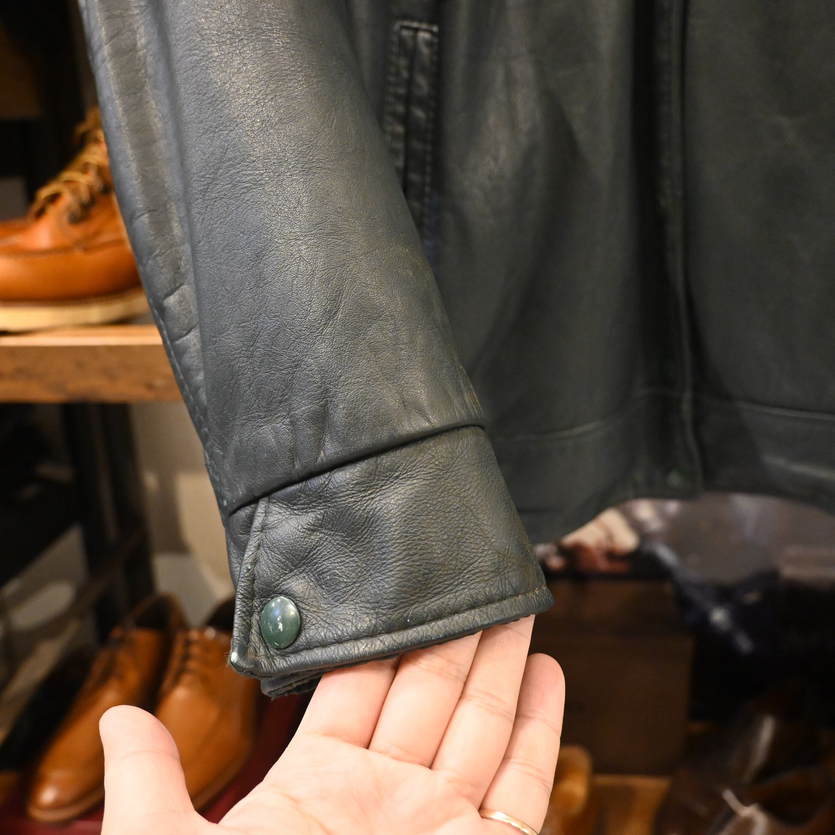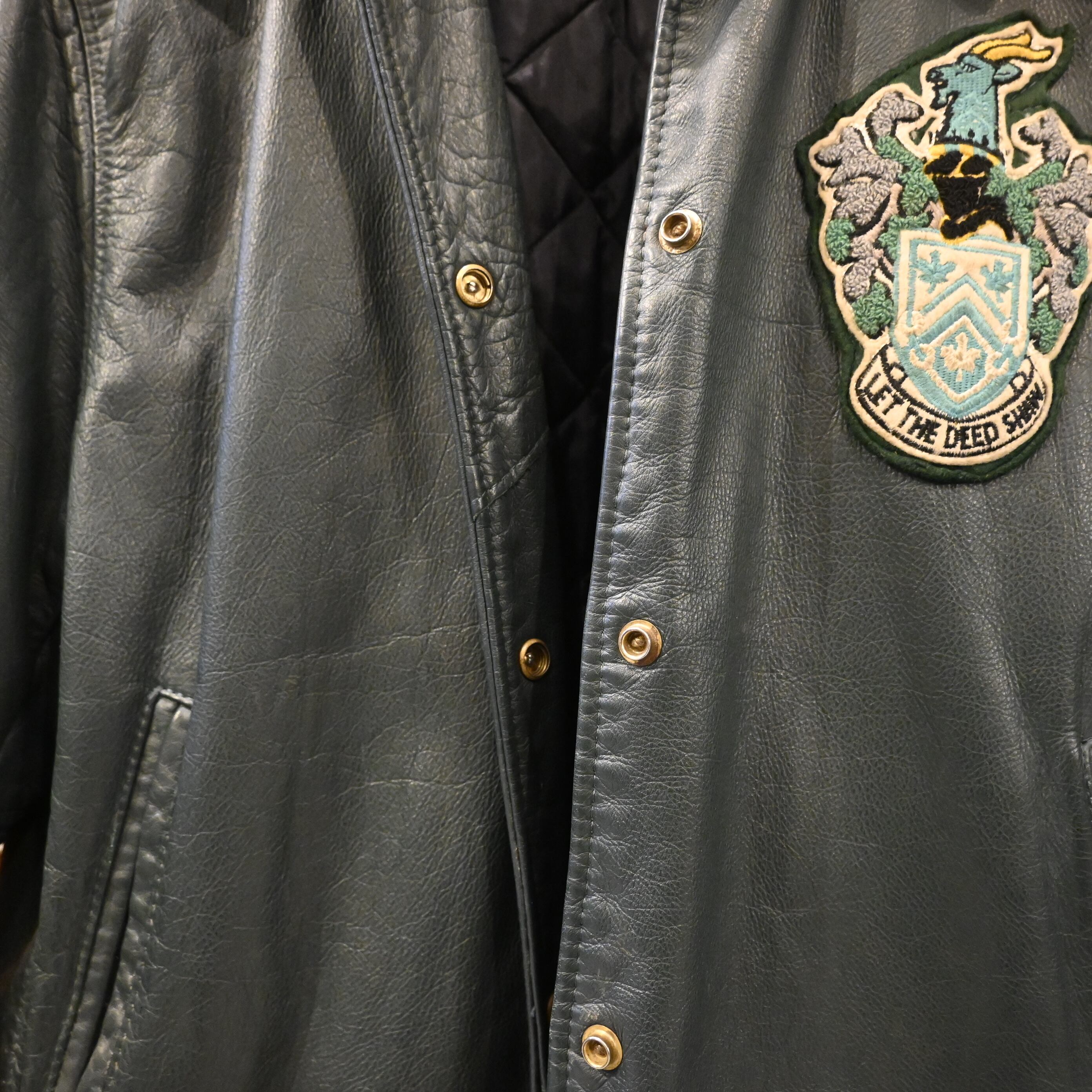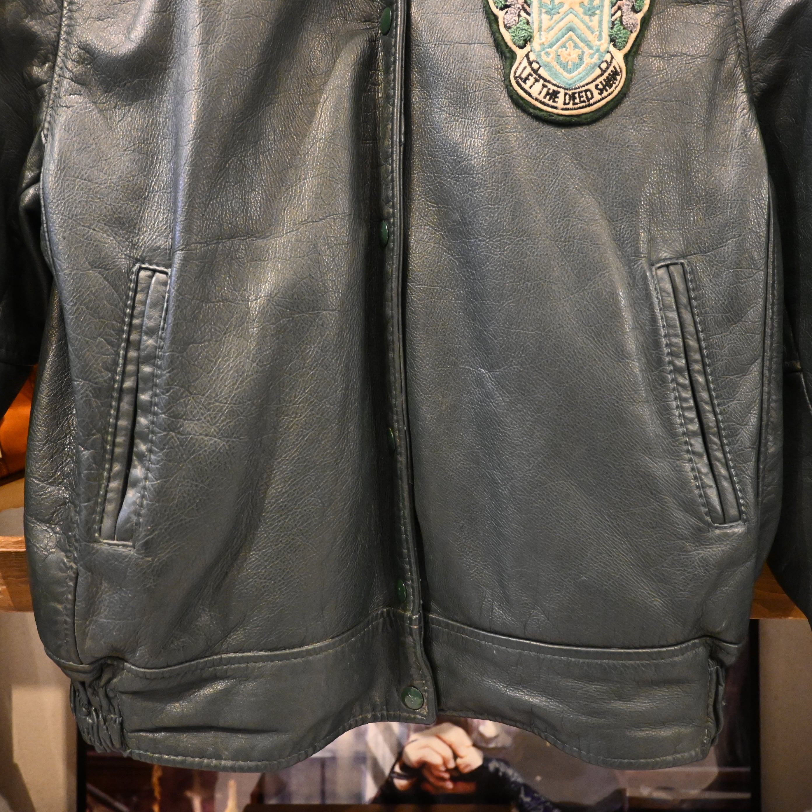 カレッジやスクールチームのオーダーメイドジャケットとして制作された可能性が高く、カスタム要素を備えた希少な一着です。肉厚で重厚感ある本革を使用し、ヴィンテージならではのスレやダメージが雰囲気を高めています。