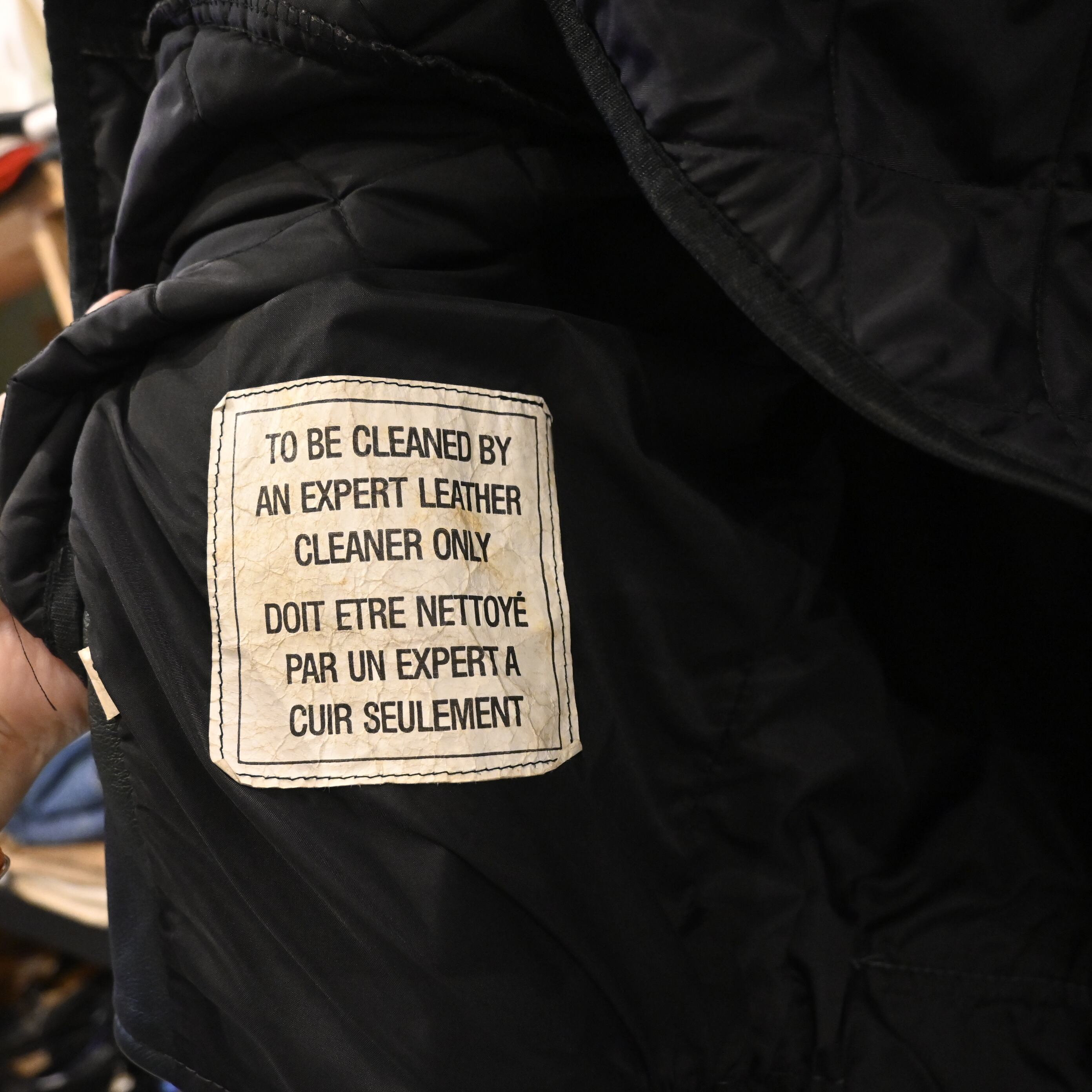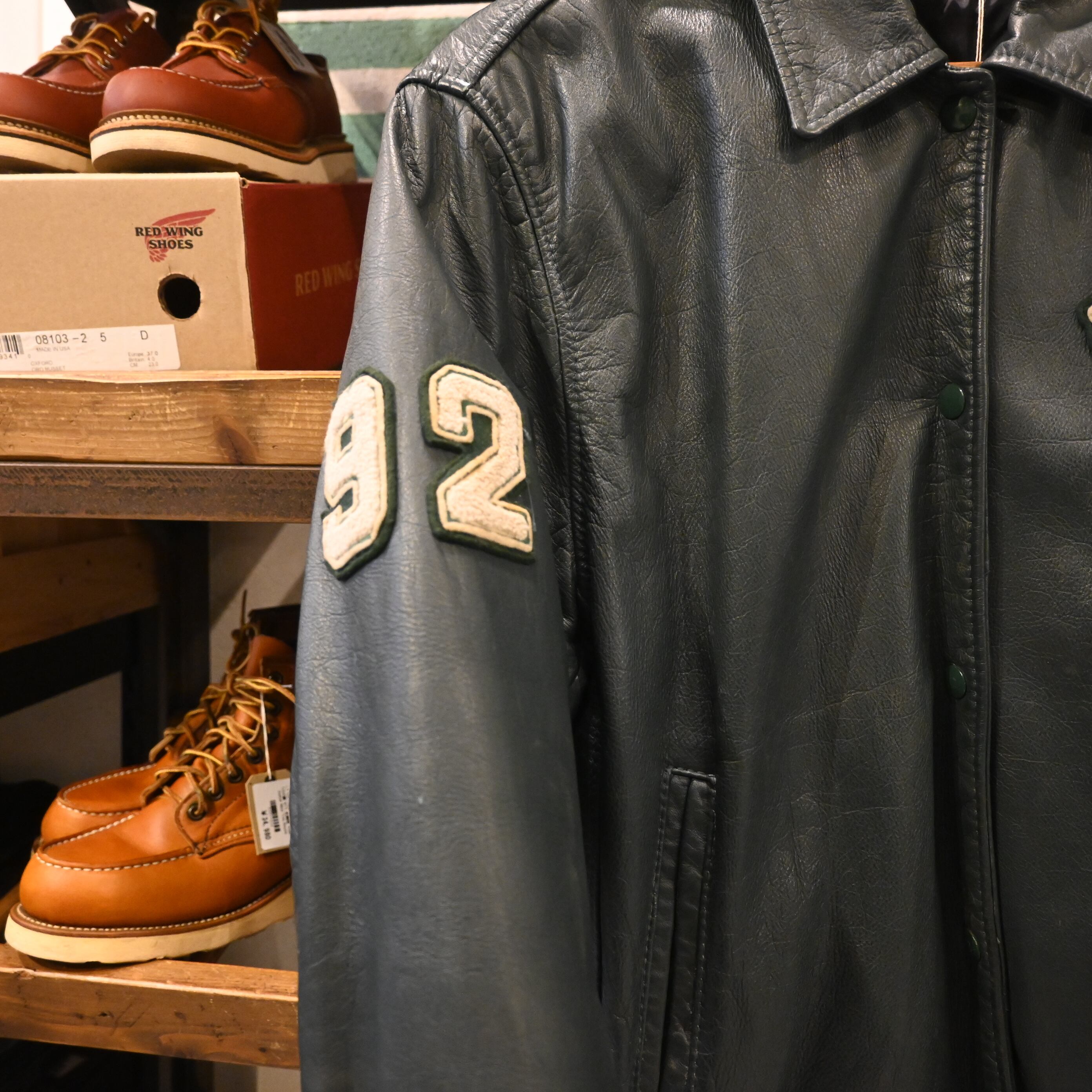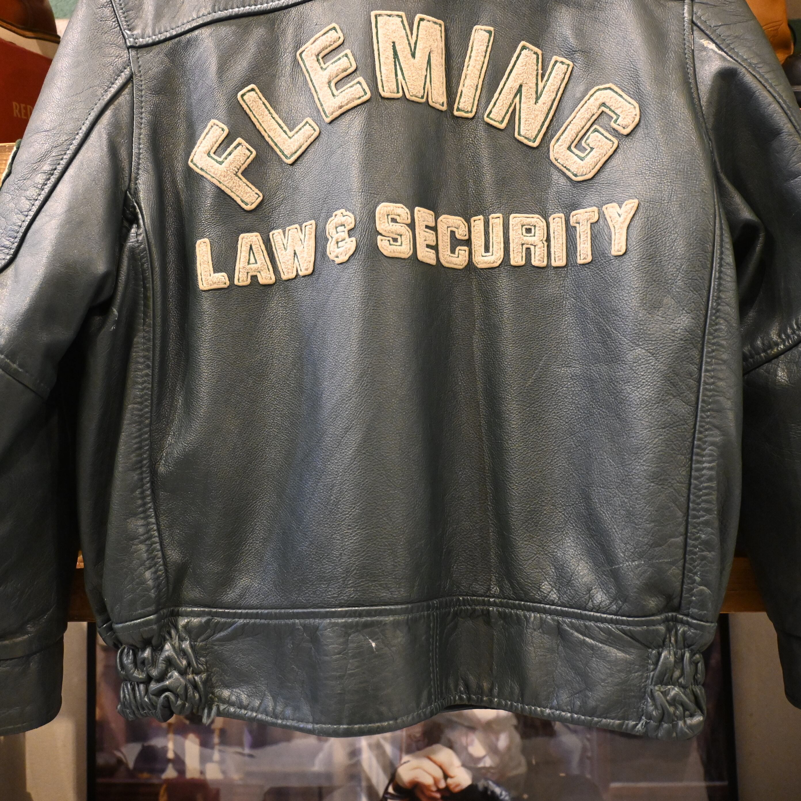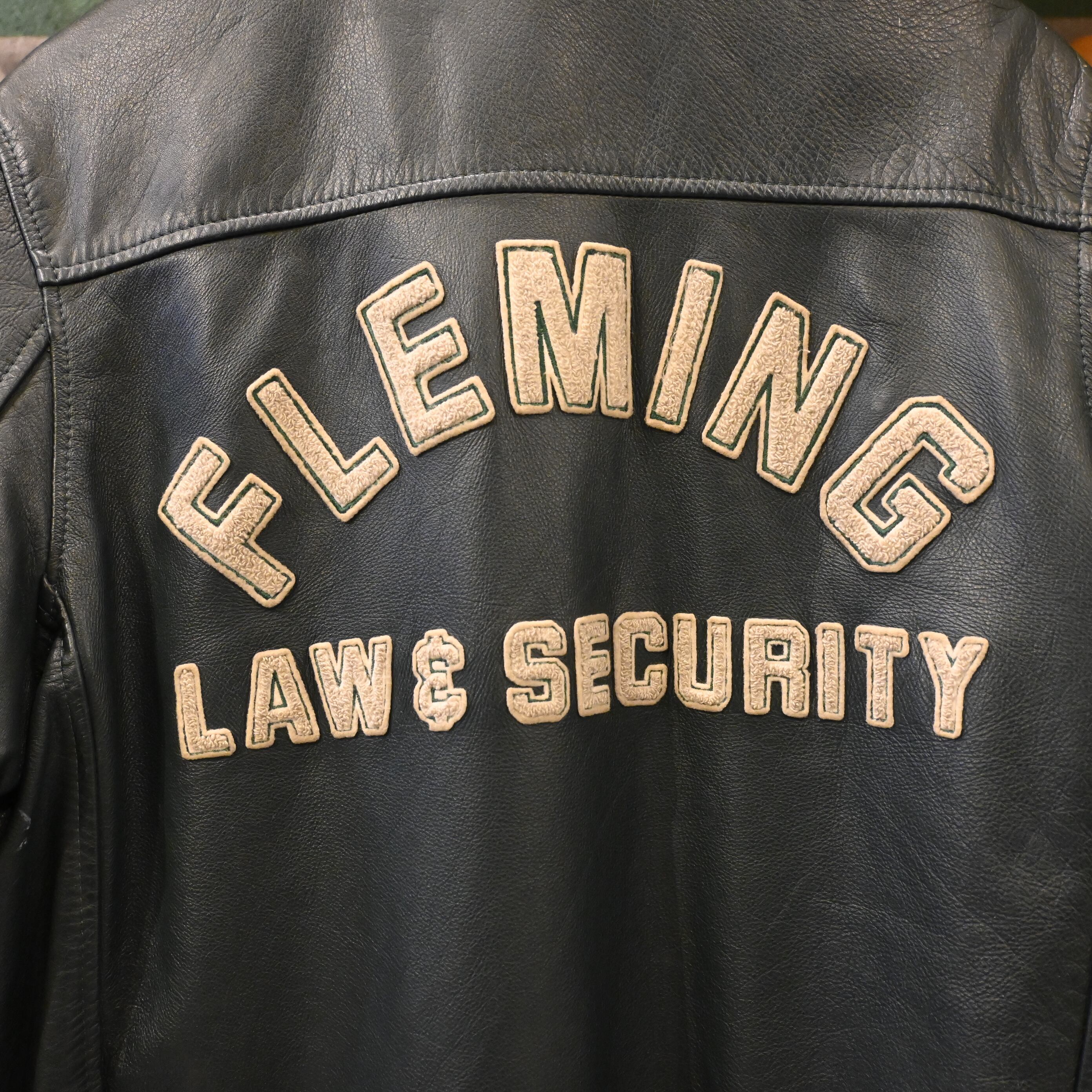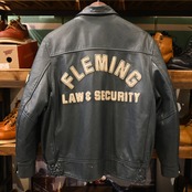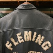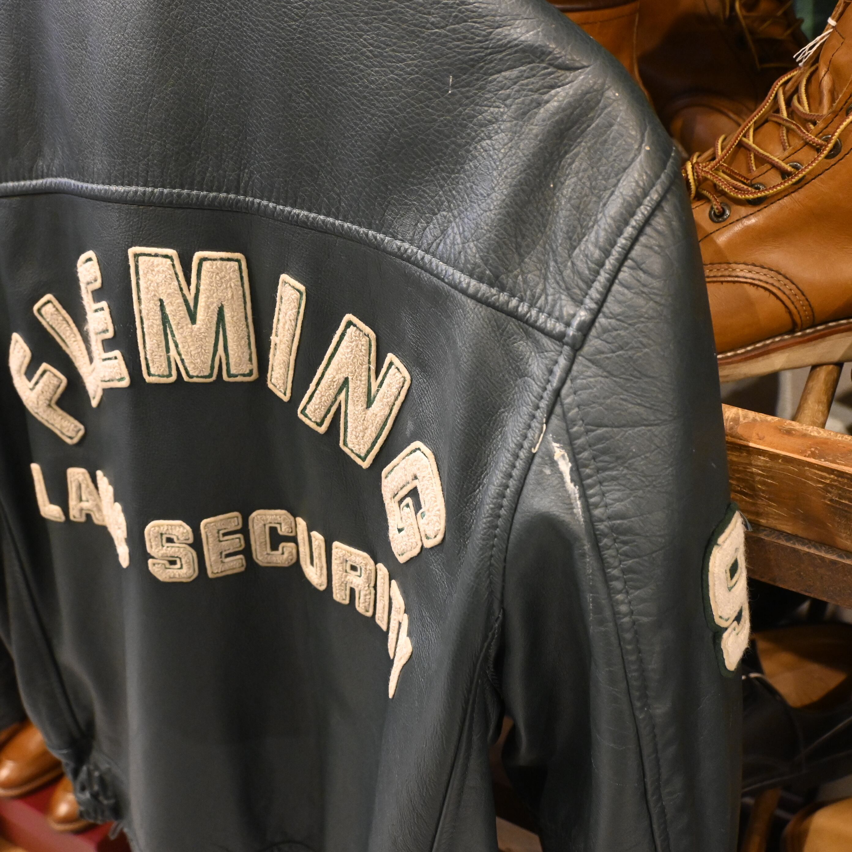 カナダ・トロントのスポーツウェアメーカー「AVON SPORTSWEAR」によるレザースタジアムジャケットです。胸にはクレスト(紋章)風ワッペン、右袖には「92」、左袖には「JULIE」のネーム、背中には「FLEMING LAW & SECURITY」の大きなワッペンが配され、強烈な存在感を放つデザイン。