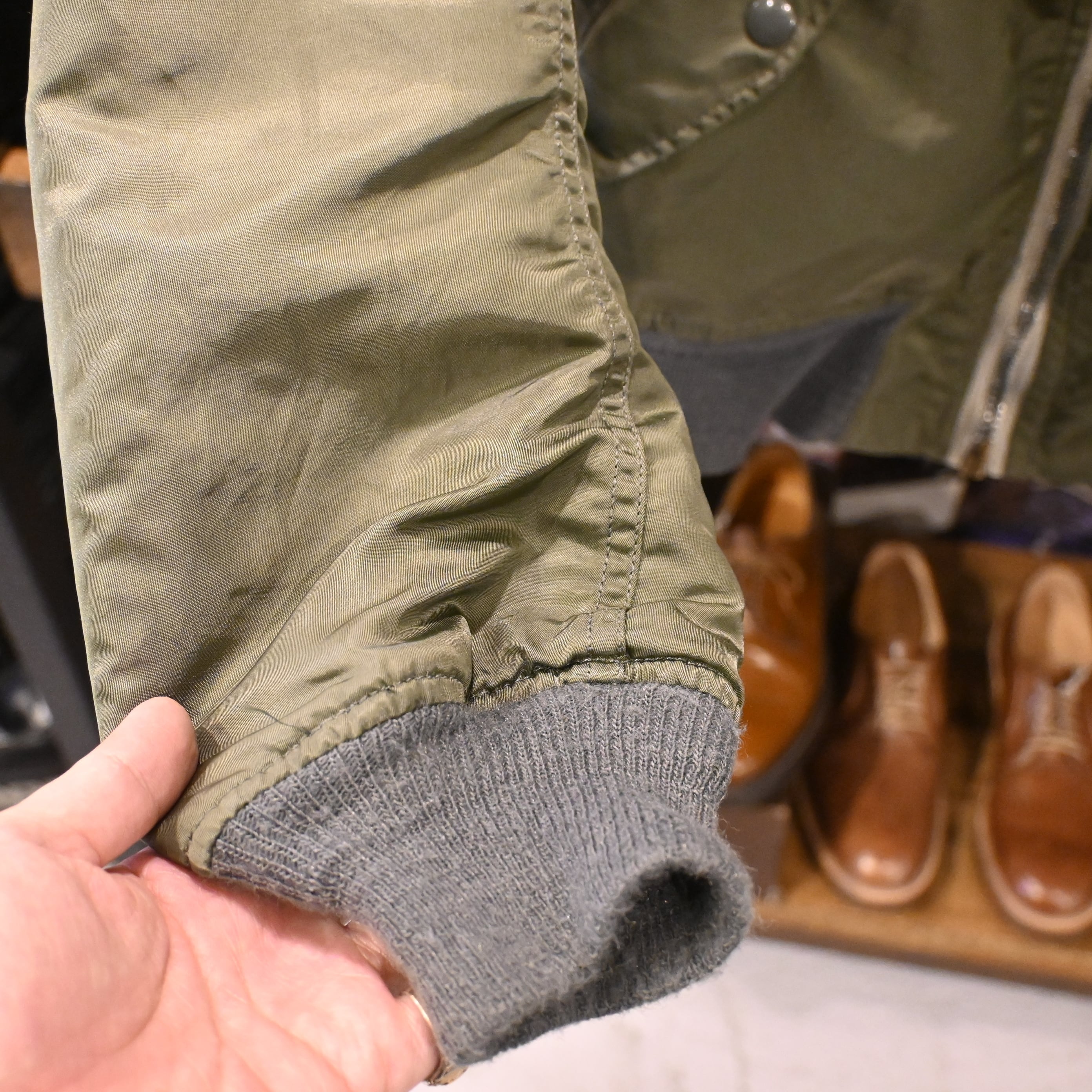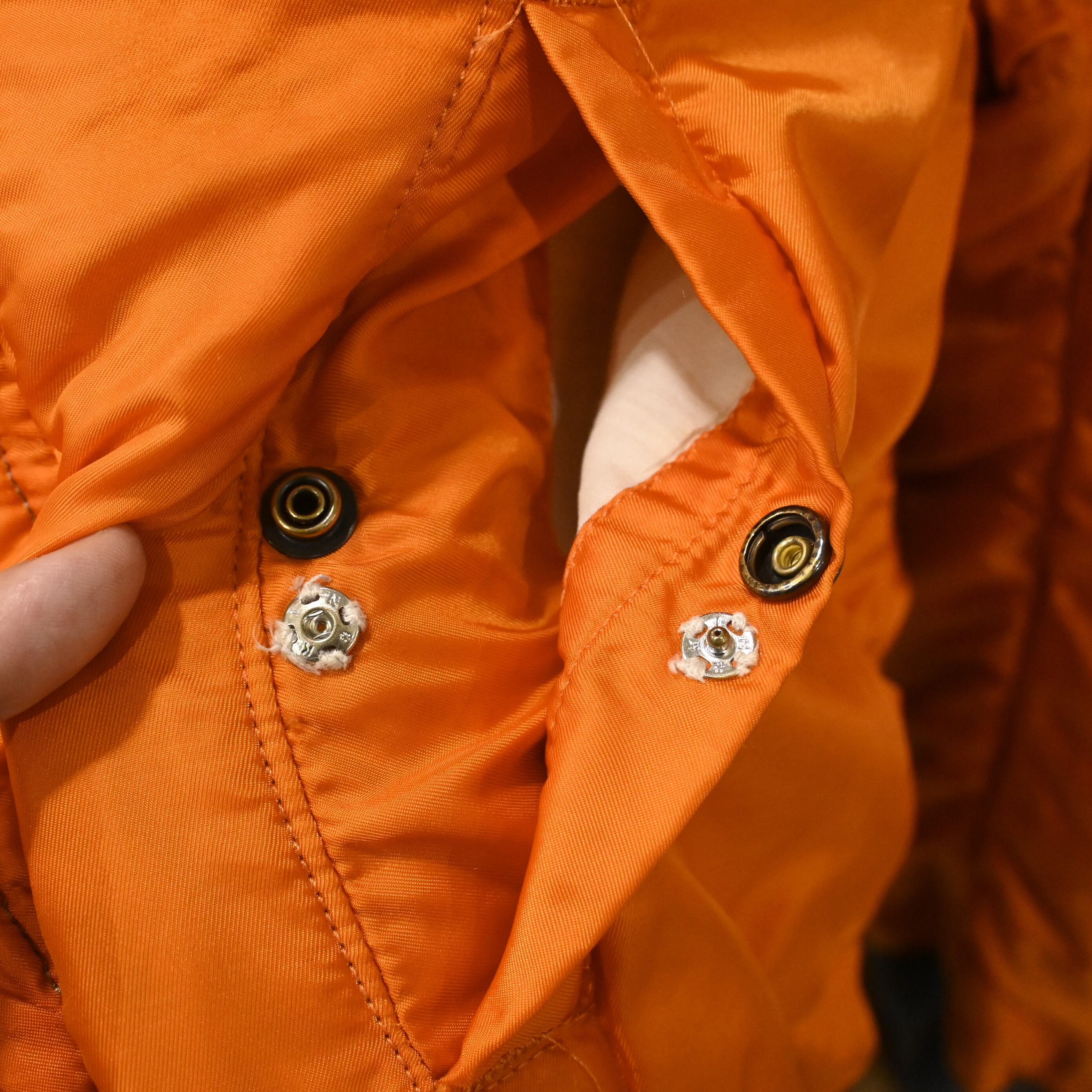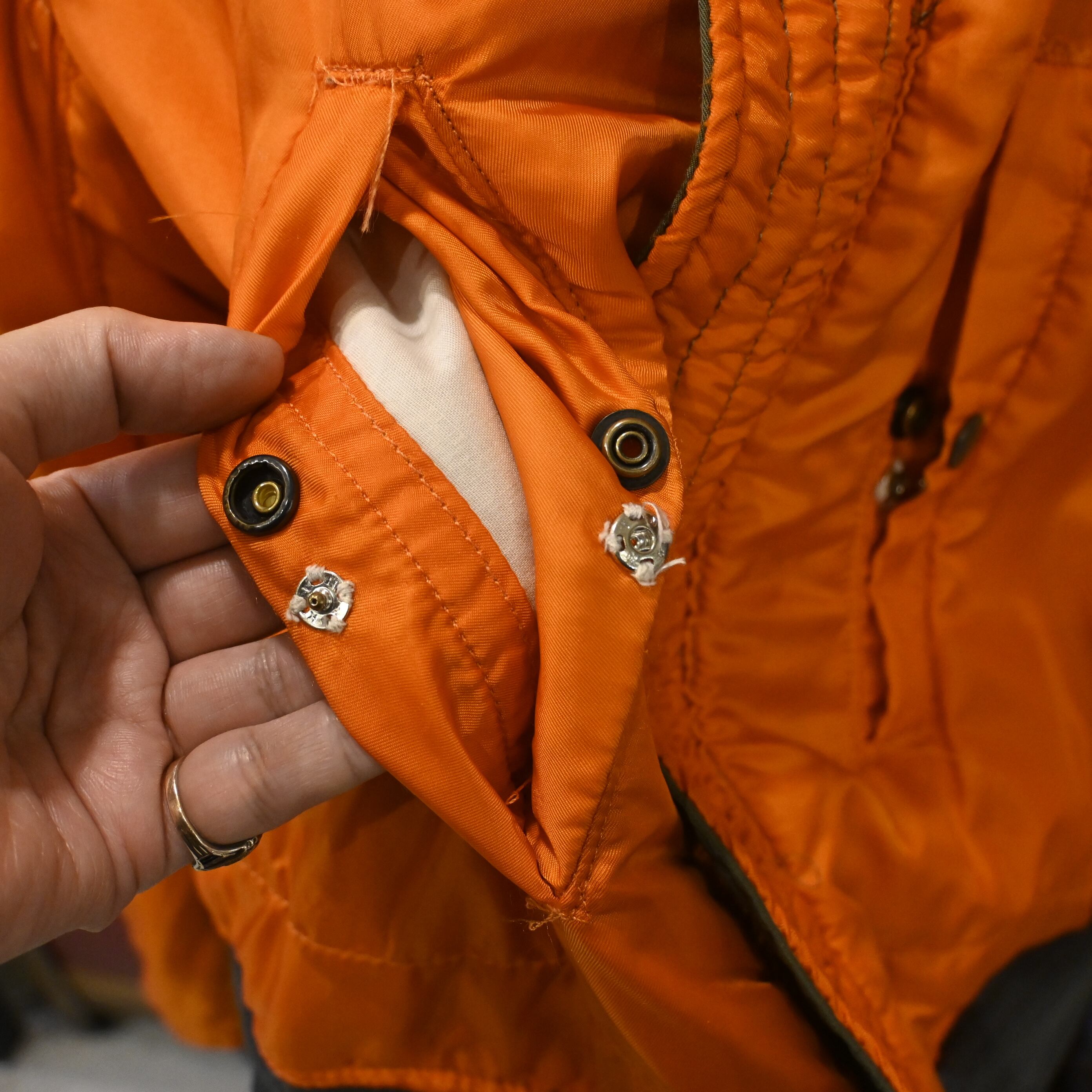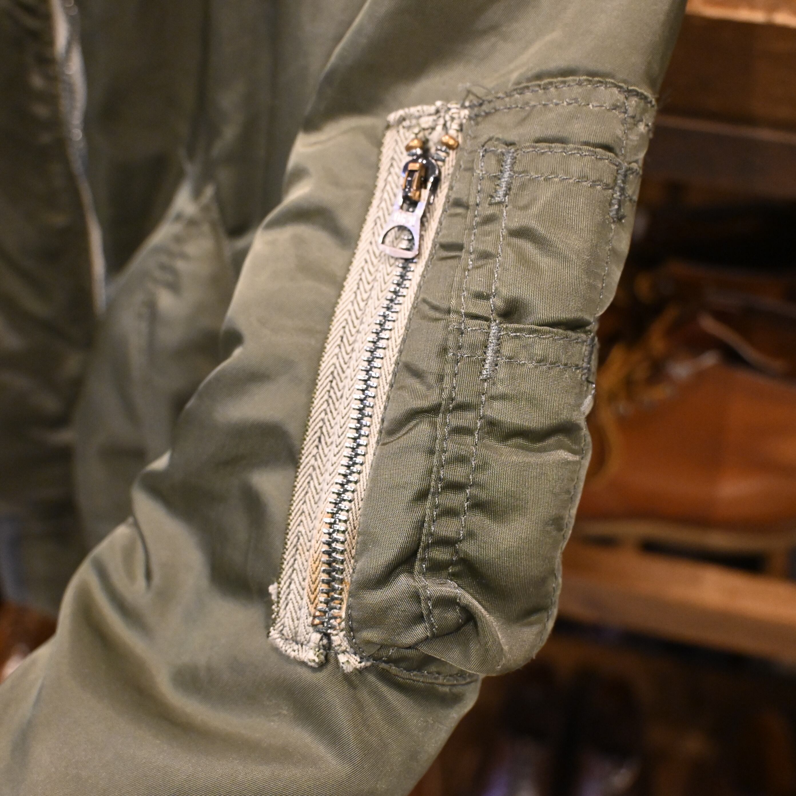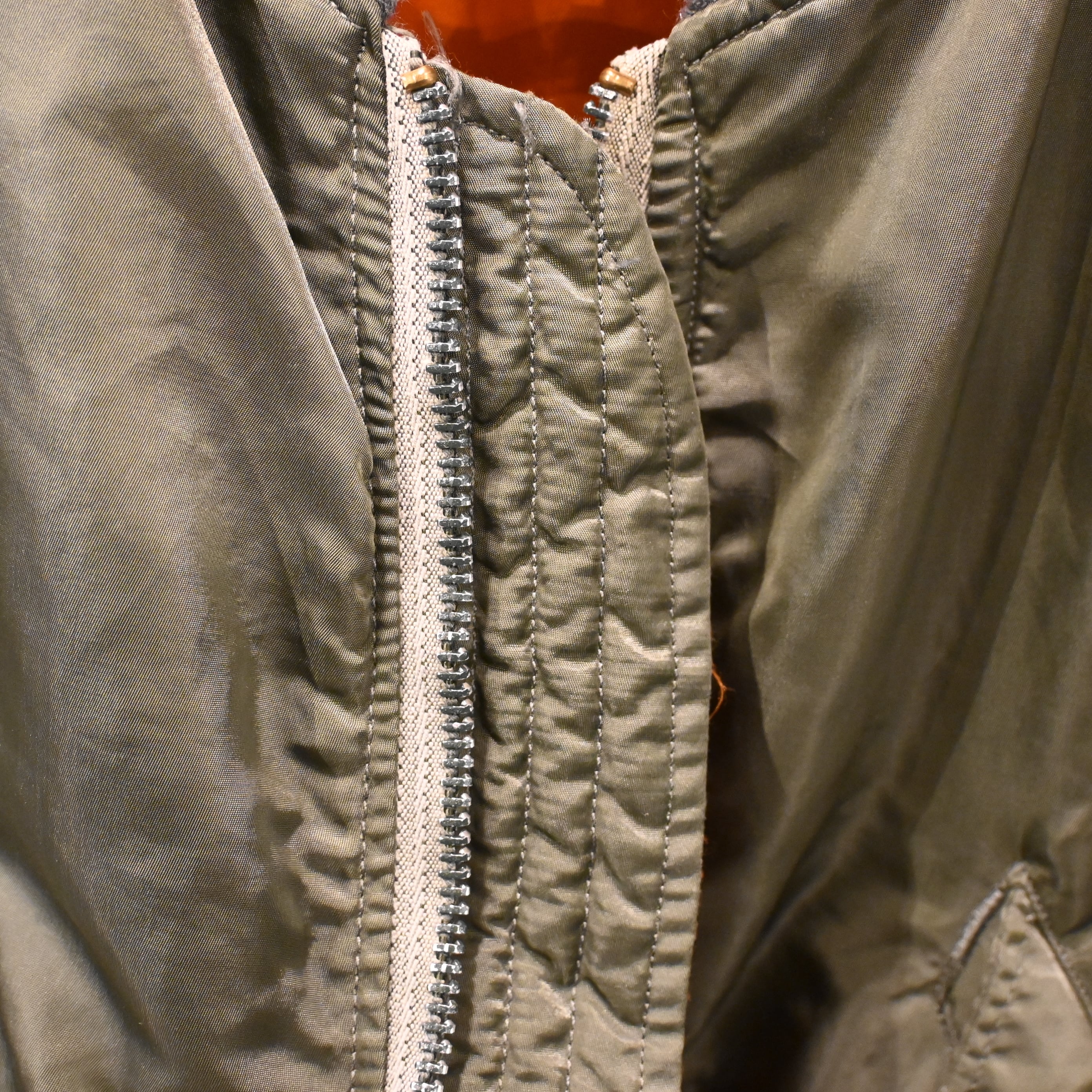 こちらは1963〜1972年に採用されていた MIL-J-8279E 規格、CONCORD社製 のオリジナル。セージグリーンのナイロンシェルにレスキューオレンジのリバーシブル仕様、アルミジッパー&レザータブ付きのディテールが特徴です。