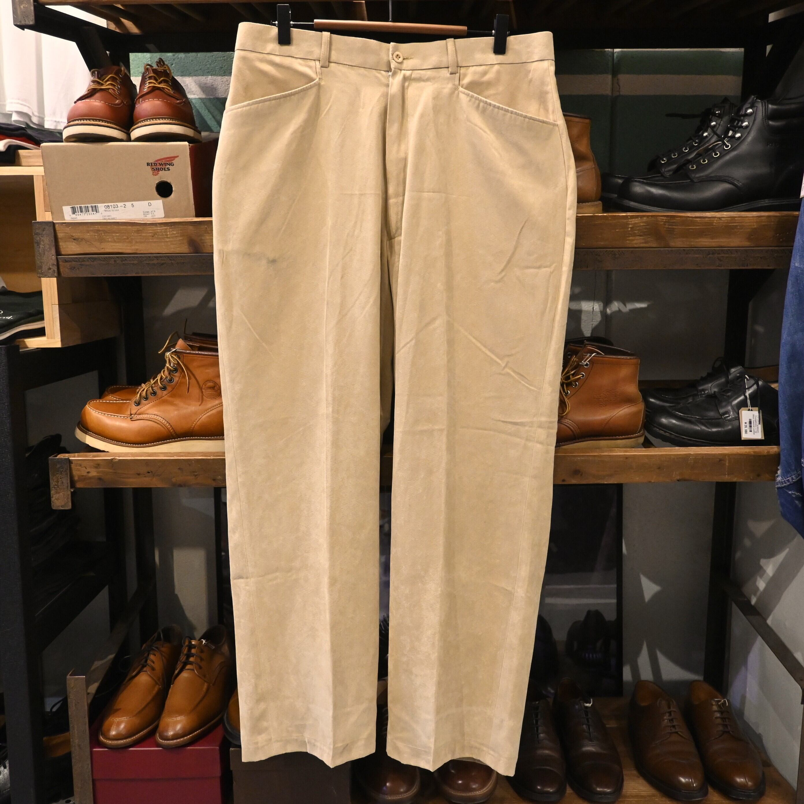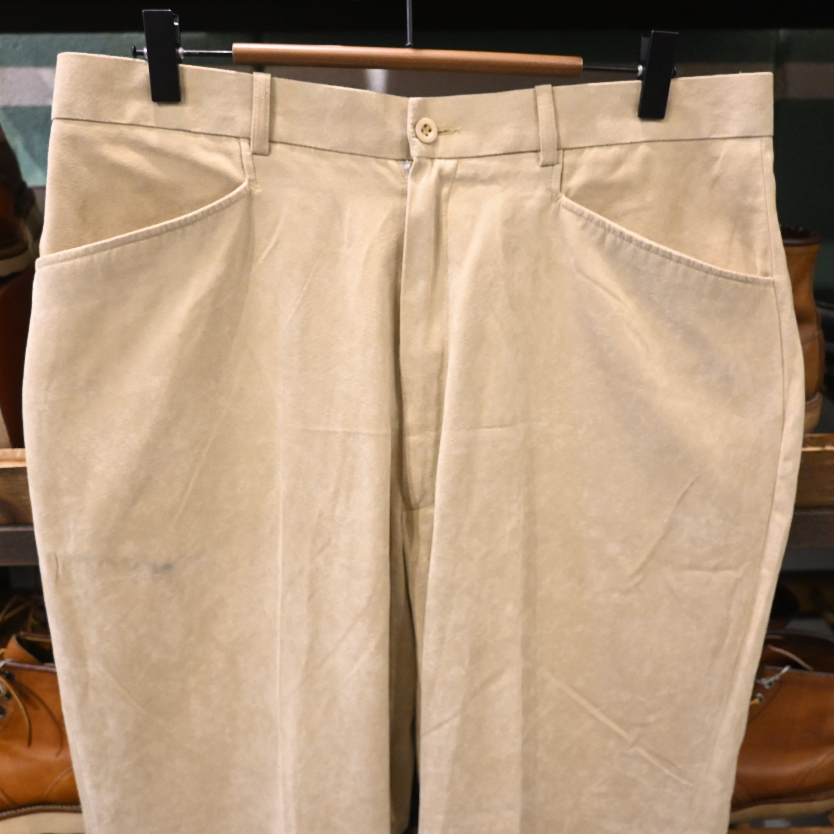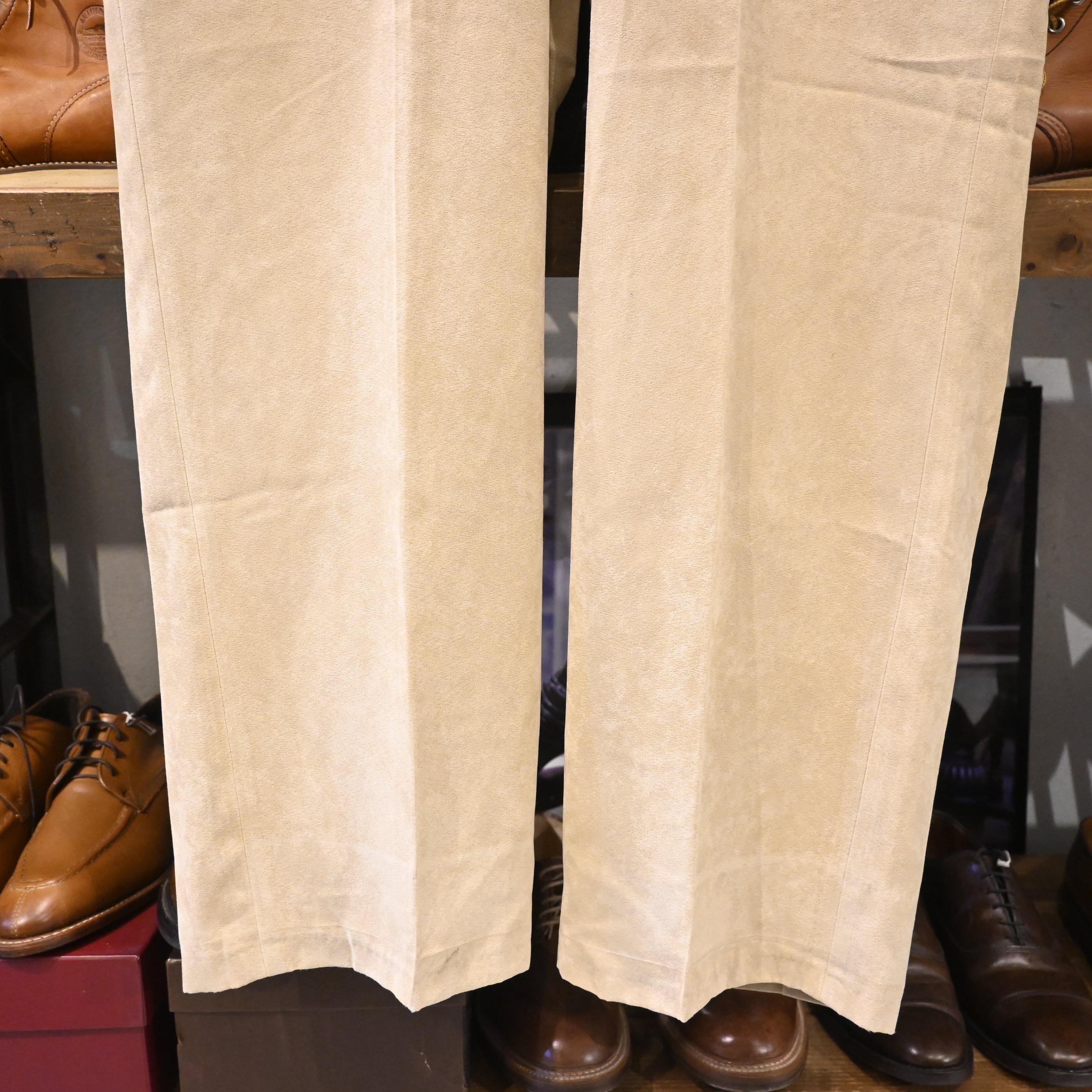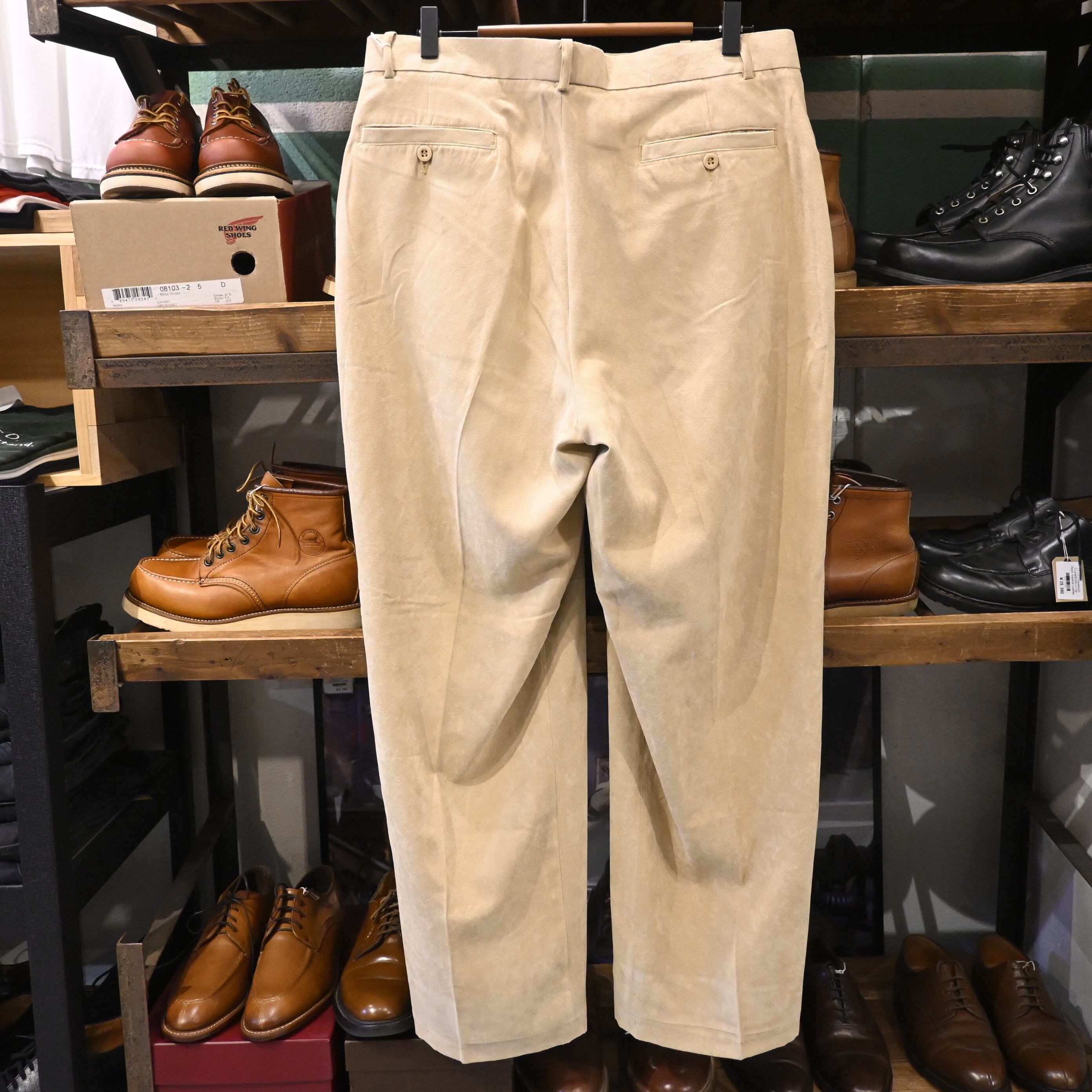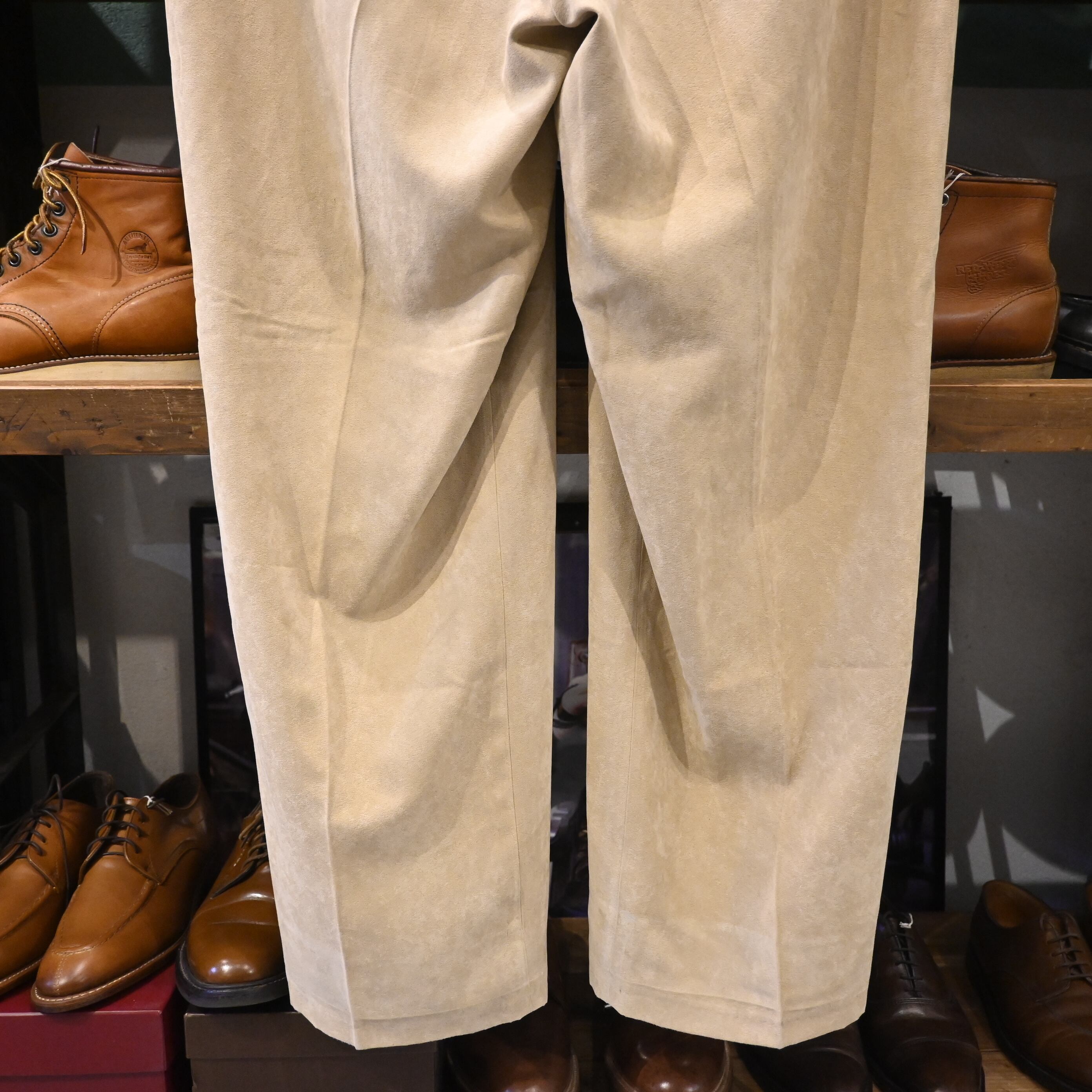 スエードレザーのような質感を表現した、ベージュカラーのワイドシルエットスラックスです。