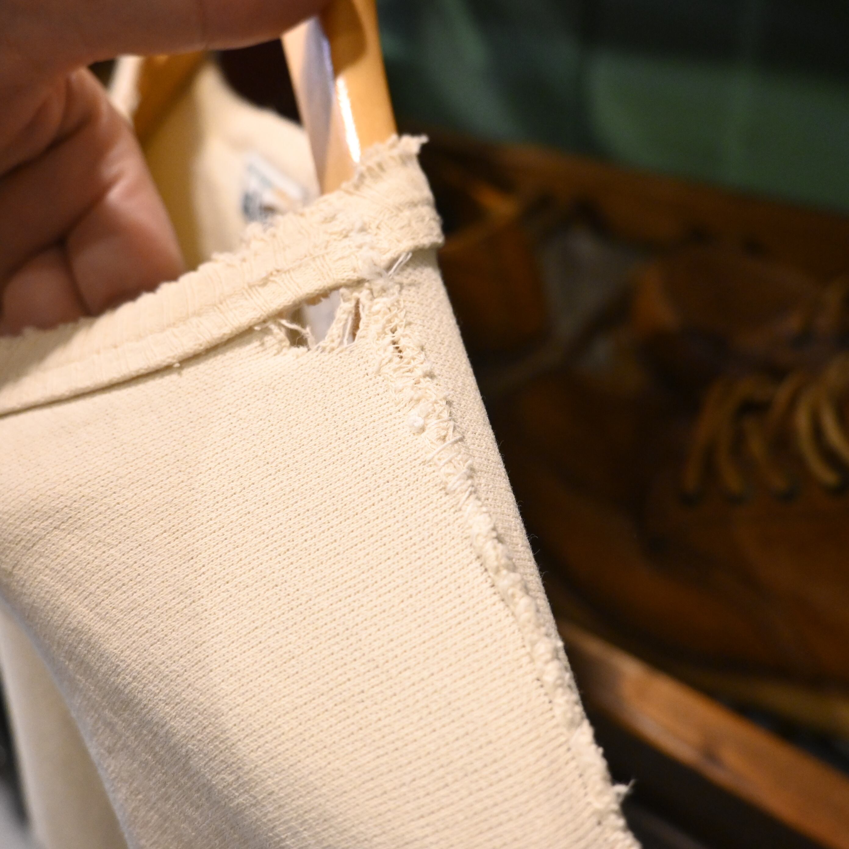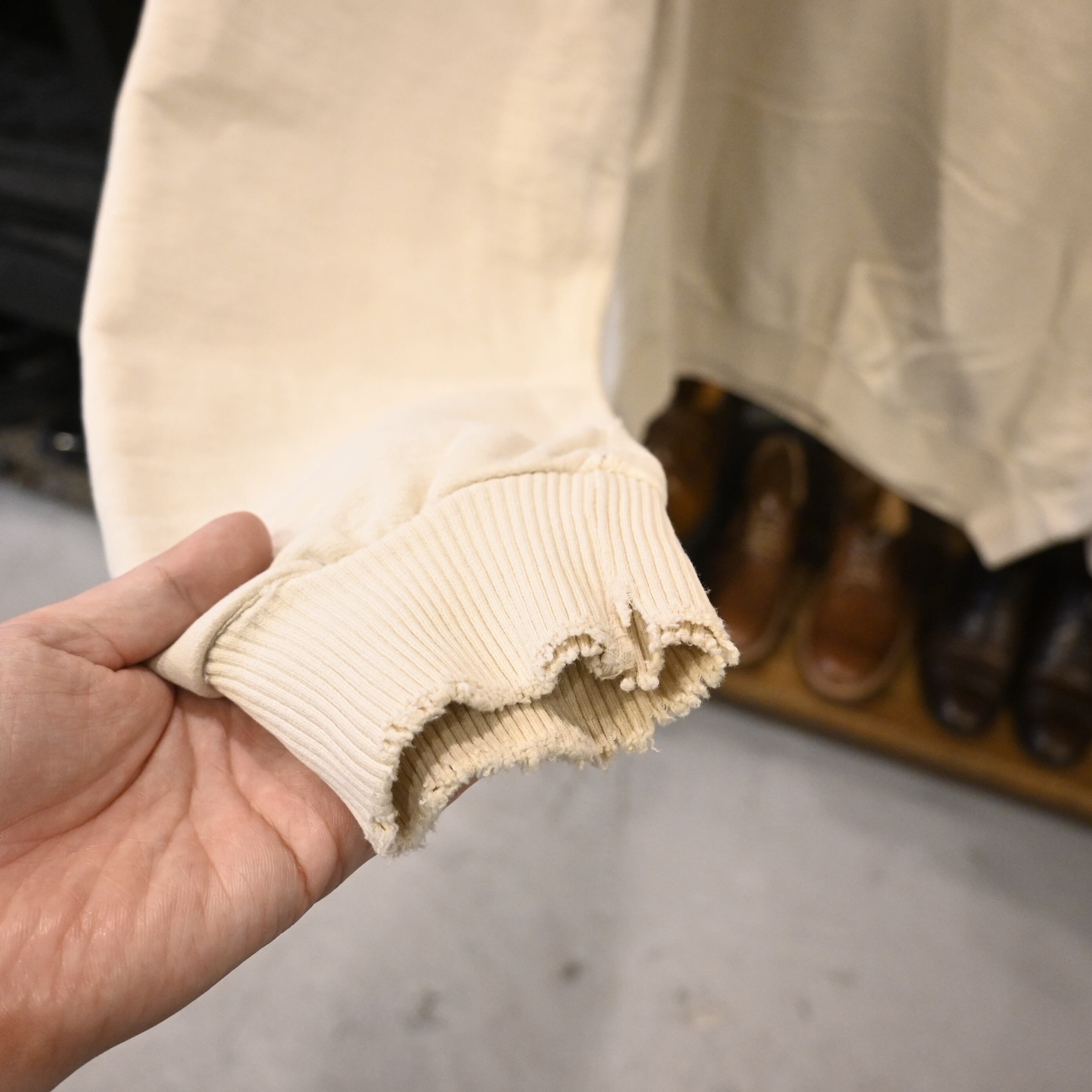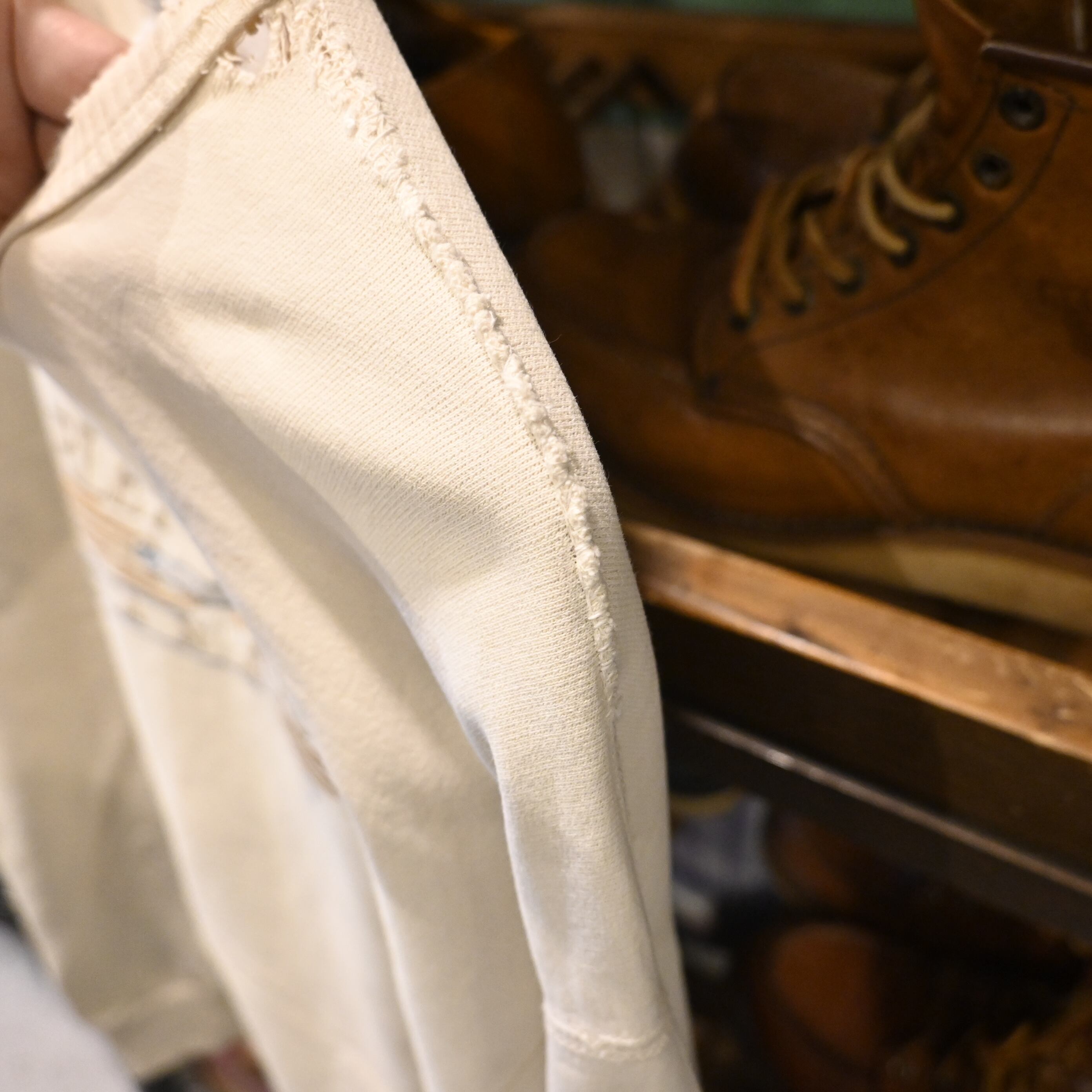 袖口やネックリブにダメージが見られますが、ヴィンテージならではの味わいとしてお楽しみいただけます。