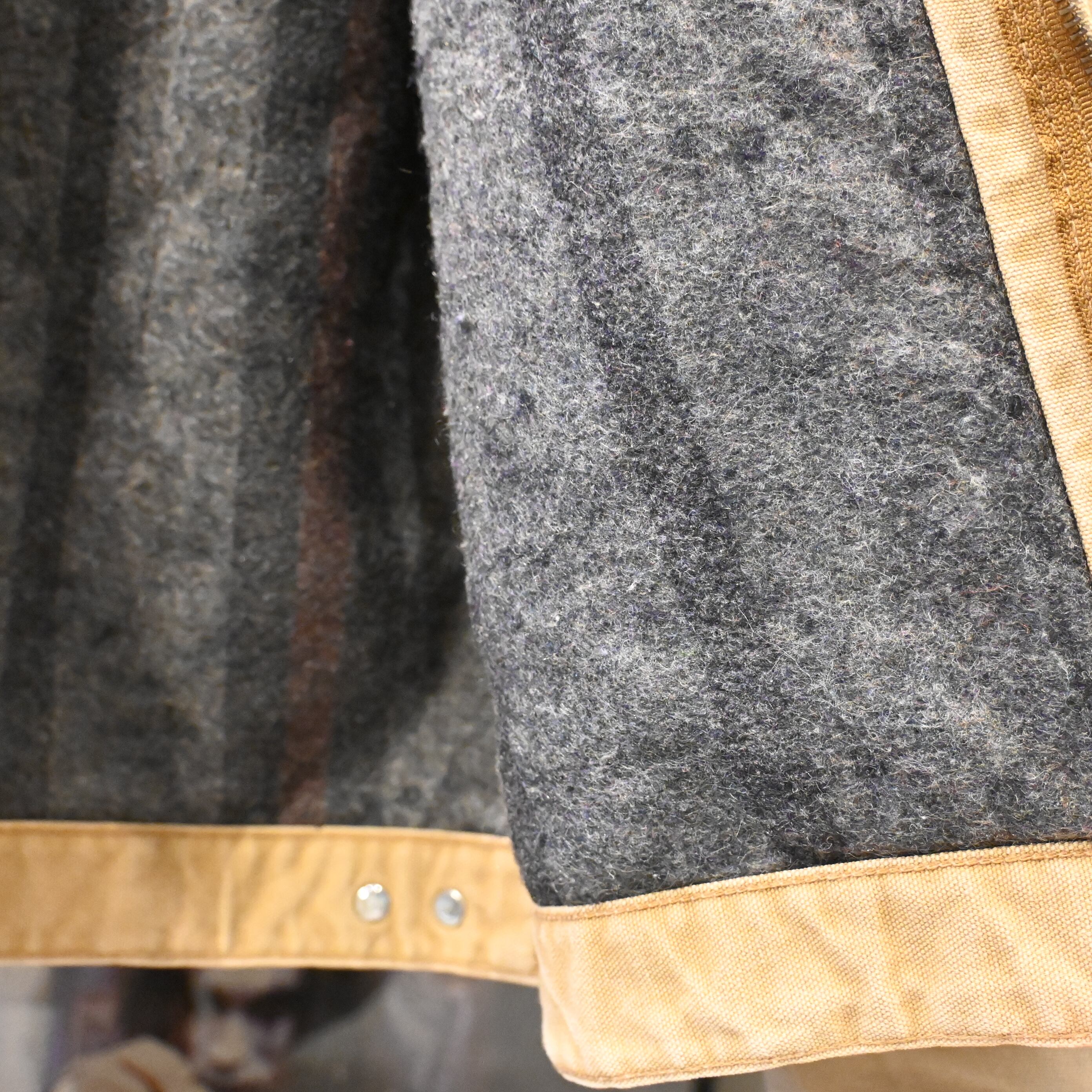 90年代製のダック地を使用したタフなワークジャケットで、襟にはピンクがかったブラウンのコーデュロイを採用。フロントにはお馴染みのスクエアラベルが付き、ブランドらしい無骨さと存在感を放っています。