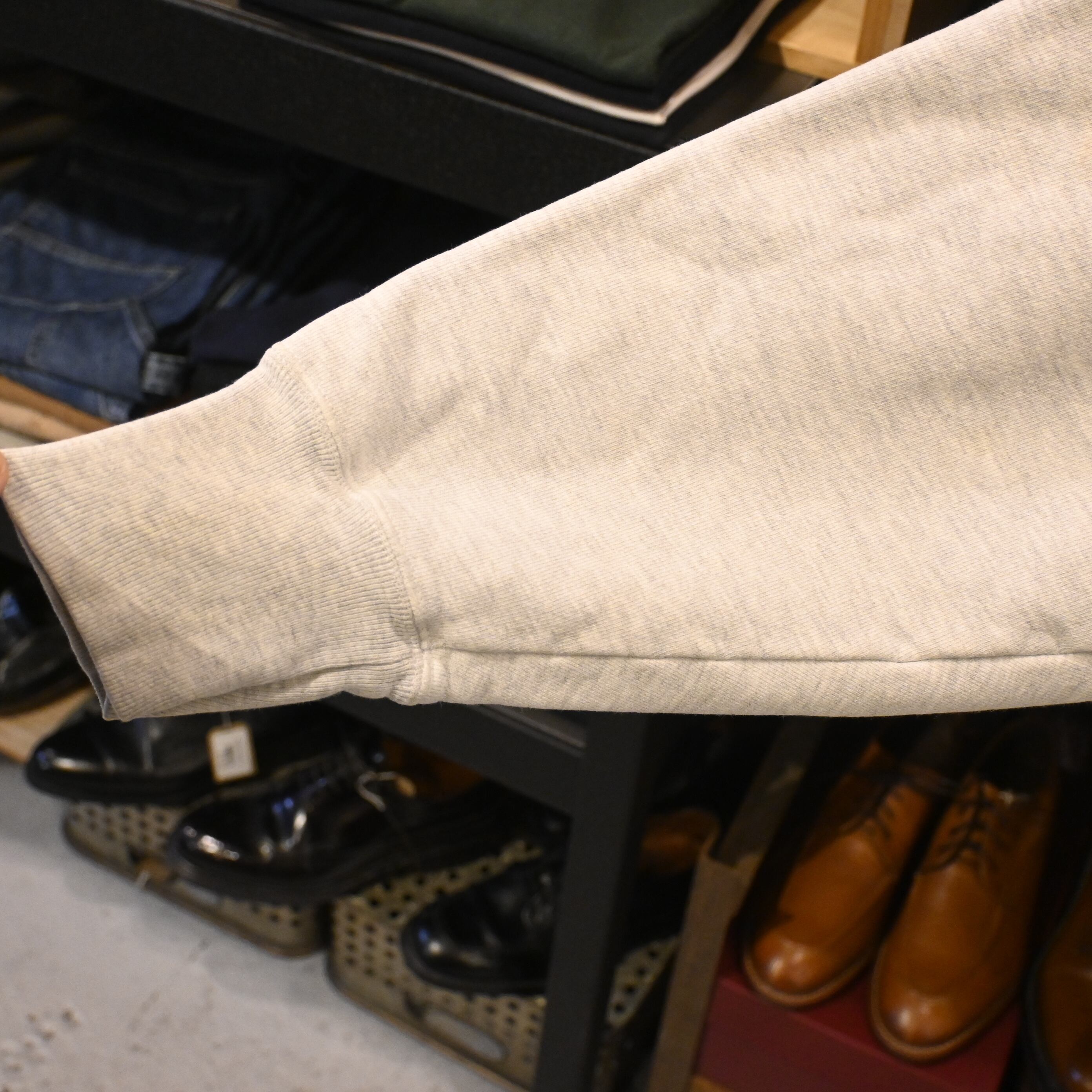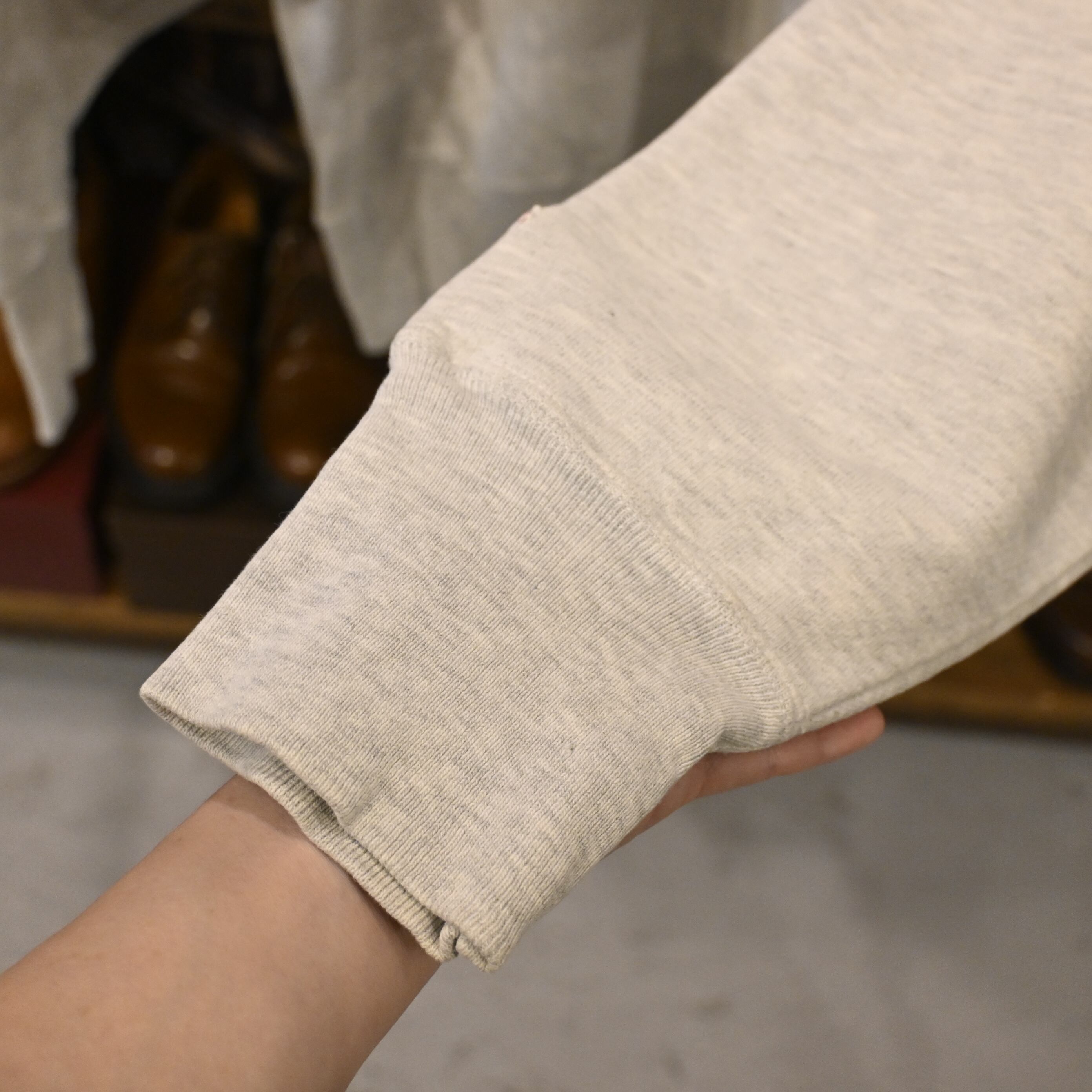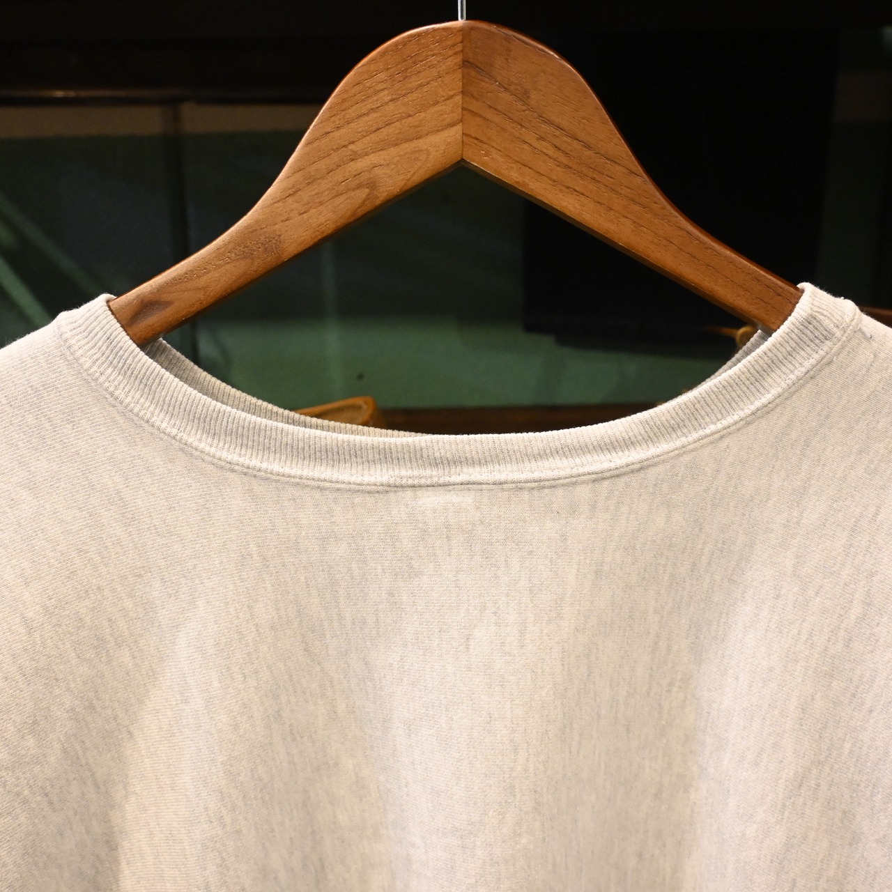 グレーボディにネイビープリントのシンプルな配色はスタイリングを選ばず、デニムやワークパンツ、チノパンとの相性も抜群。リバースウィーブ特有のタフな生地感も魅力です。