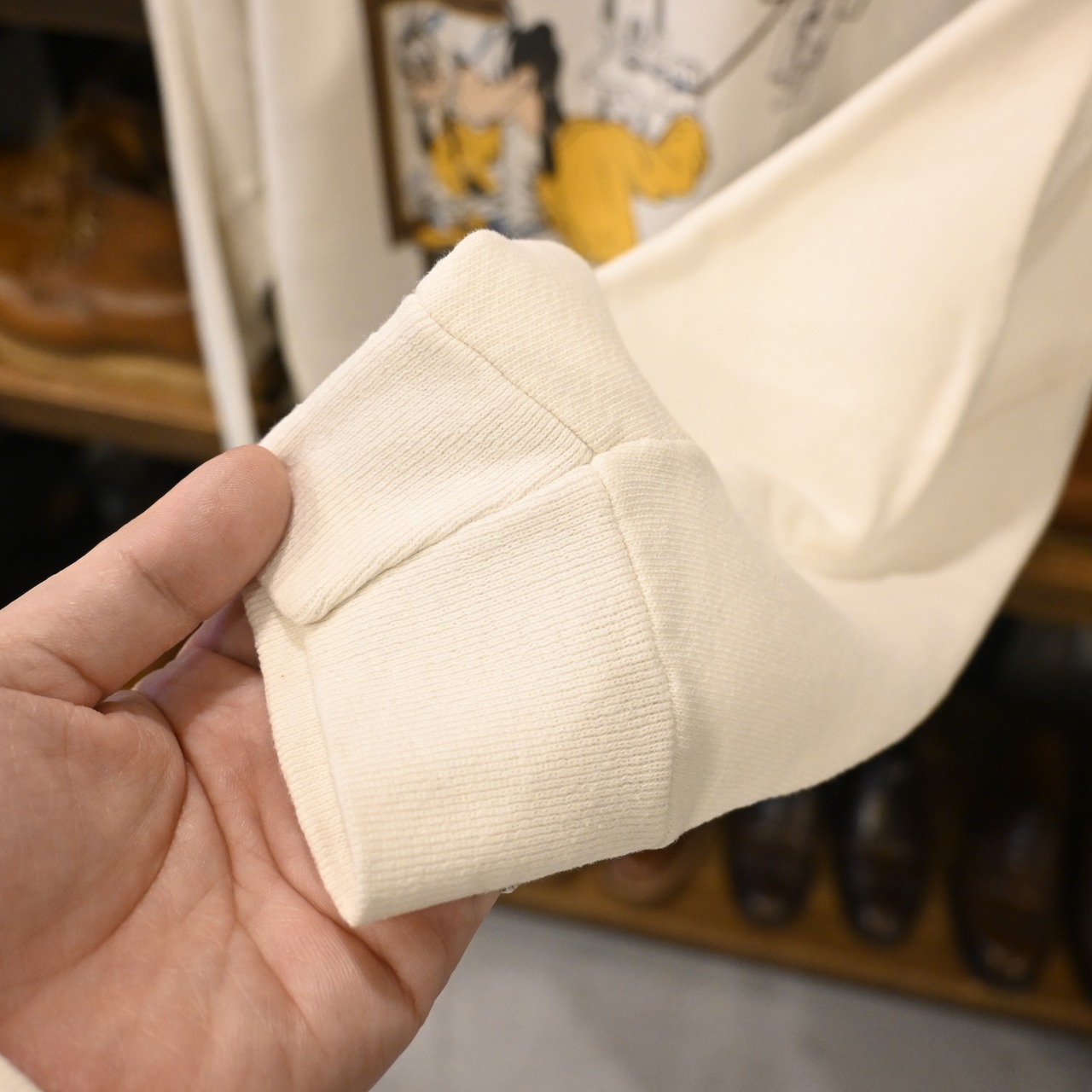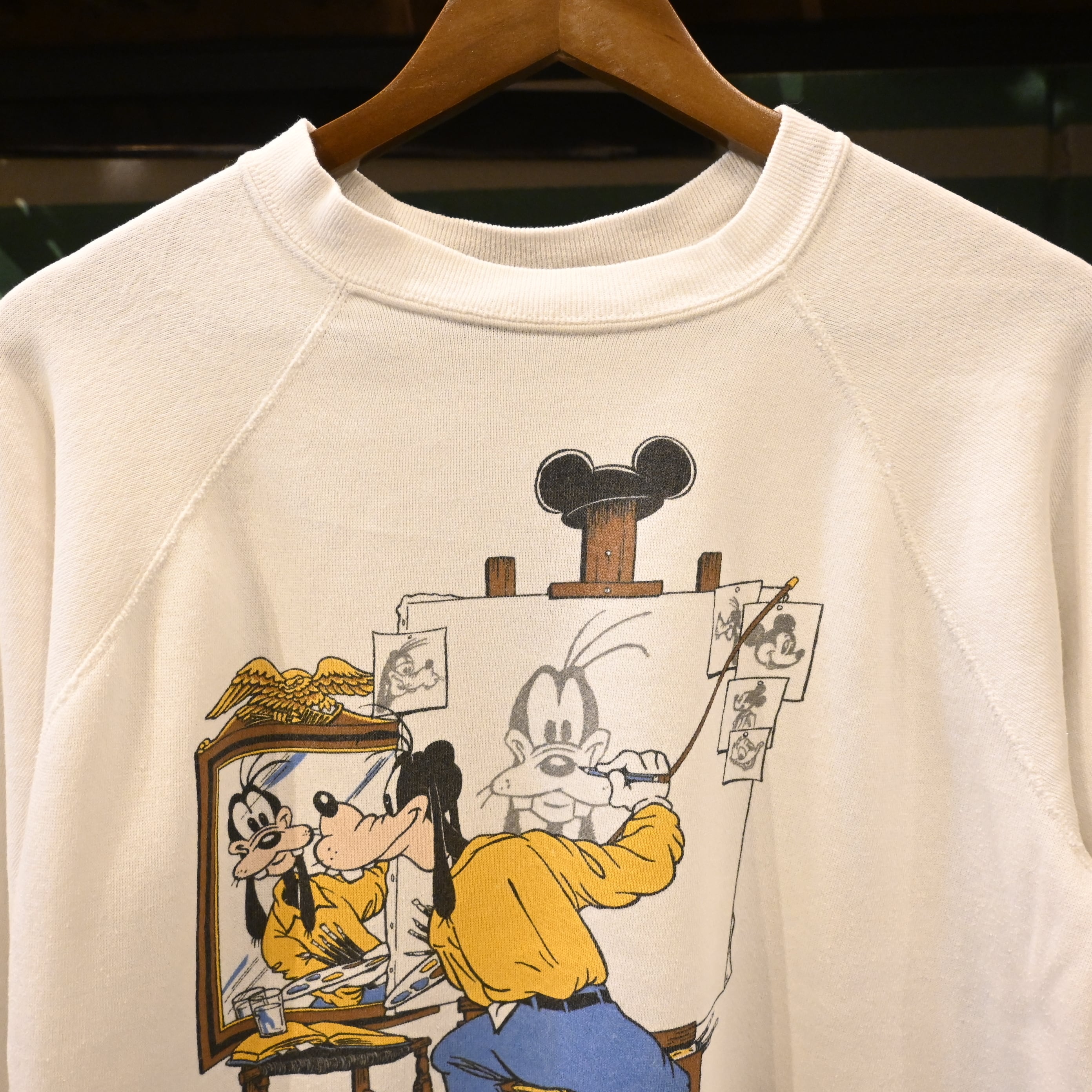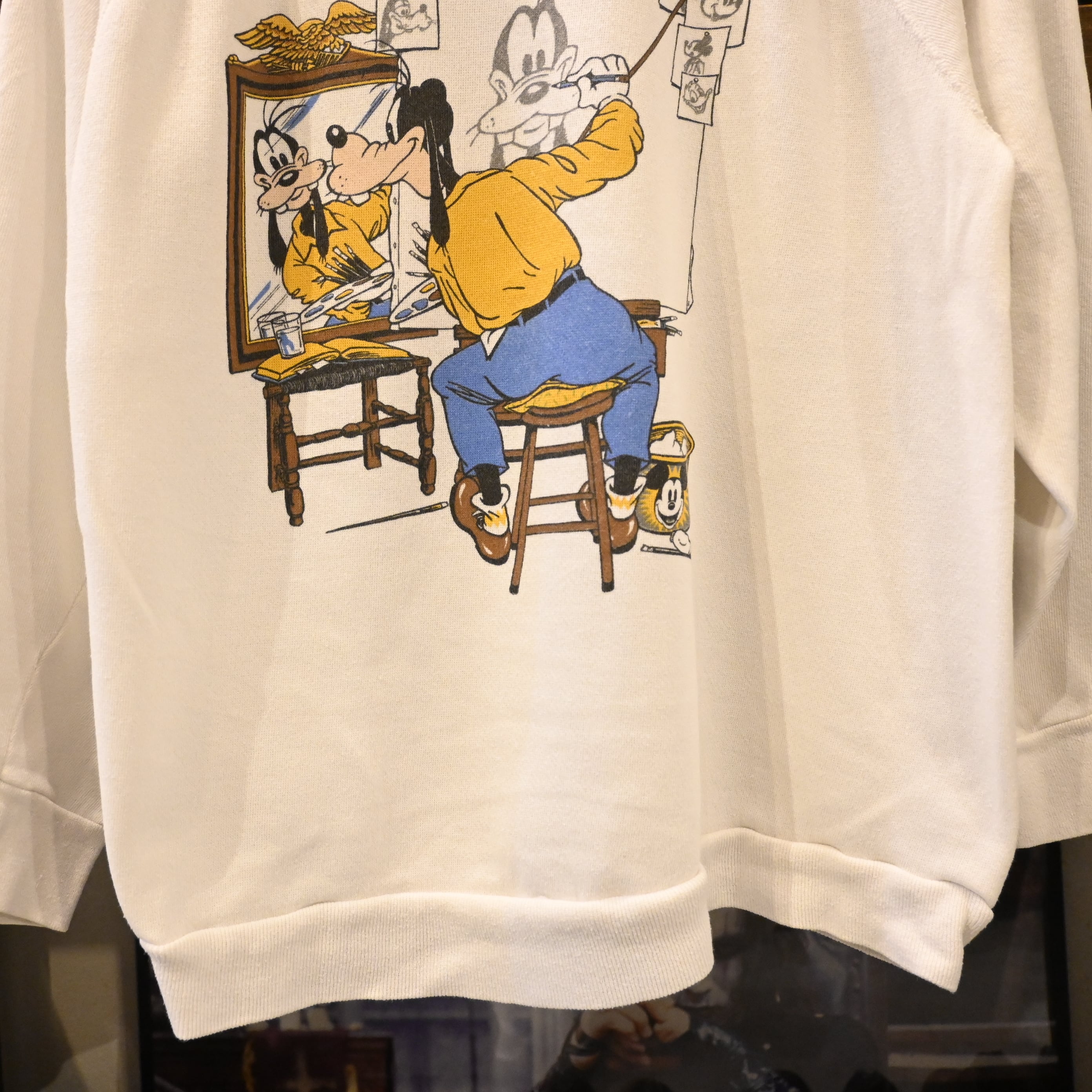 1980年代、USA製のディズニースウェット。グーフィーが自画像を描く姿をユーモラスに描いた「Sketch Goofy」プリント。ホワイトボディにキャラクターが際立つデザインで、コレクタブルな一枚です。