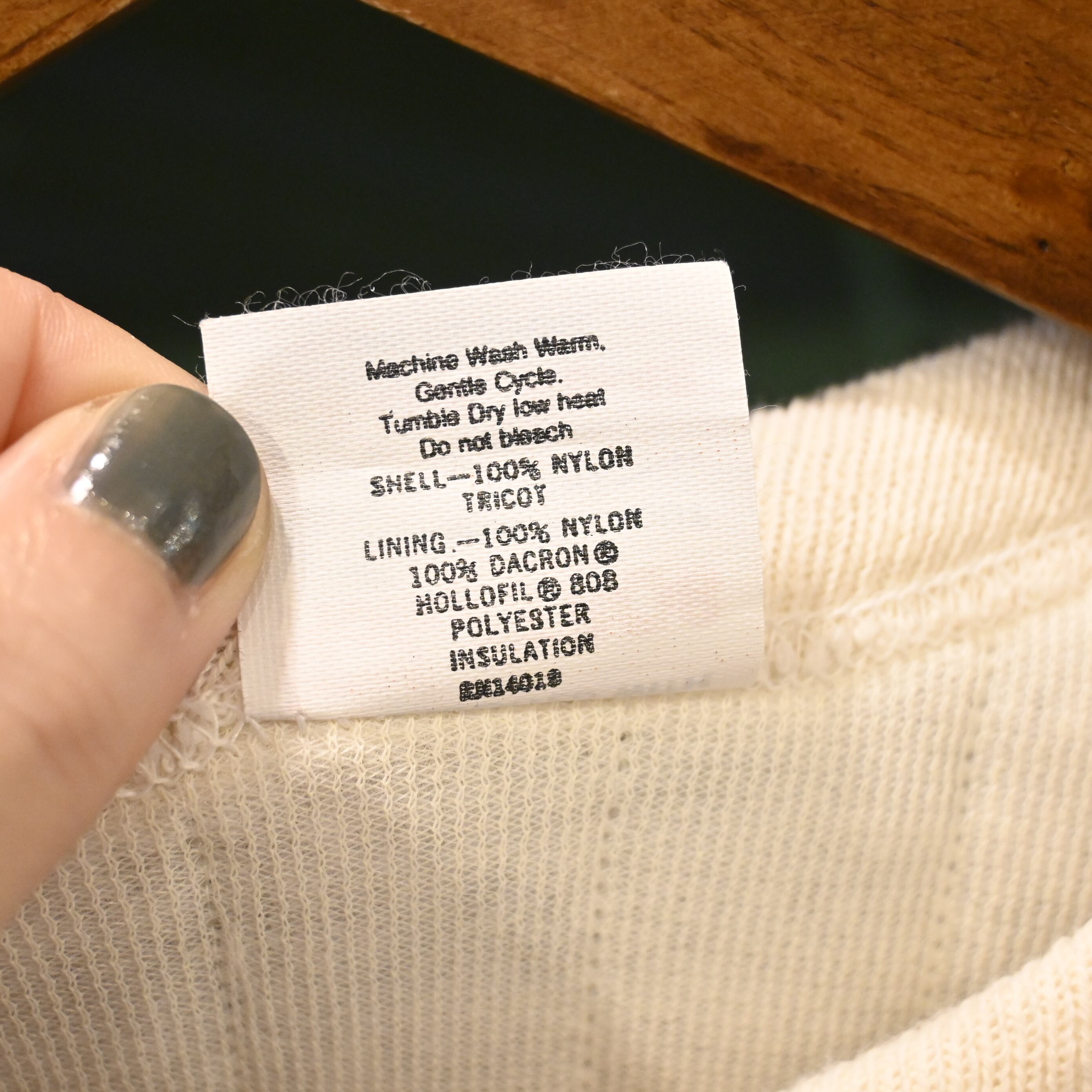 アメリカ軍の極寒地用被服(ECWCSやライナー類)にも同系統の化繊中綿が採用されており、この「Hollofil 808」も軍やアウトドア双方に関わる技術的背景を持っています。そのため本アイテムも ミリタリースペックを意識した民間向けウェア として作られた可能性が高いアイテムです。