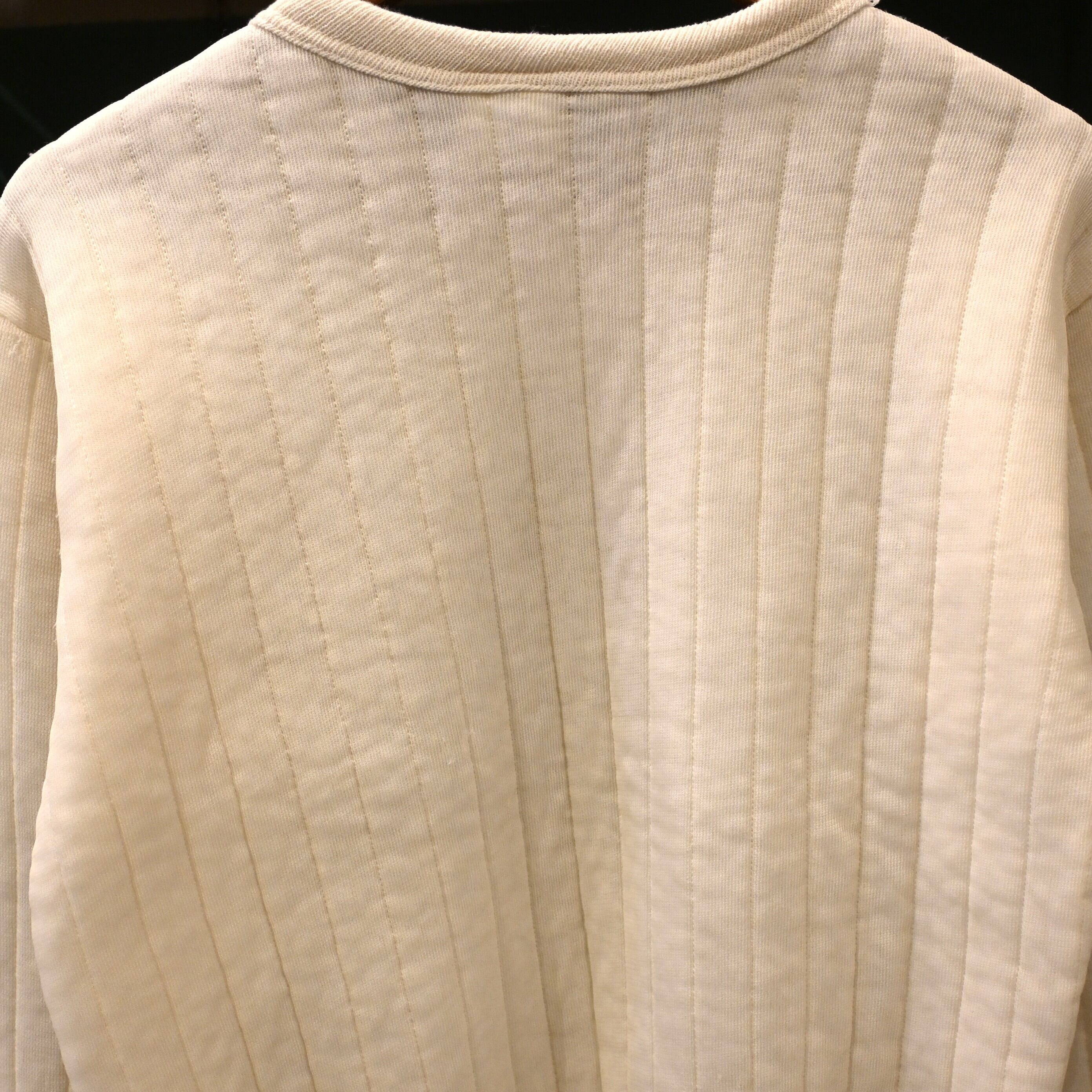 縦ステッチのキルティング構造が特徴的で、シンプルながら他にはない存在感。