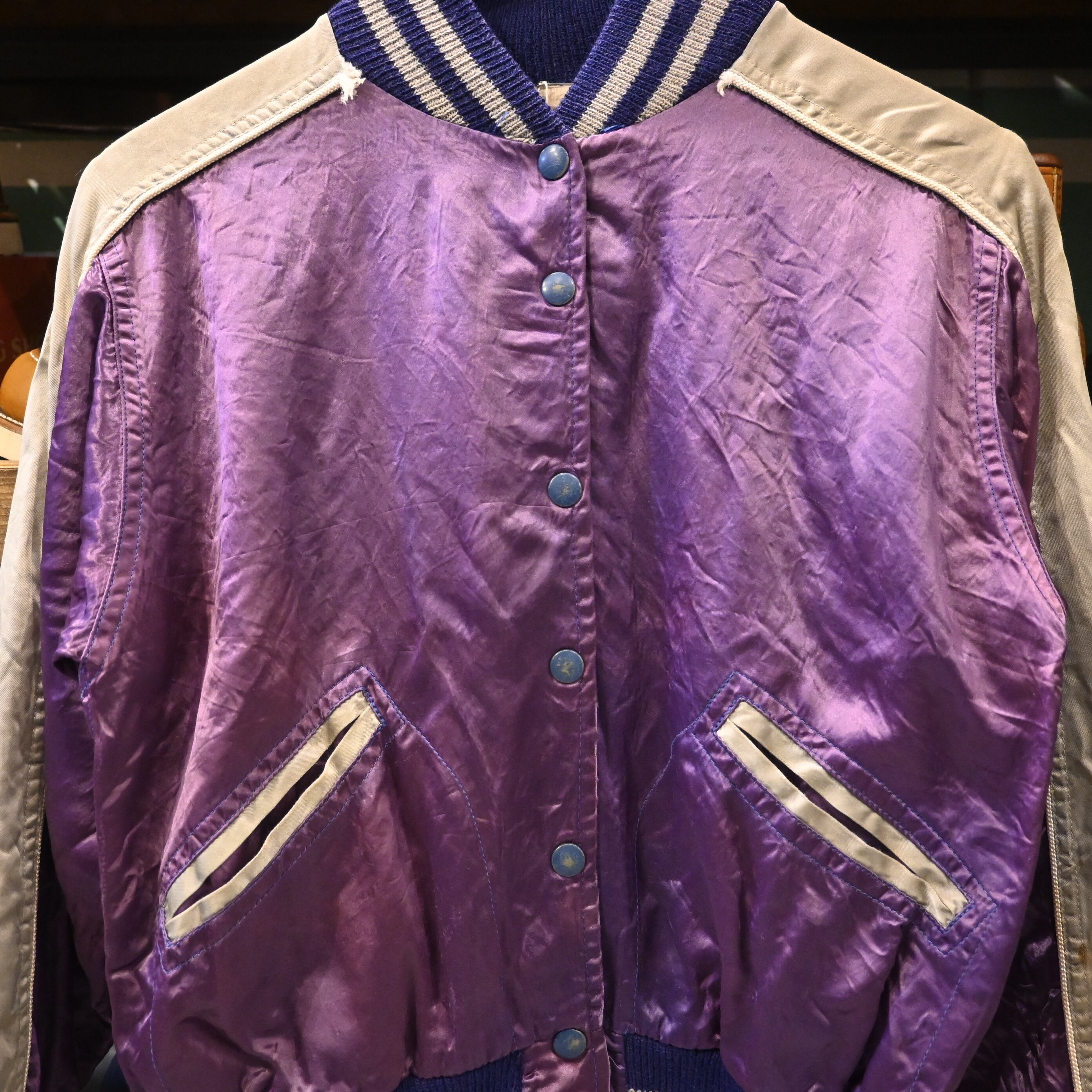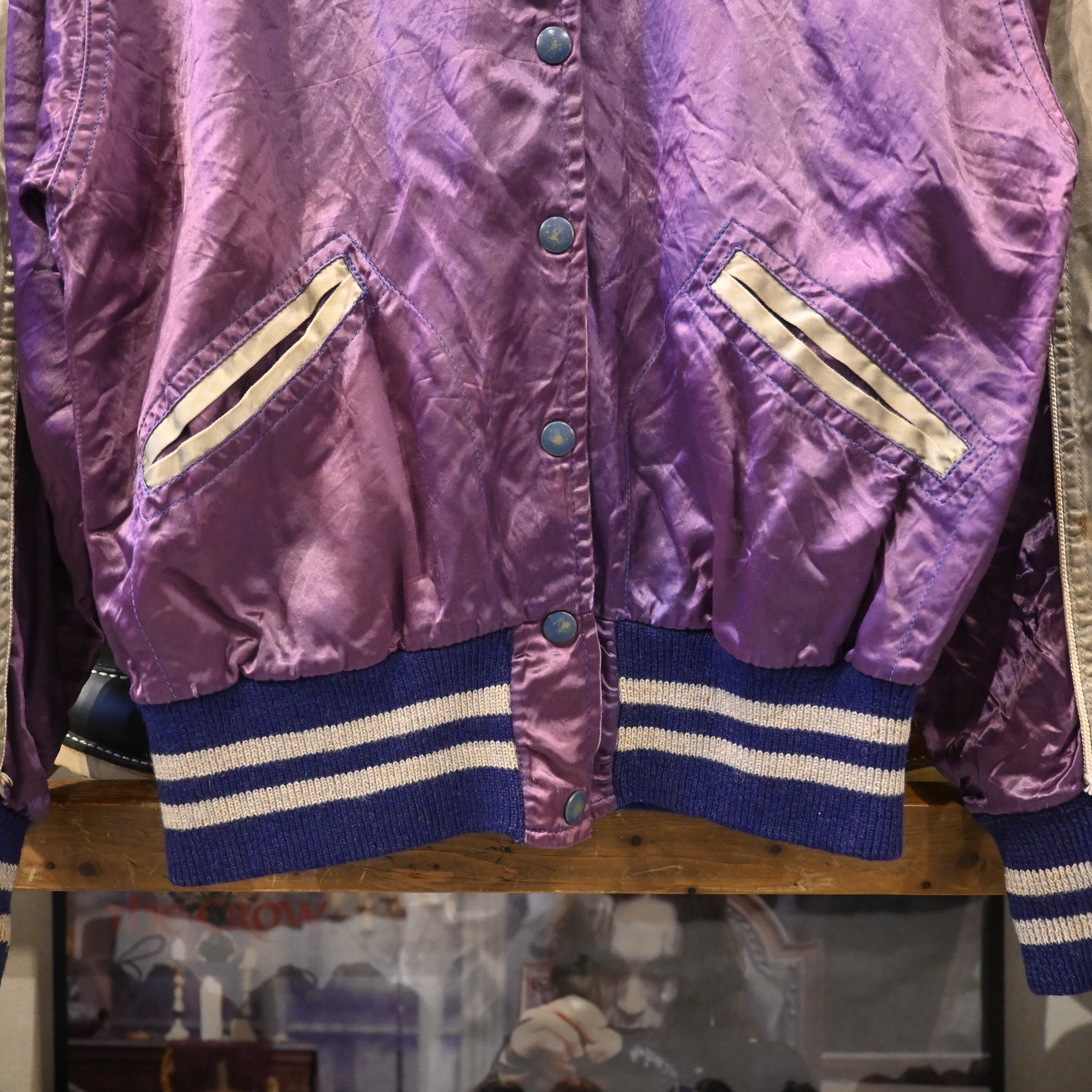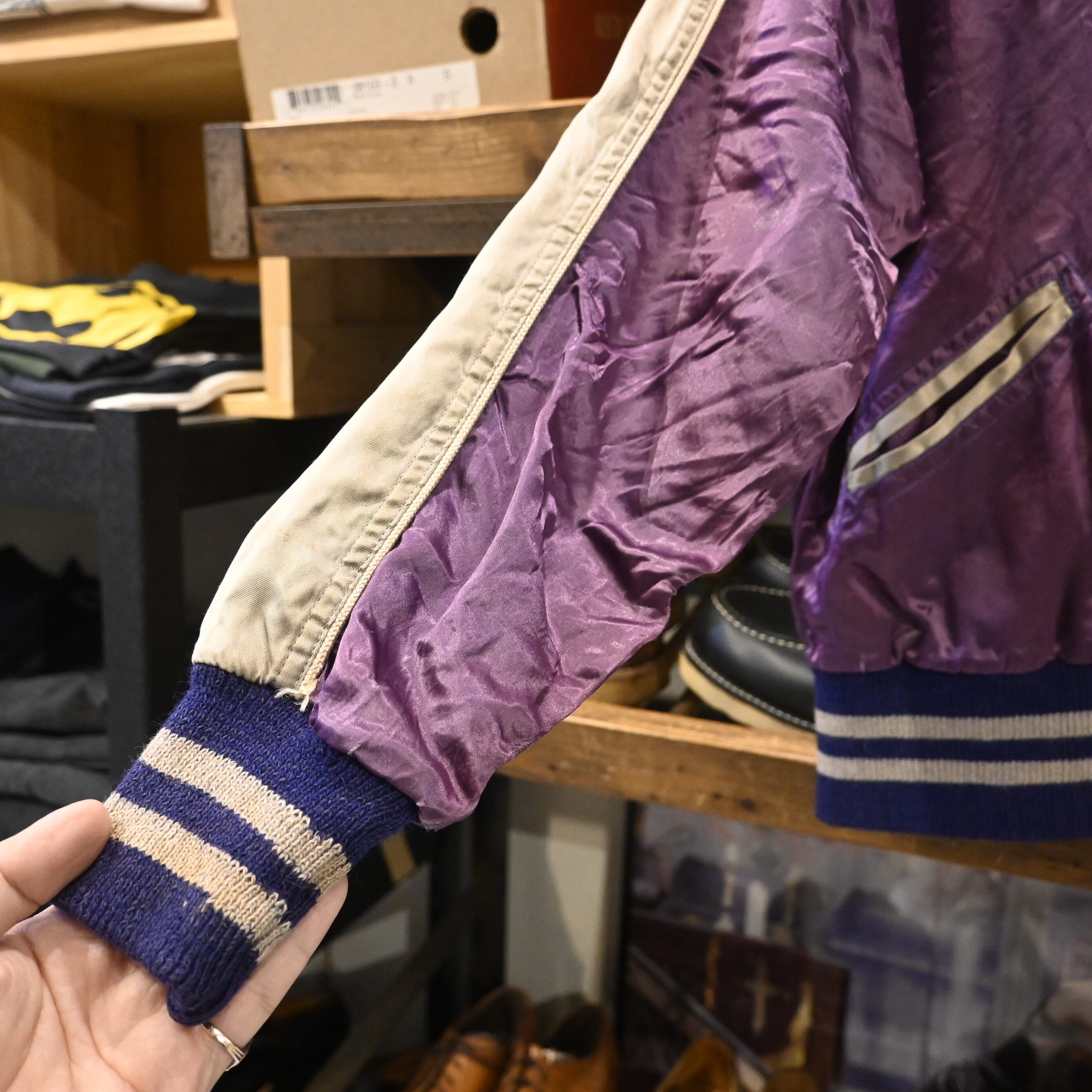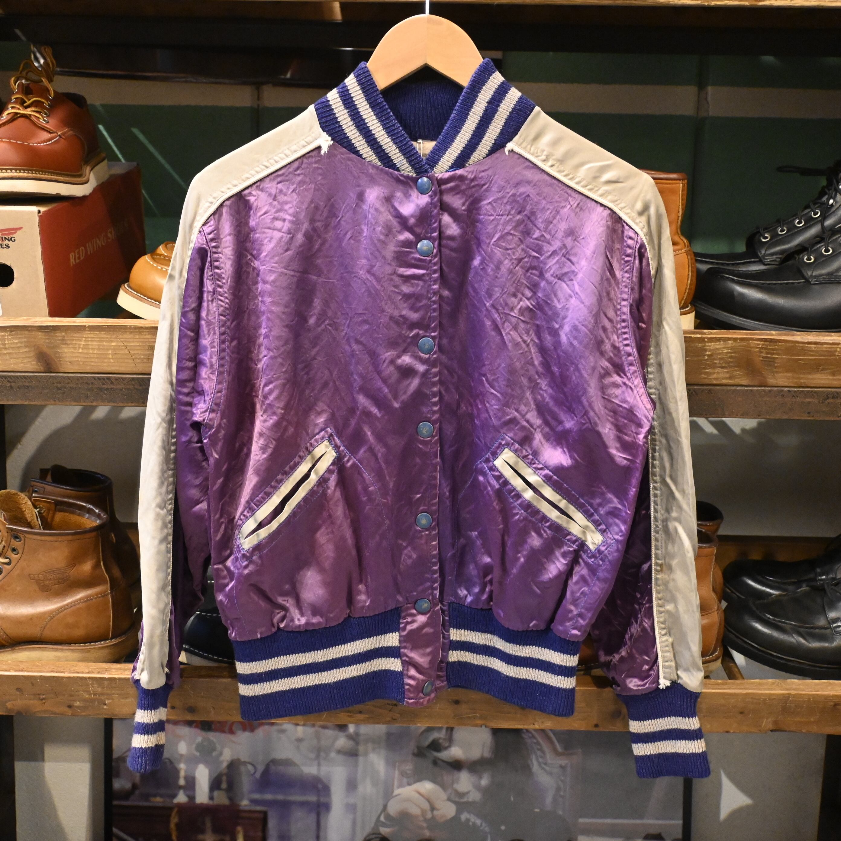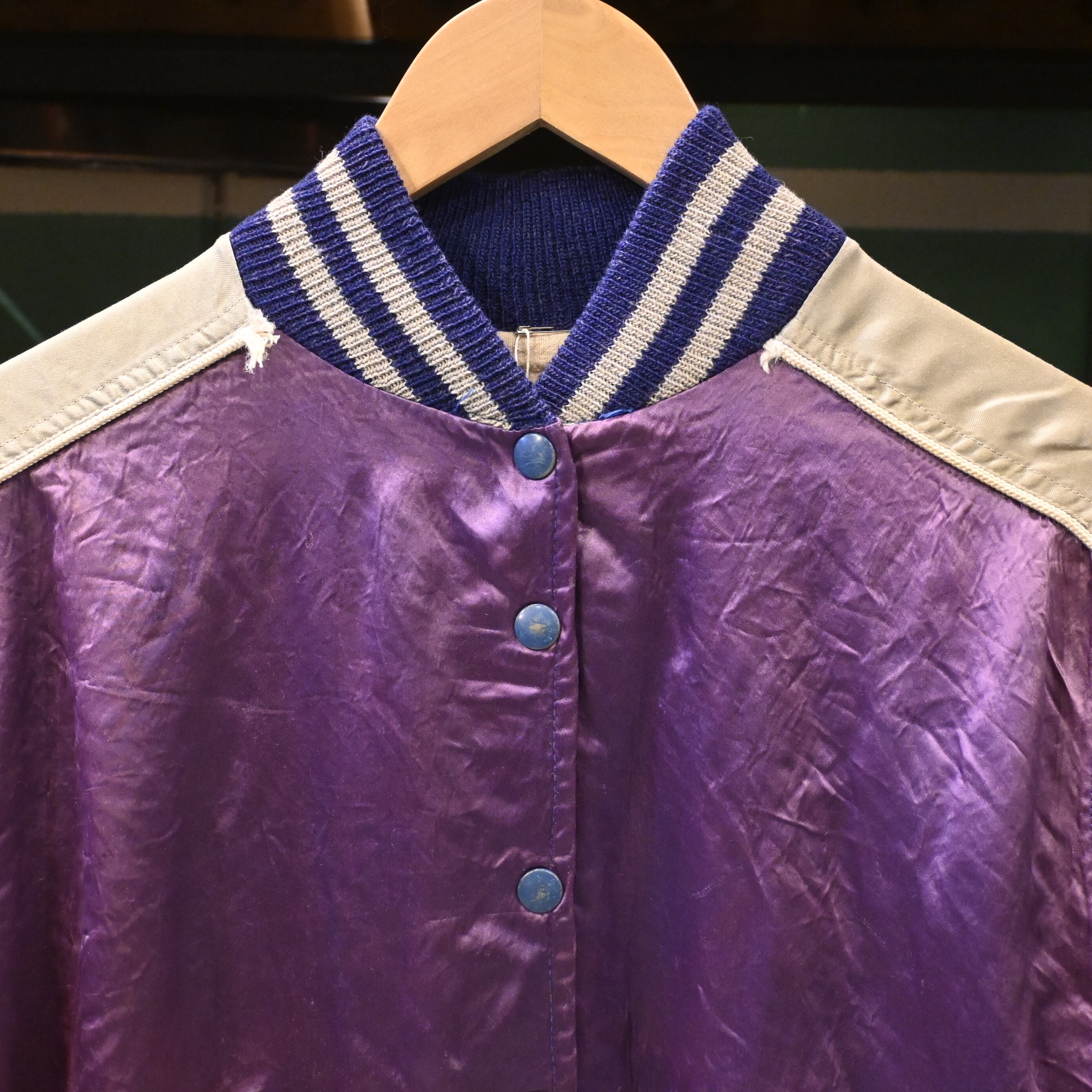 アメリカ製ヴィンテージ、60〜70年代頃のスタジアムジャケット。光沢のあるパープルサテンをベースに、ホワイトの切替しとブルーラインのリブを合わせた存在感ある一着です。
