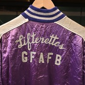 背面には「Lifterettes GFAFB」のチェーンステッチ刺繍が施されており、Grand Forks Air Force Base(グランドフォークス空軍基地)に関連するカスタムチームジャケットと考えられます。