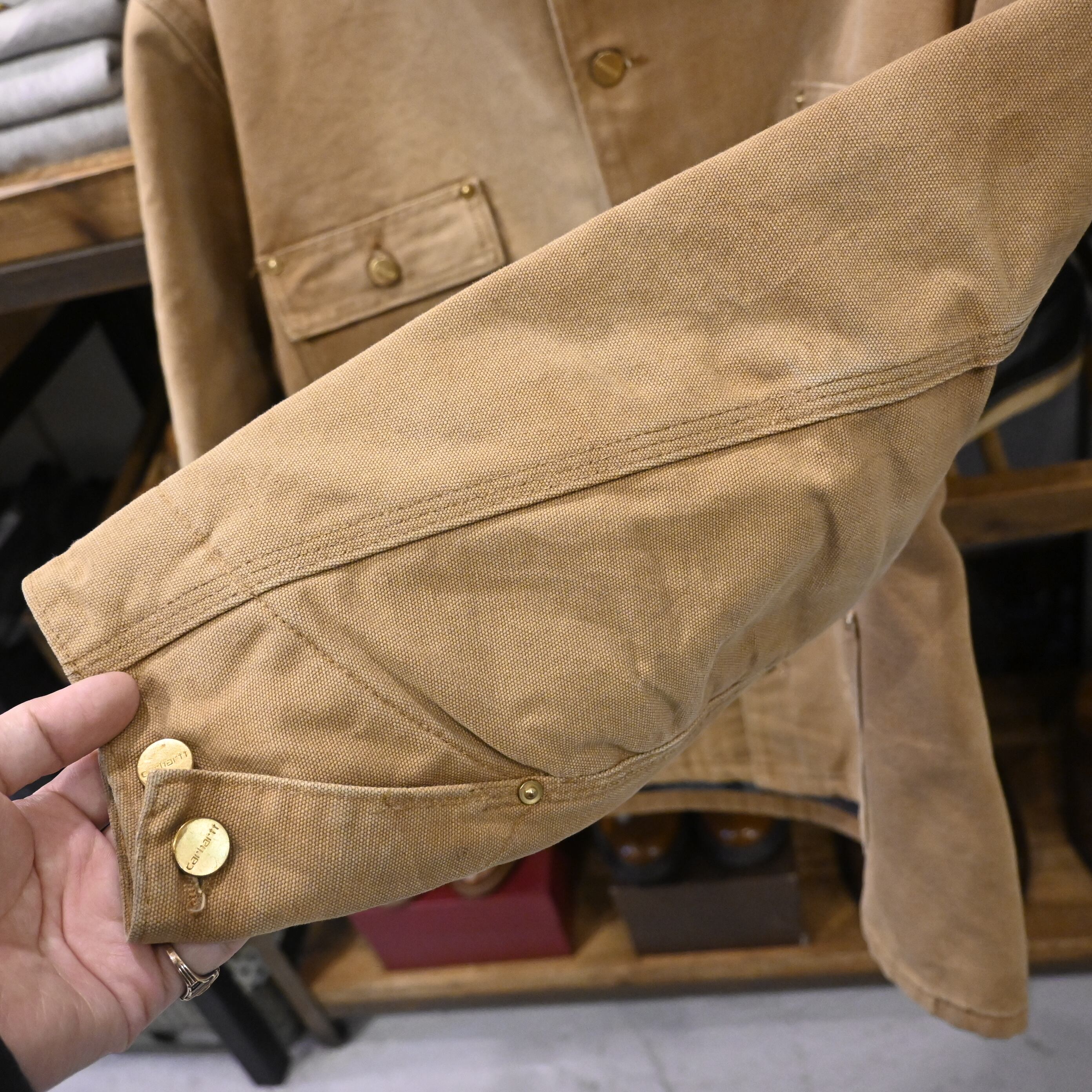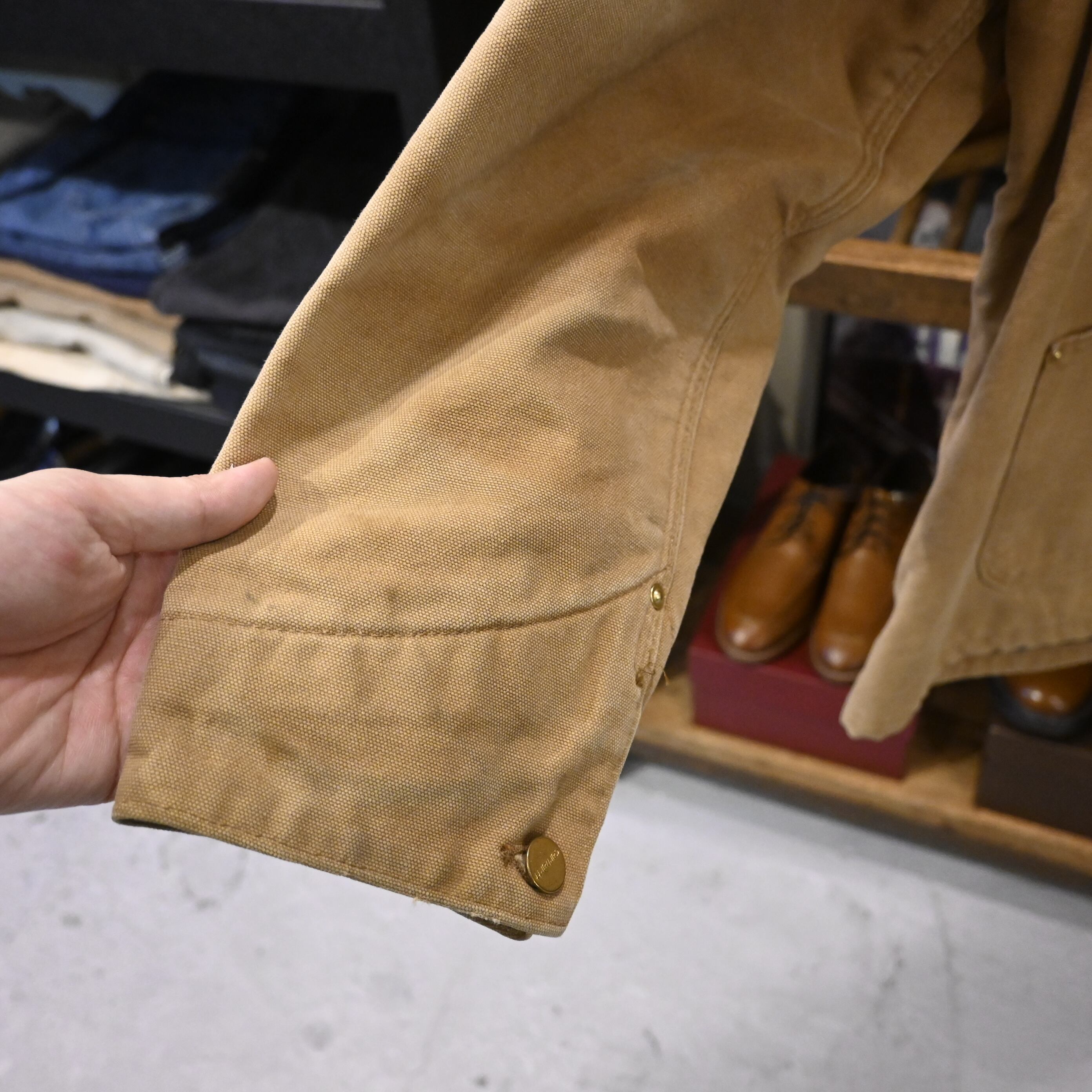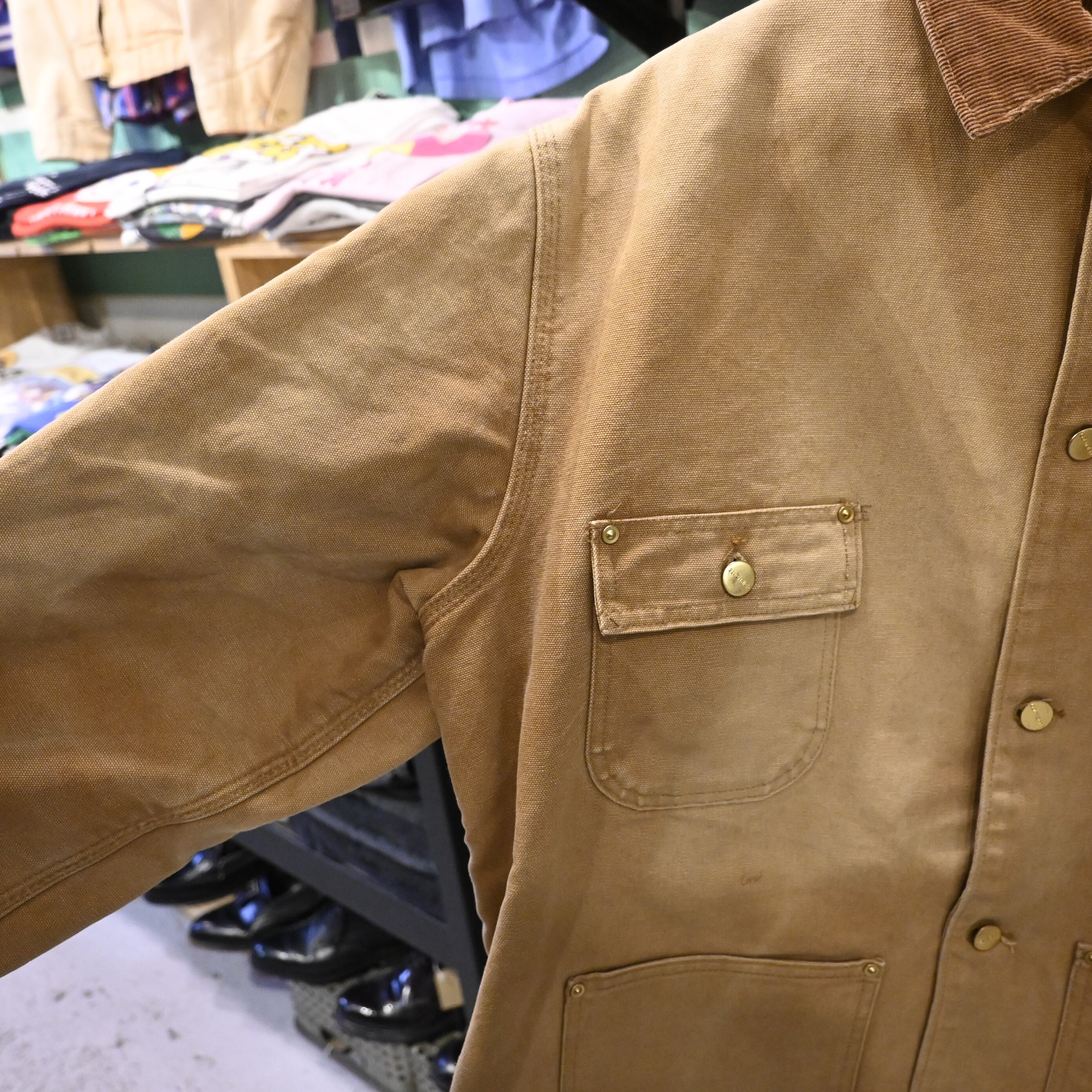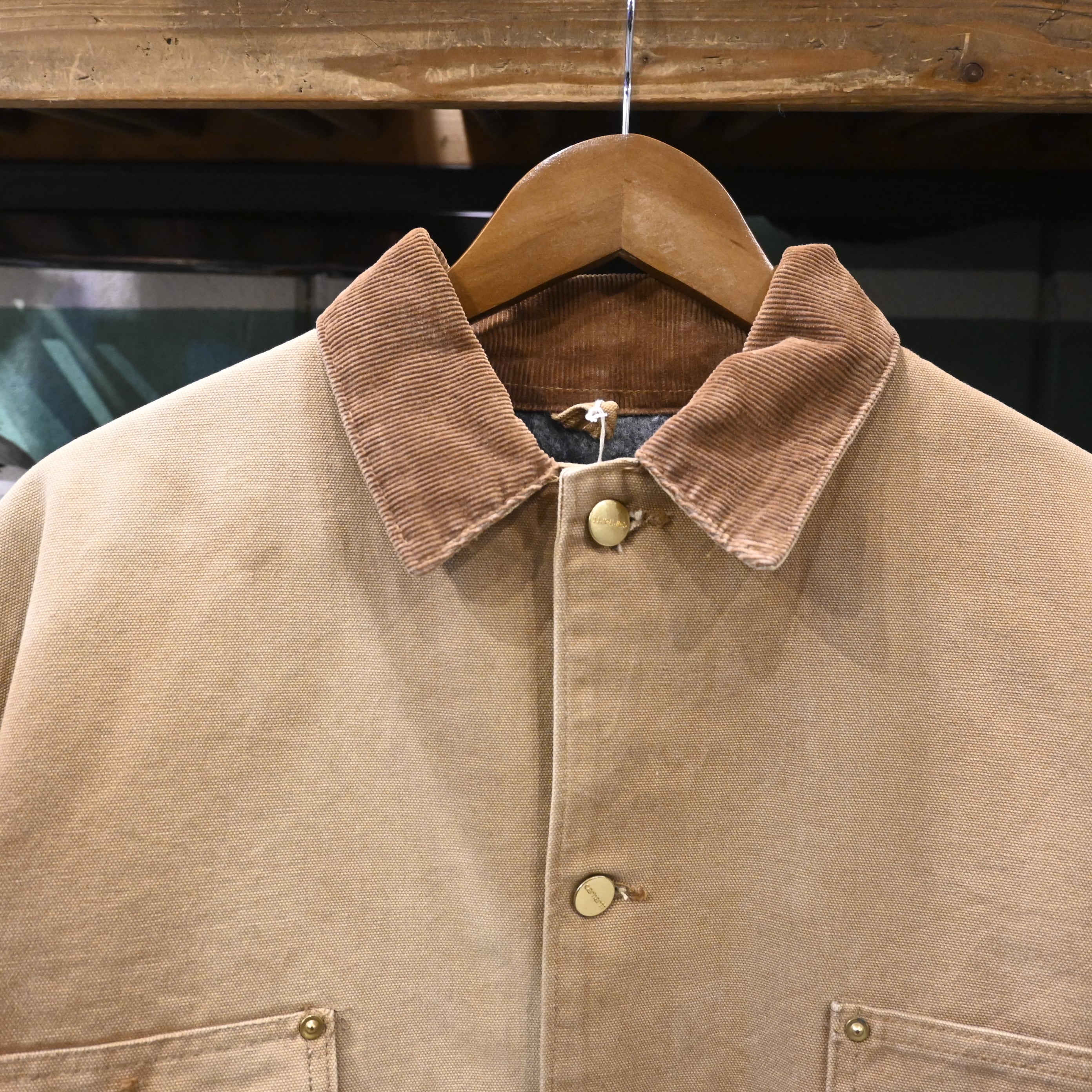 こちらは90年代USA製のオリジナルで、Carharttらしいタフなブラウンダック地にコーデュロイ襟を組み合わせた王道ディテールの一着です。