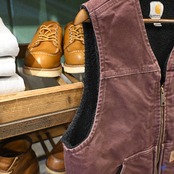 胸にはレザーパッチのCarharttロゴ、フロントは真鍮ジップを採用。ペンキ跡やフェード感が加わり、リアルなワークウェアの雰囲気が漂います。